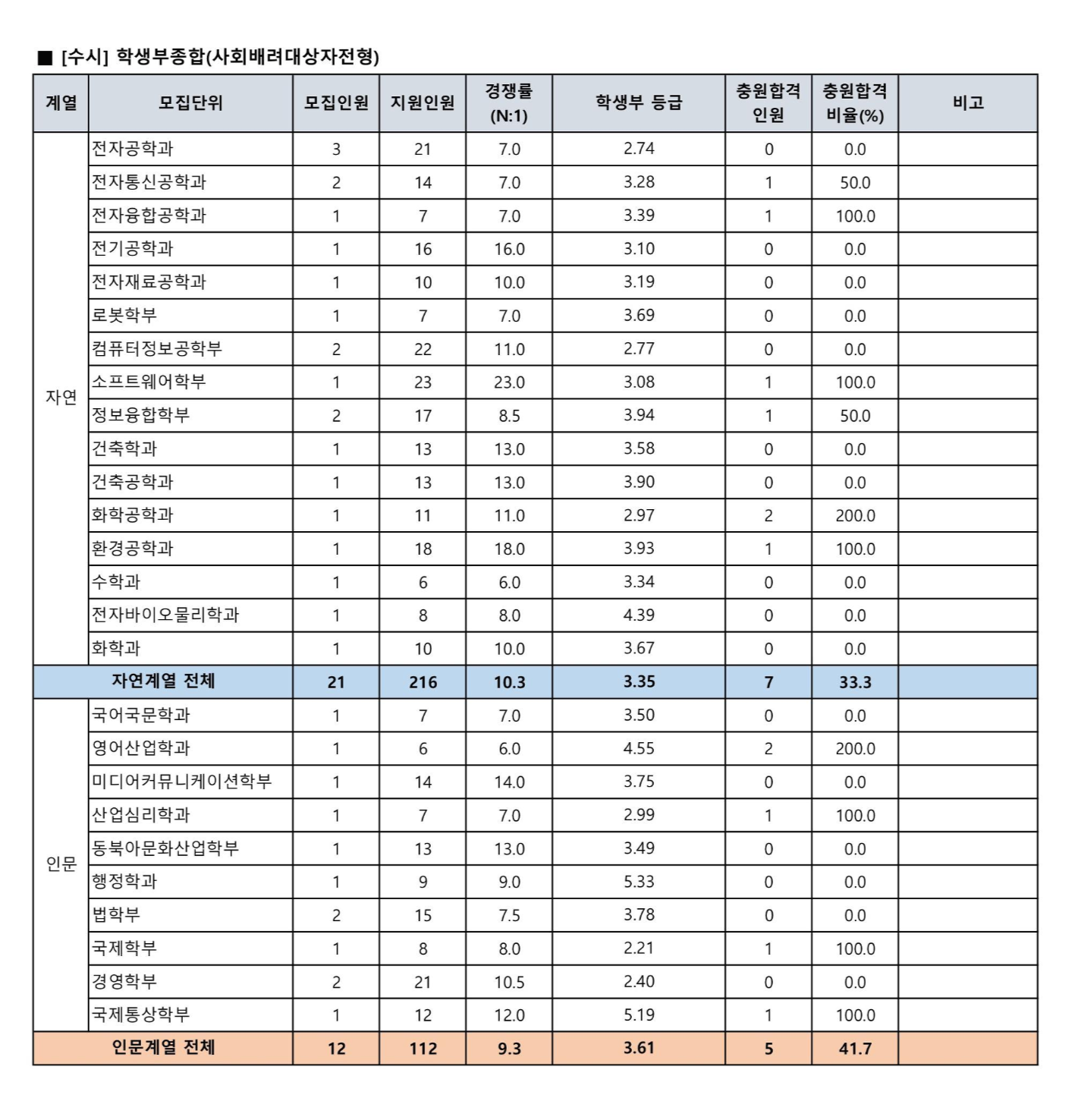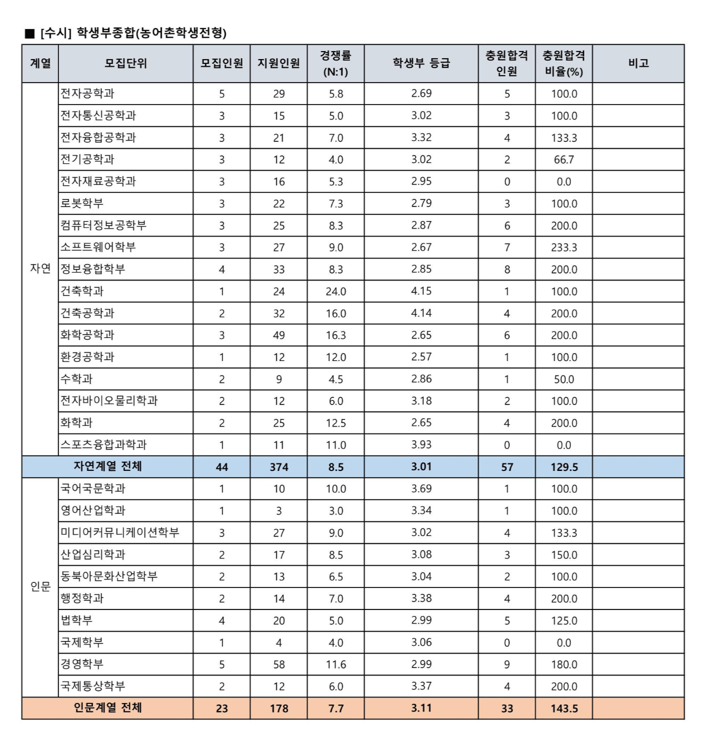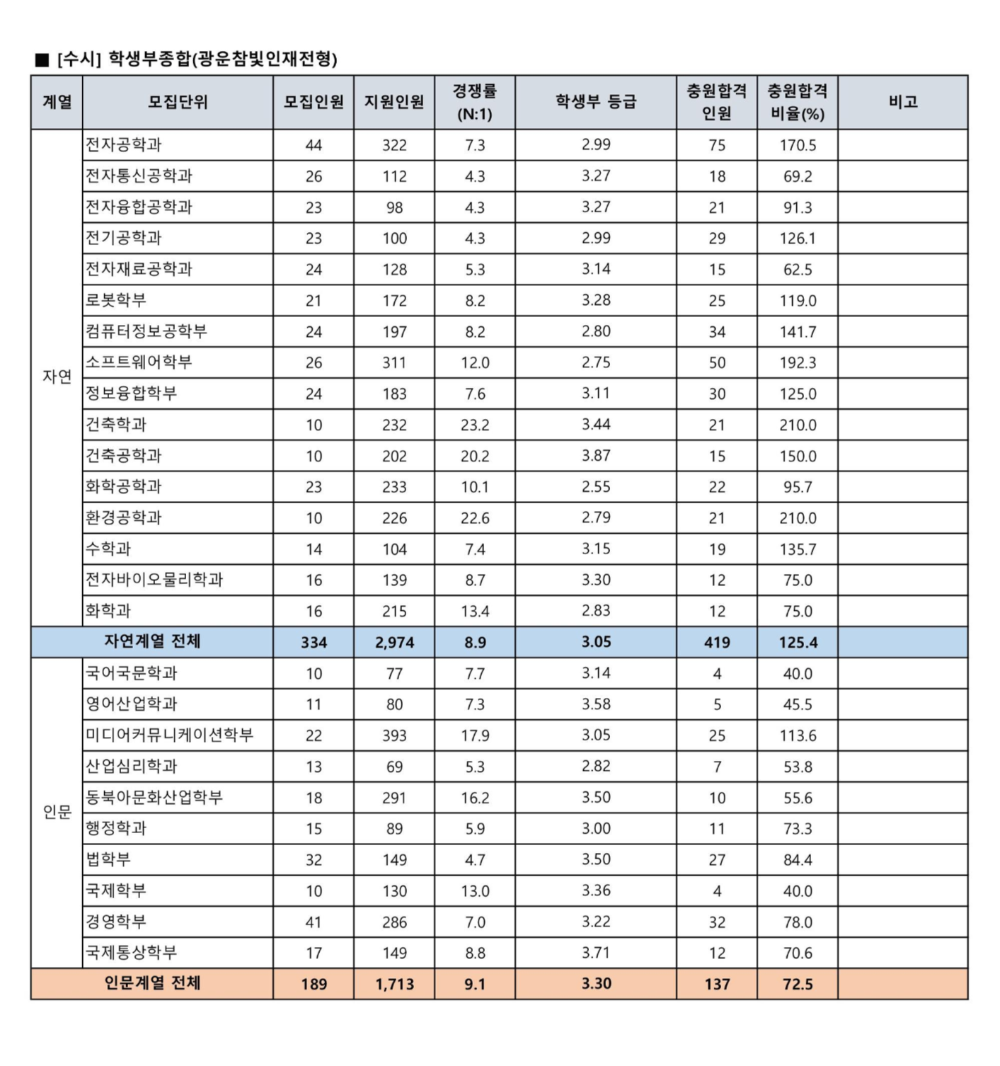 역시 광운대학교는 자연계열의 등급컷이 매우 높네영. 교과 전형인만큼 내신 등급이 높은 건데영, 충원율 역시 300%로 높은 편입니다.