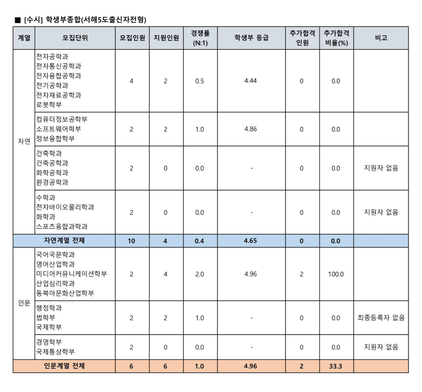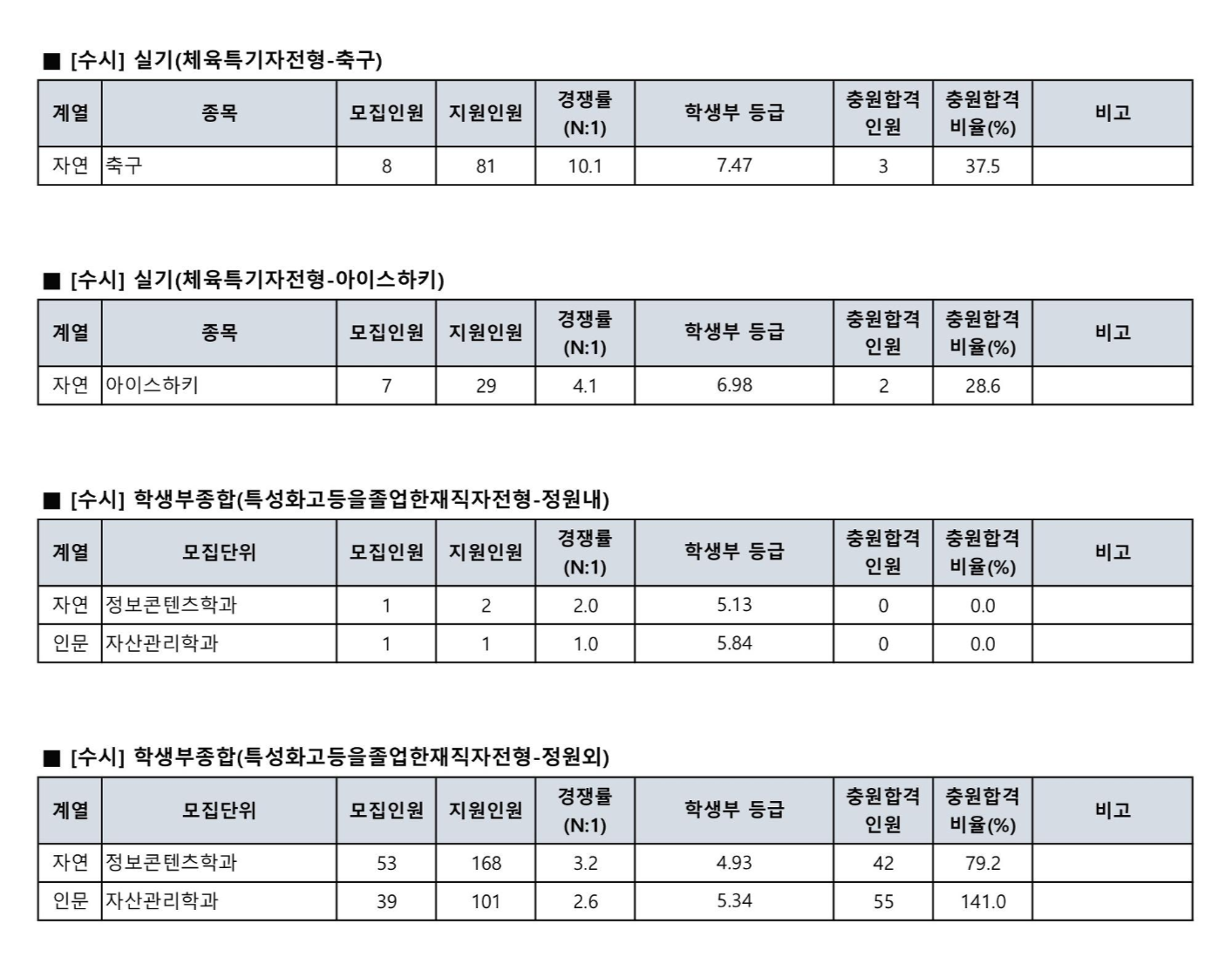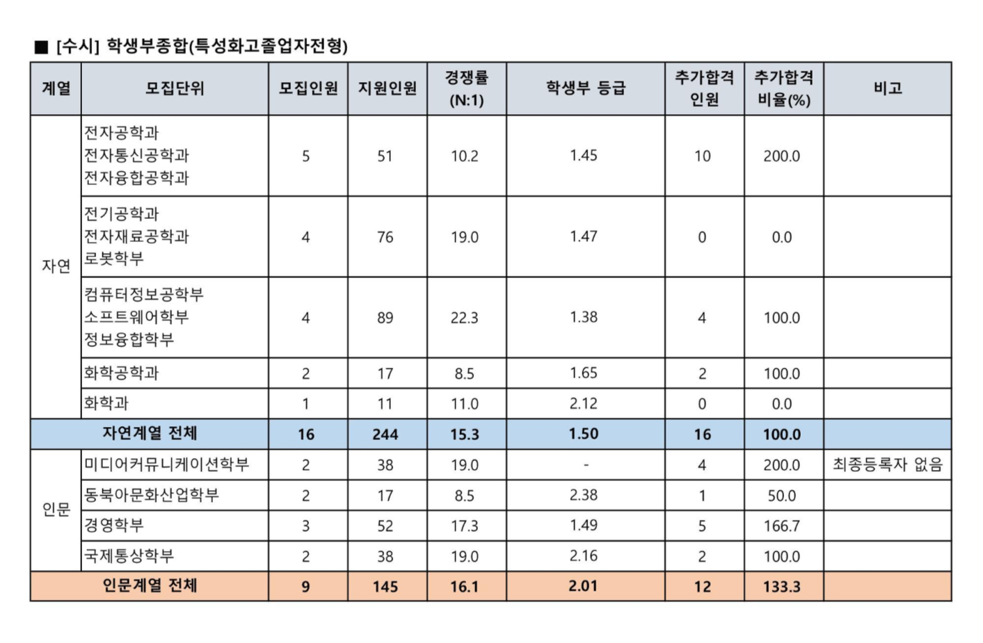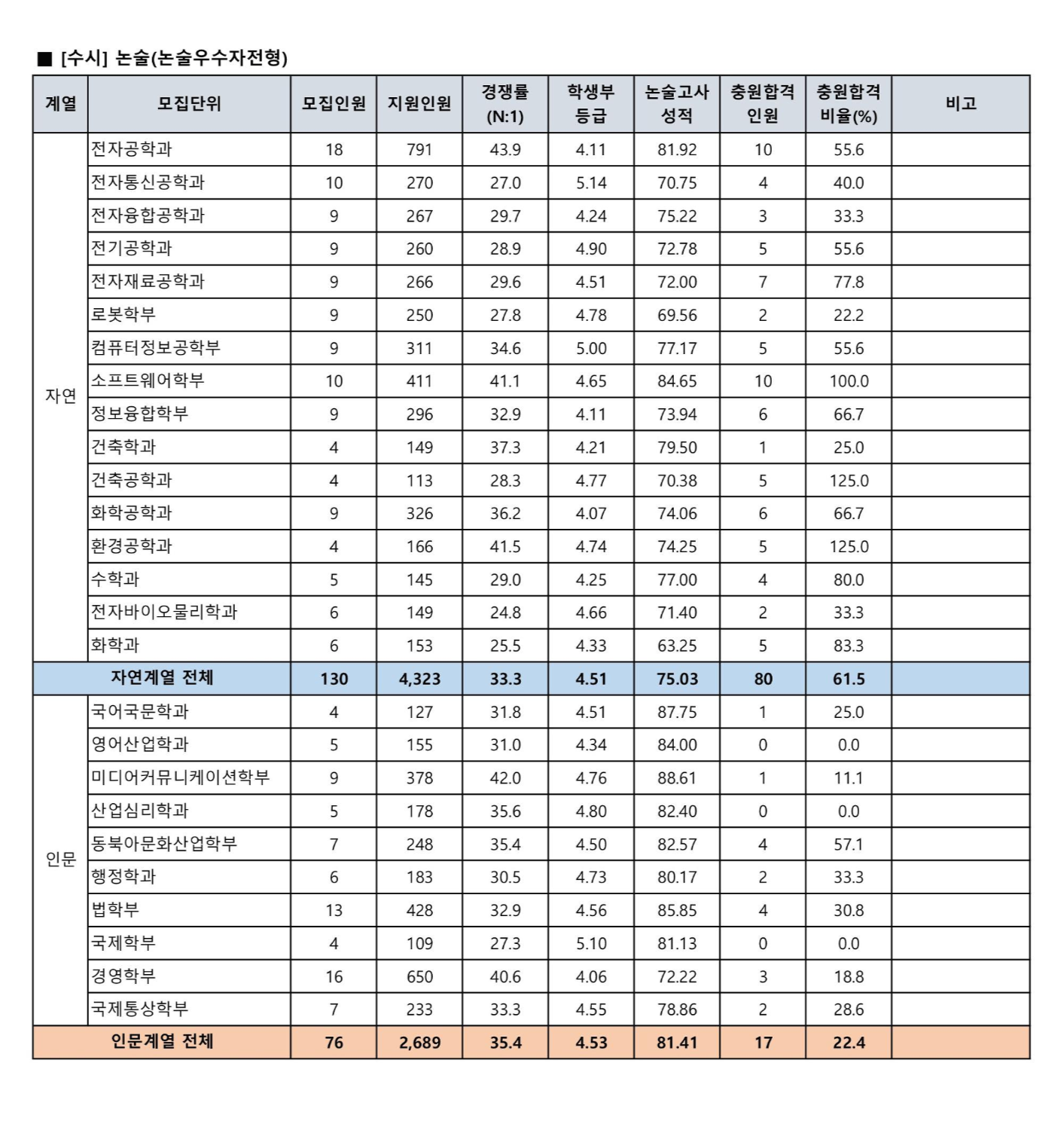 역시 광운대학교는 자연계열의 등급컷이 매우 높네영. 교과 전형인만큼 내신 등급이 높은 건데영, 충원율 역시 300%로 높은 편입니다.