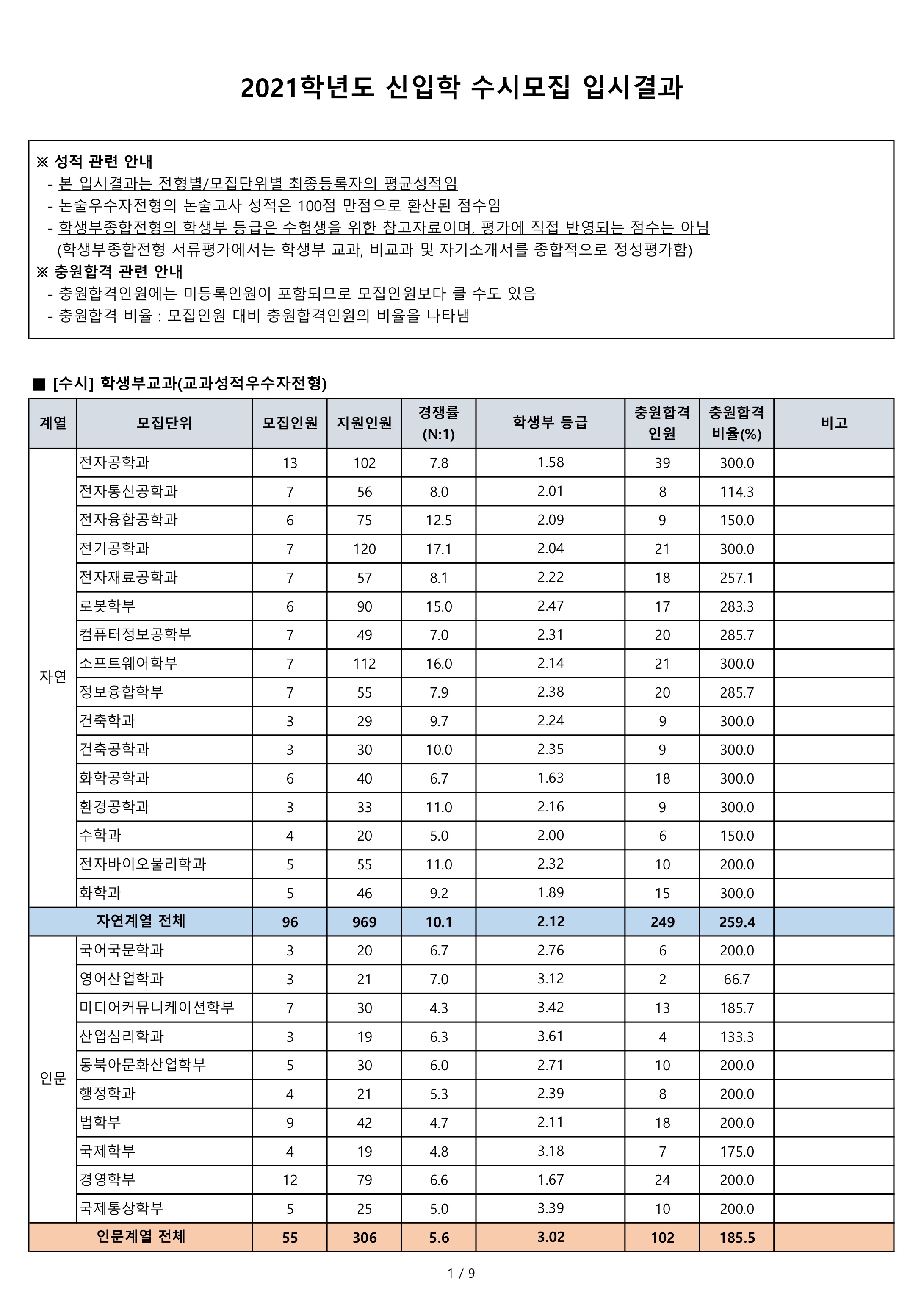 2021학년도 광운대학교 학생부교과 전형 수시등급