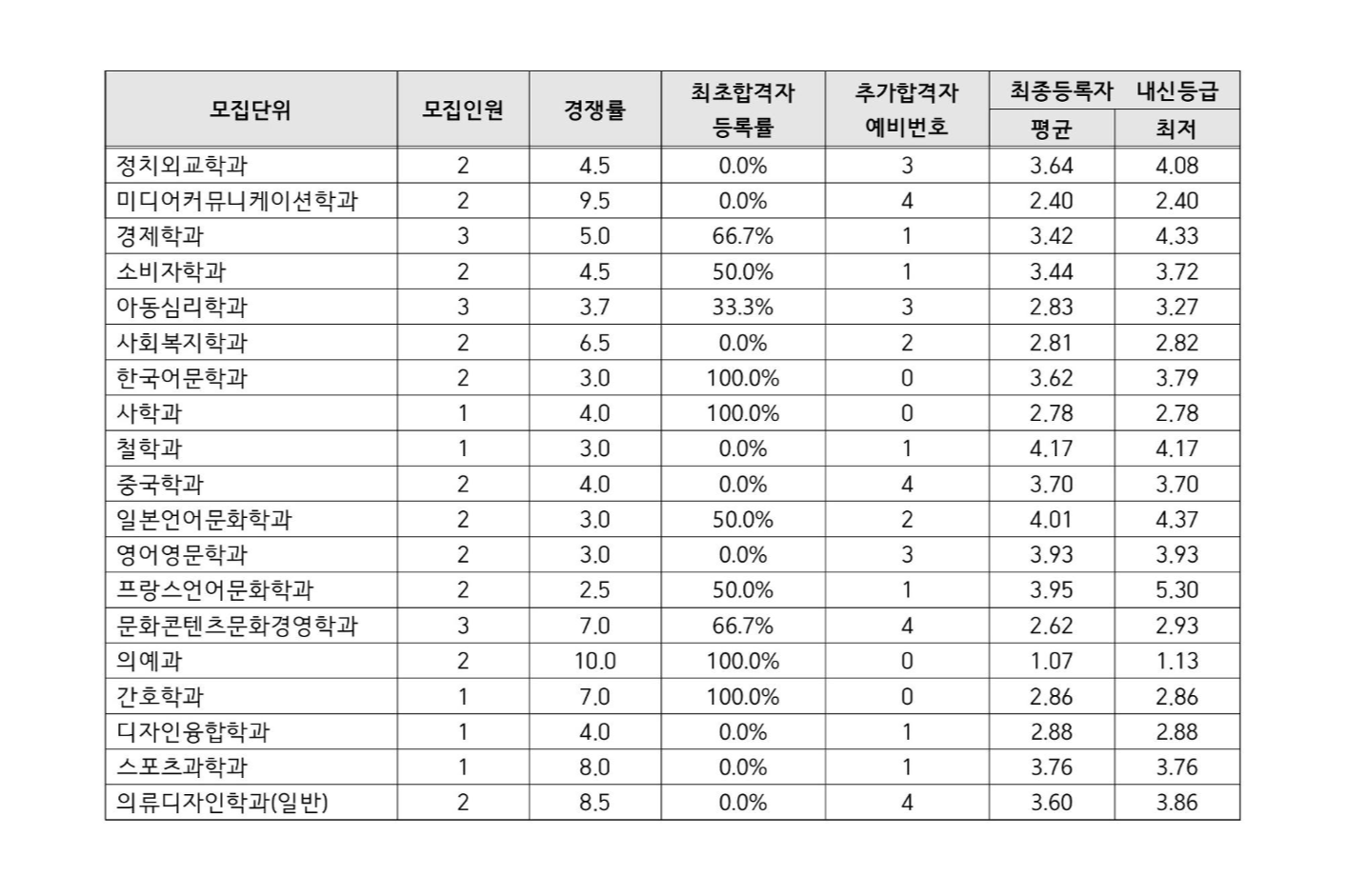 최종등록자 평균 내신 등급: 2등급 초반~3등급 초반