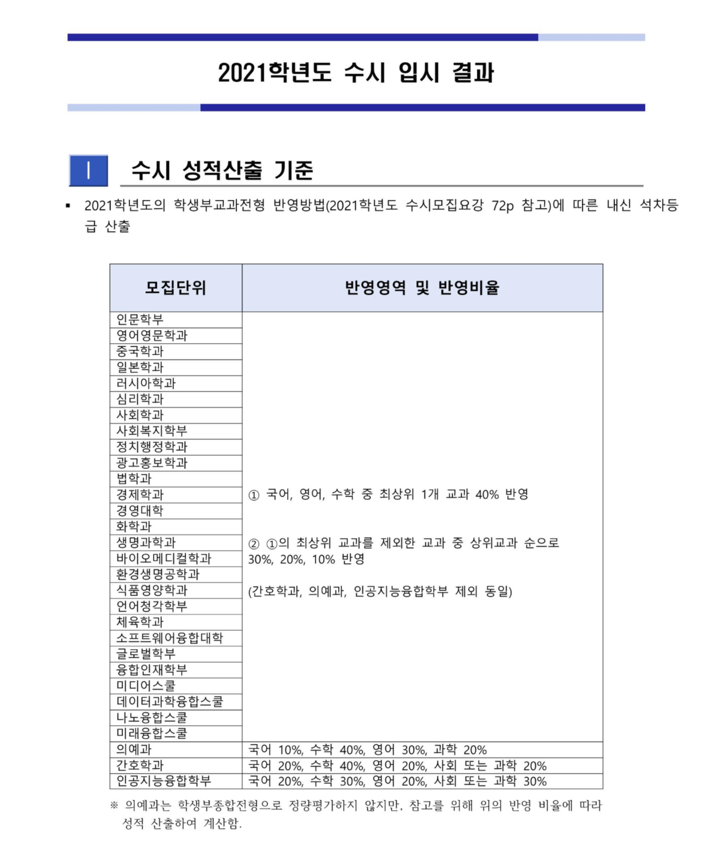 2021학년도 한림대학교 수시 성적산출 기준 한림대학교에서는 대부분의 과에서 수시 등급에 전과목을 반영하는 것이 아니라, 국어 영어 수학 중 최상위 1개 교과를 40% 반영한 뒤에, 이 아이를 제외한 교과 중 상위교과 순으로 30%, 20%, 10%를 반영해영. 의예과, 간호학과, 인공지능융합학부는 국어 수학 영어 과학 중에 과별로 정해진 비율이 있고영. 그러니 다른 학교에 비해서 내신 등급이 높게 산출되겠지영? 이 점을 참고해서 수시 등급을 확인합시다.