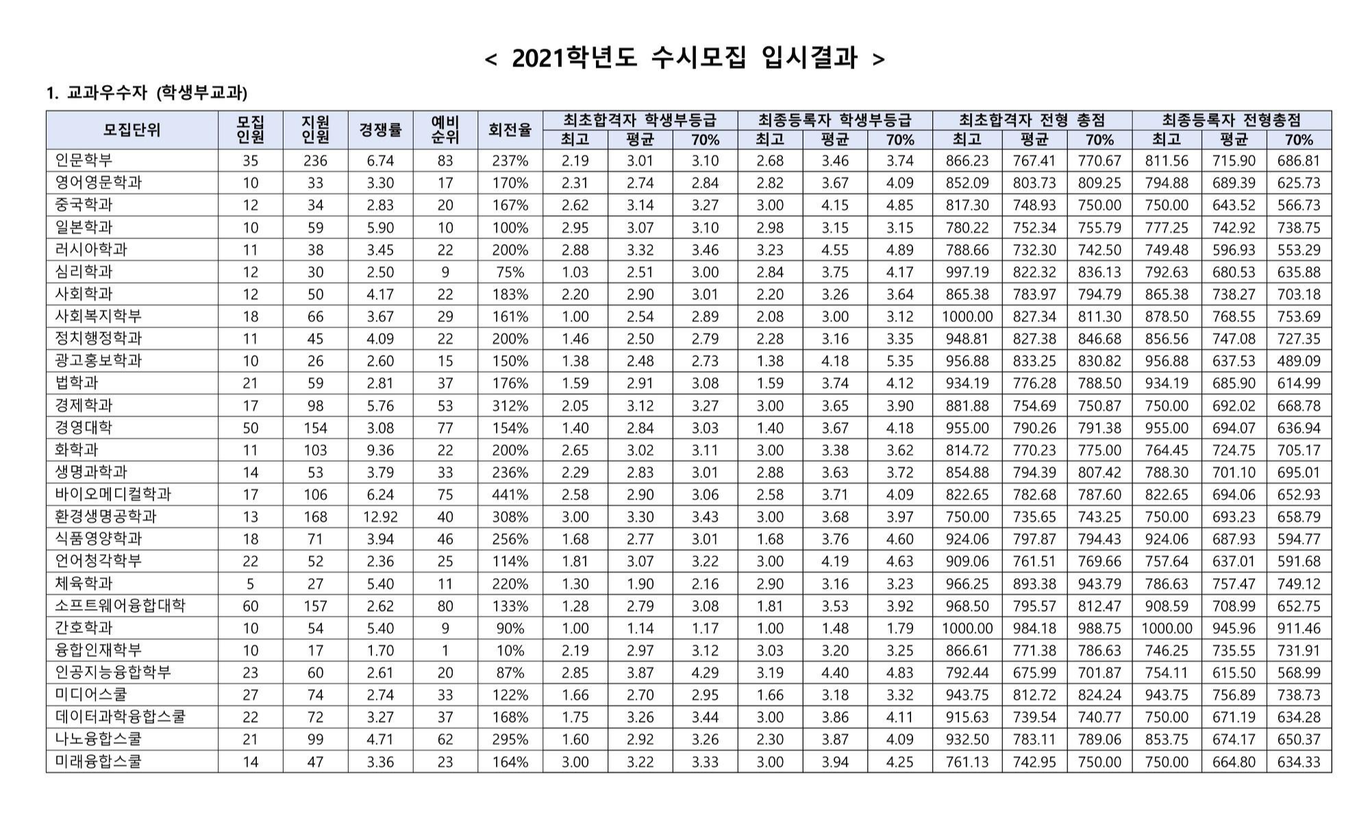 2021학년도 한림대학교 교과우수자(학생부교과) 수시등급 한림대학교 교과우수자 최초합격자
