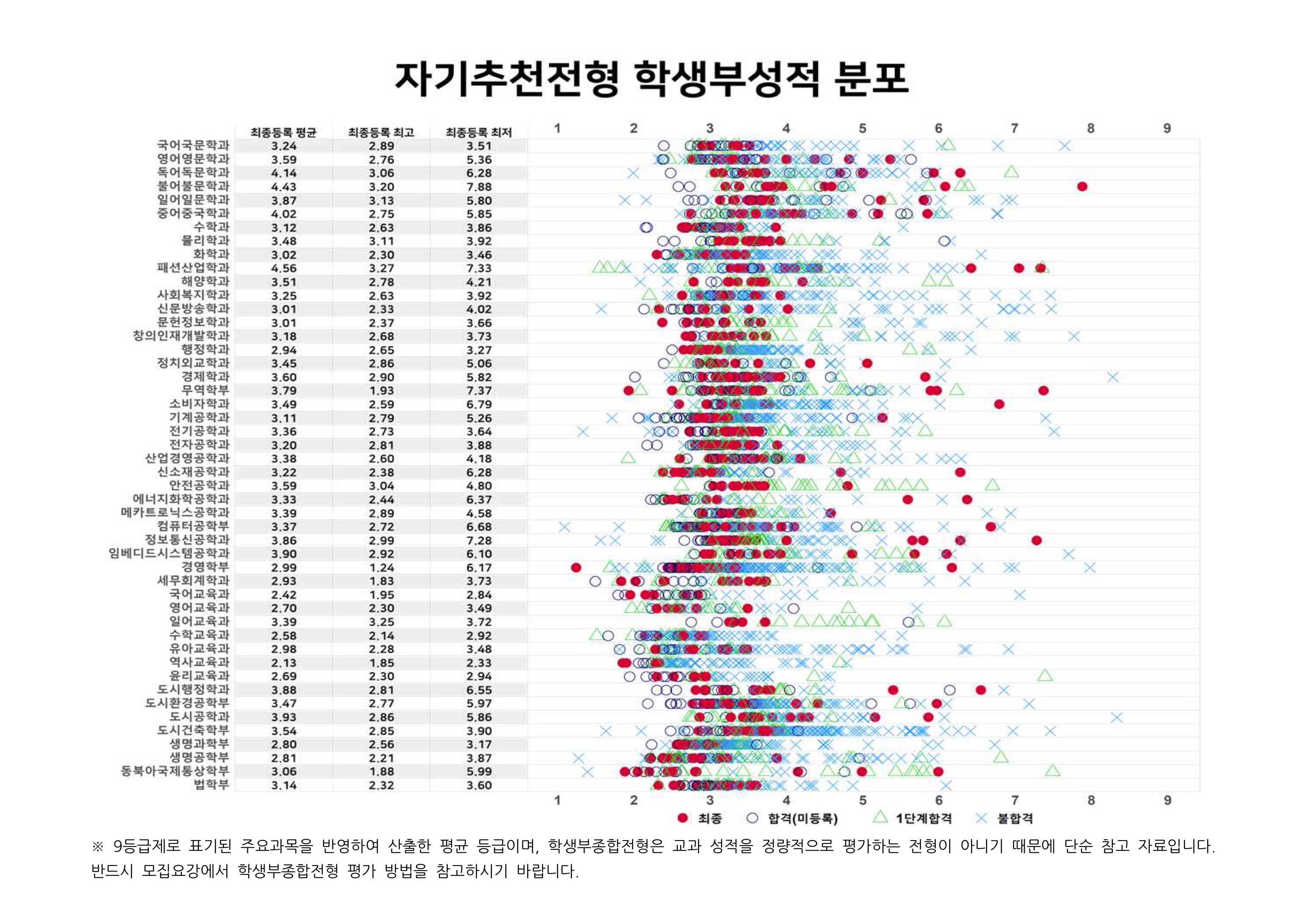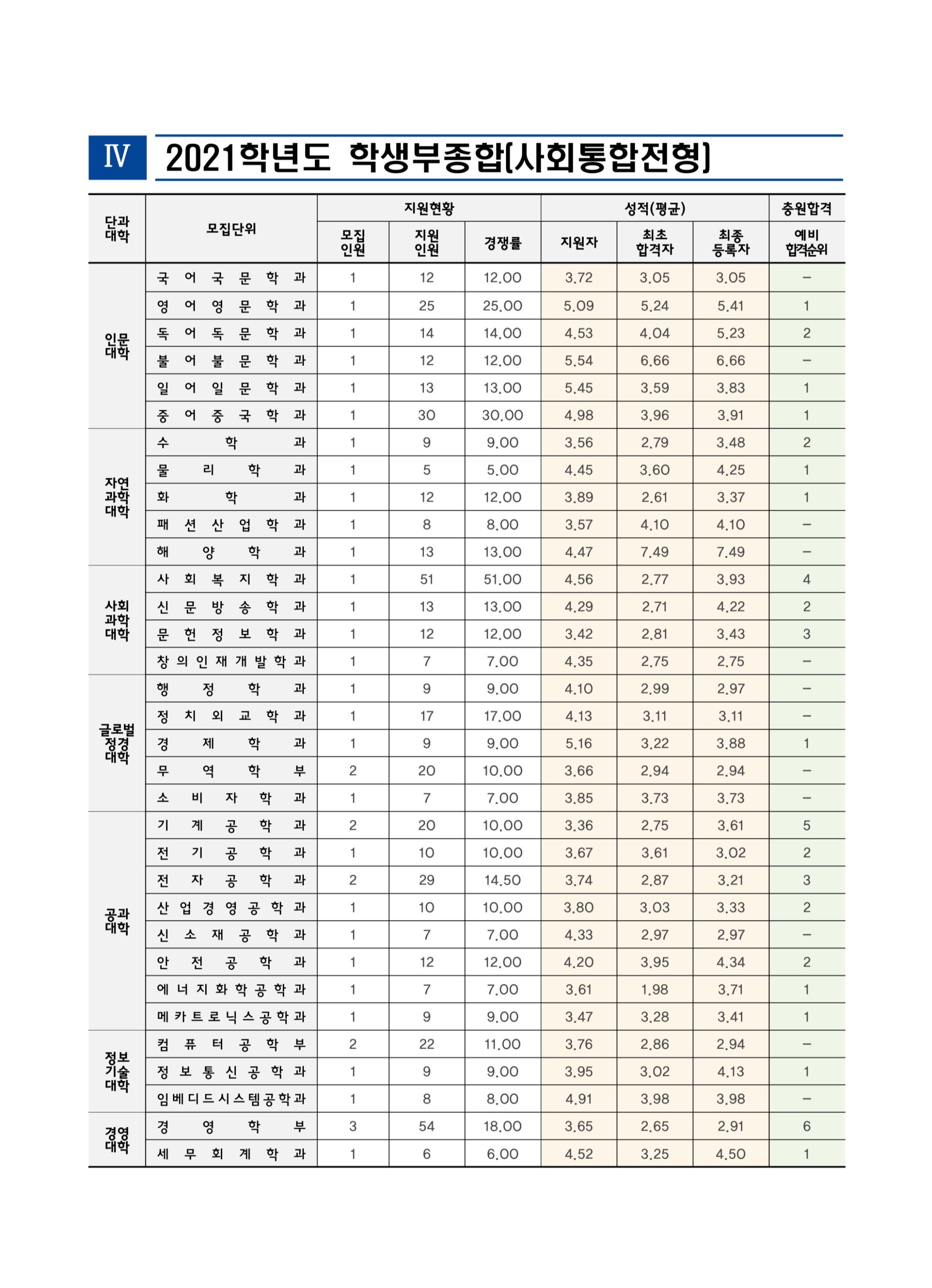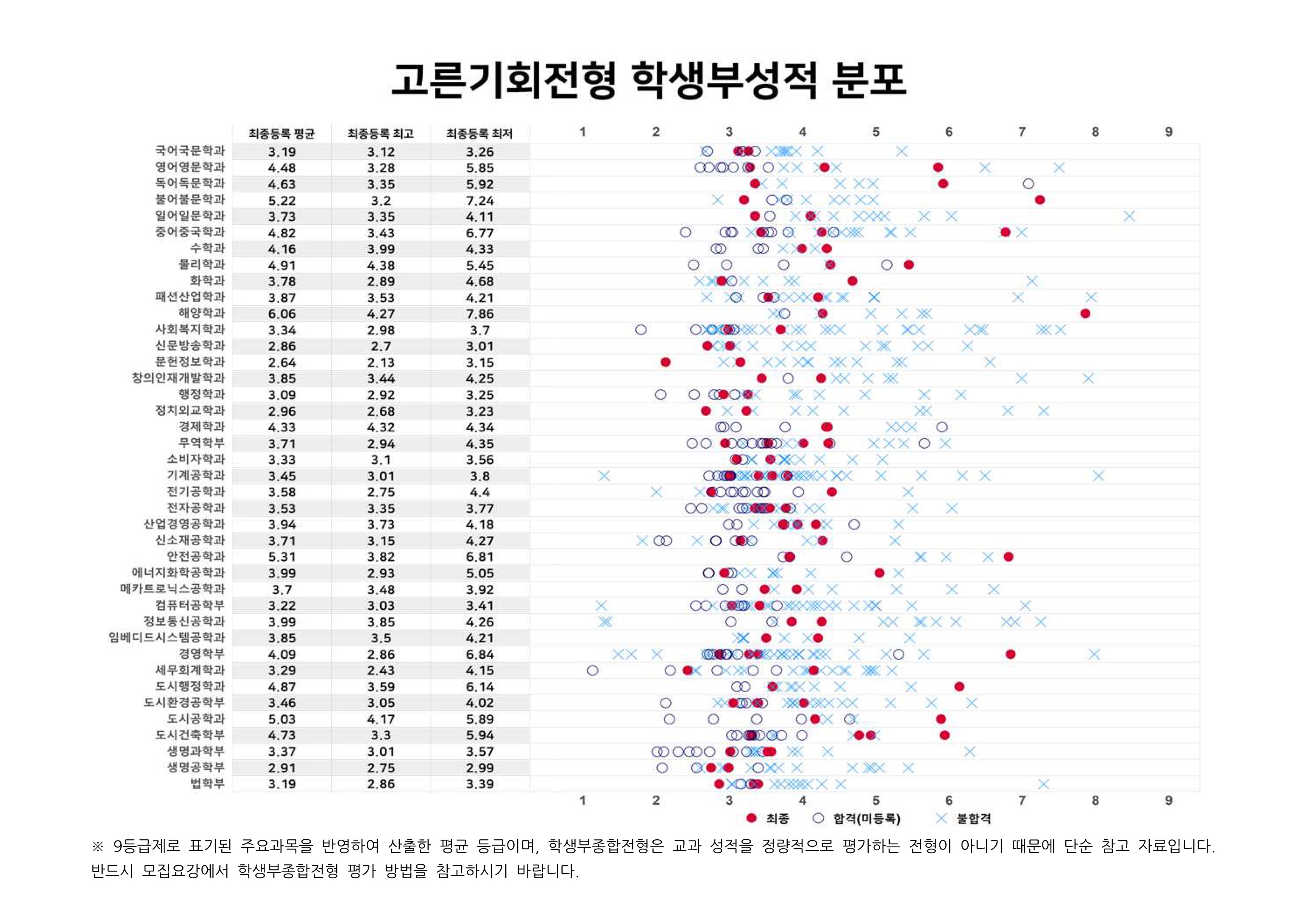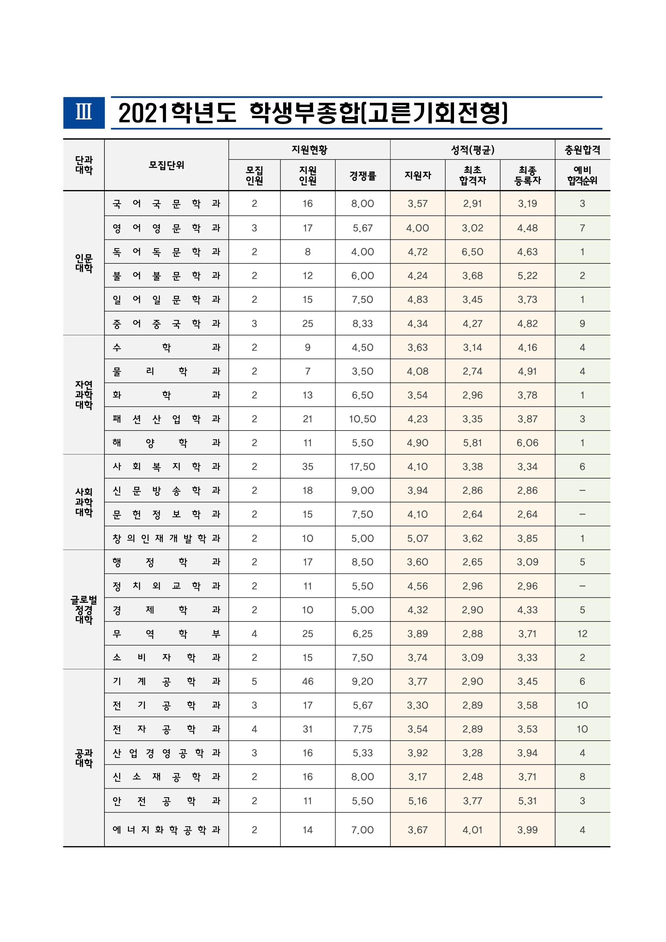 1. 전형 : 학생부교과(교과성적우수자전형), 학생부종합(자기추천전형), 학생부종합(고른기회전형), 학생부종합(사회통합전형), 실기/실적(실기우수자전형), 실기/실적(특기자전형)
