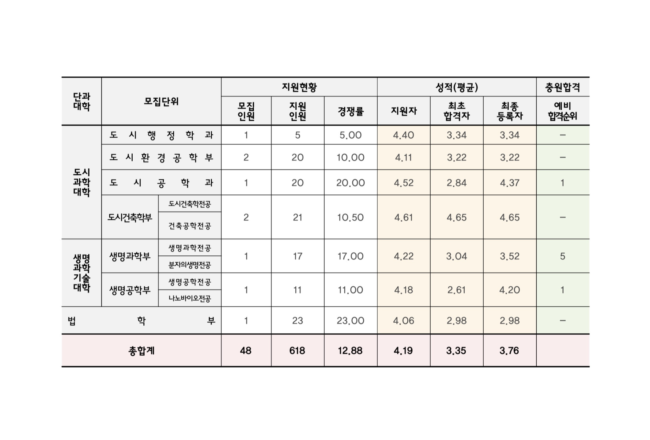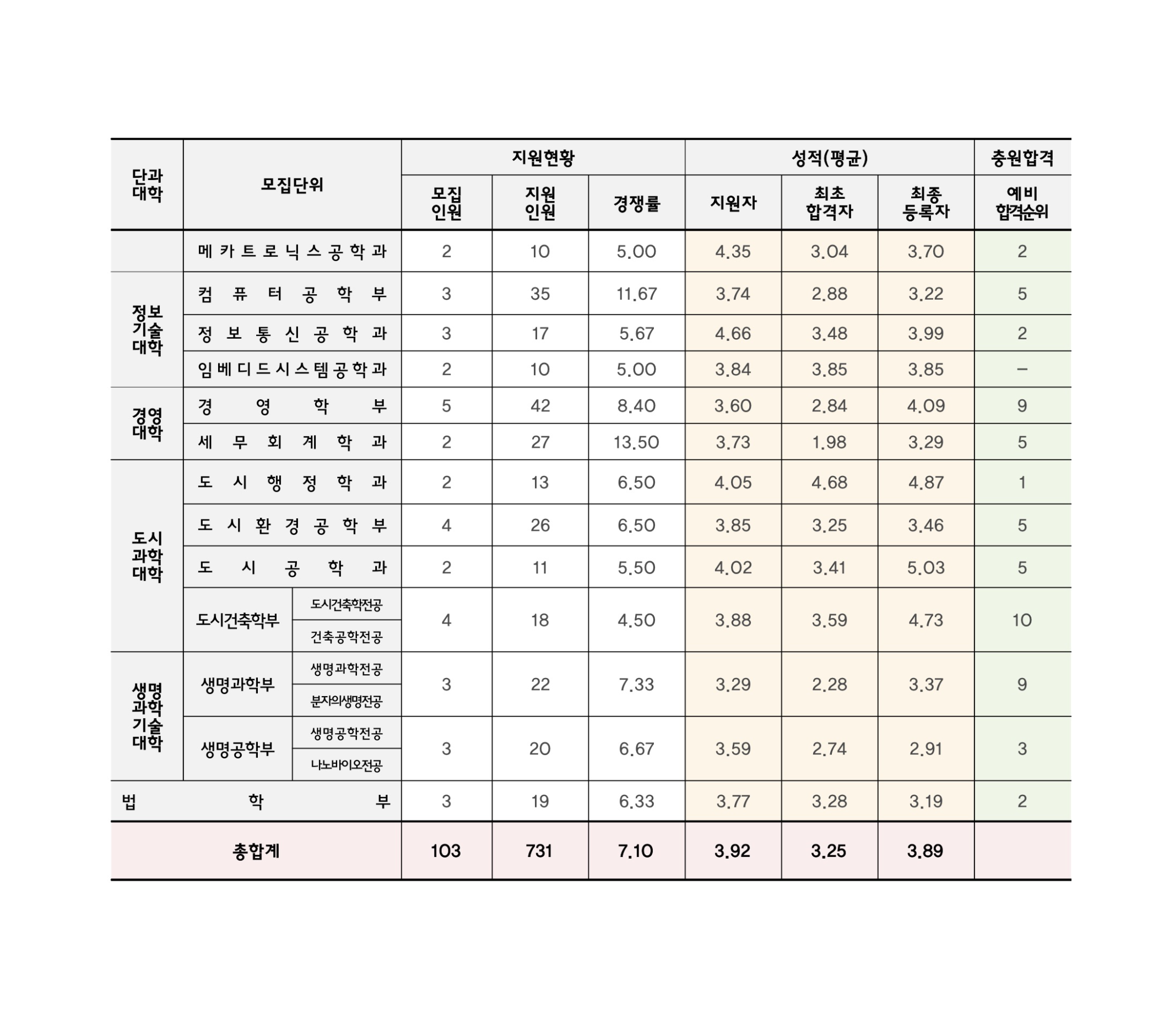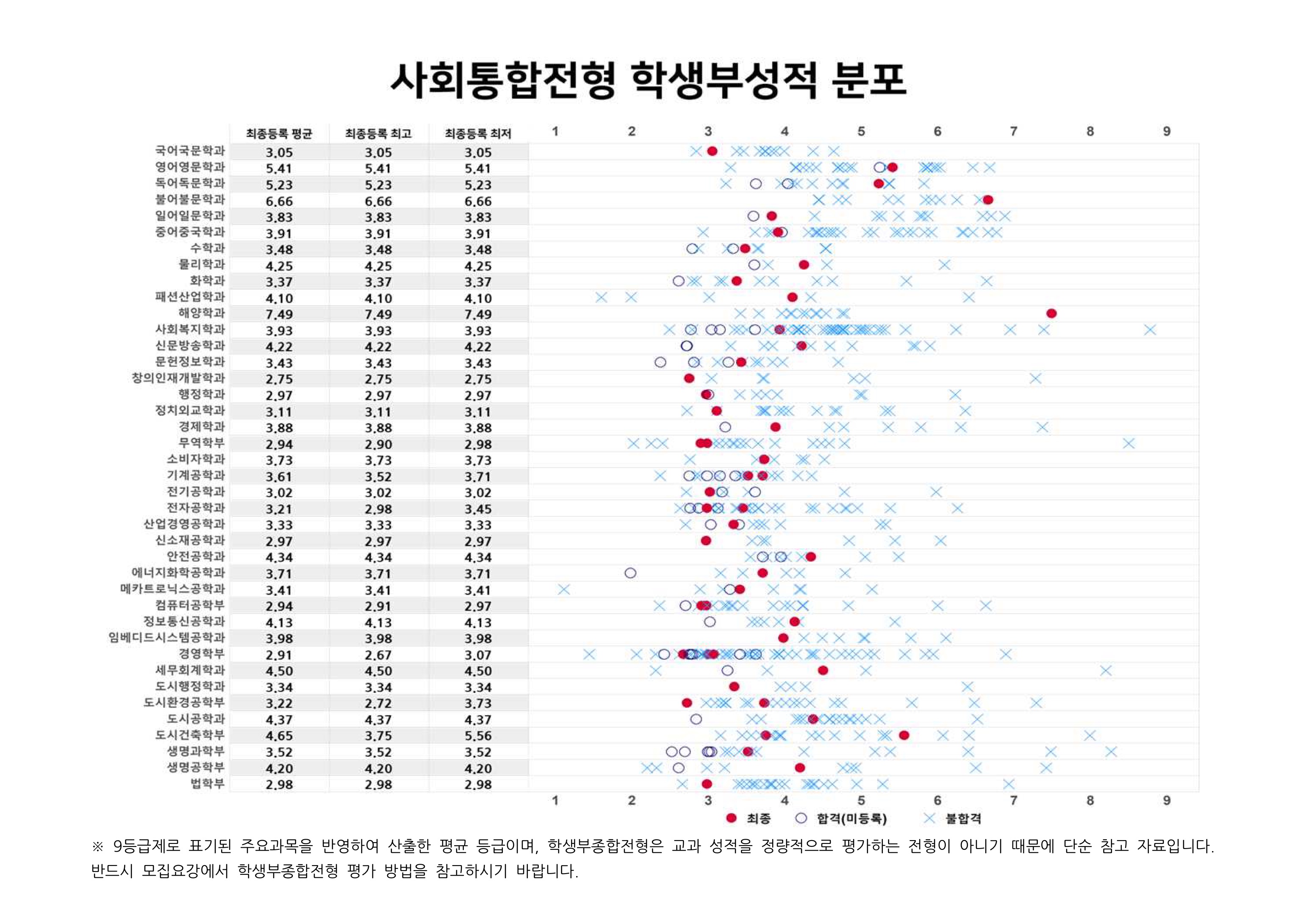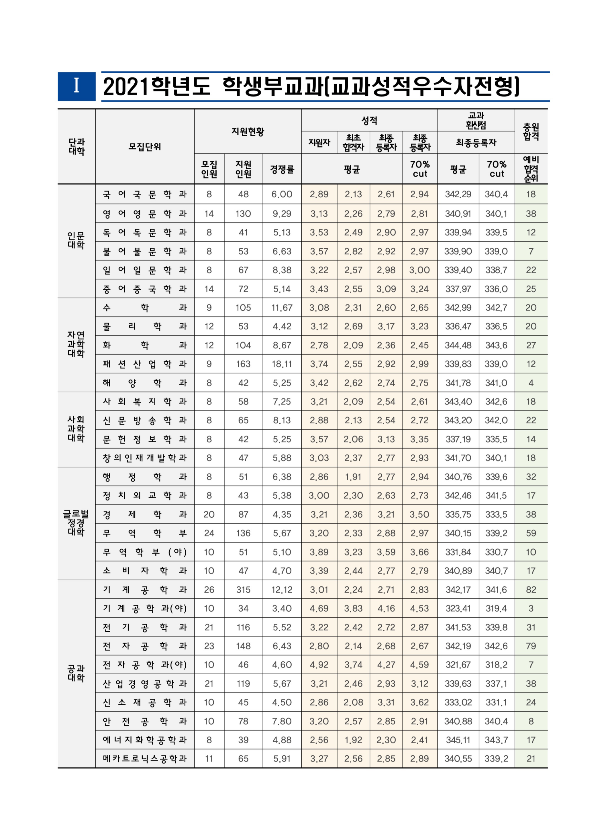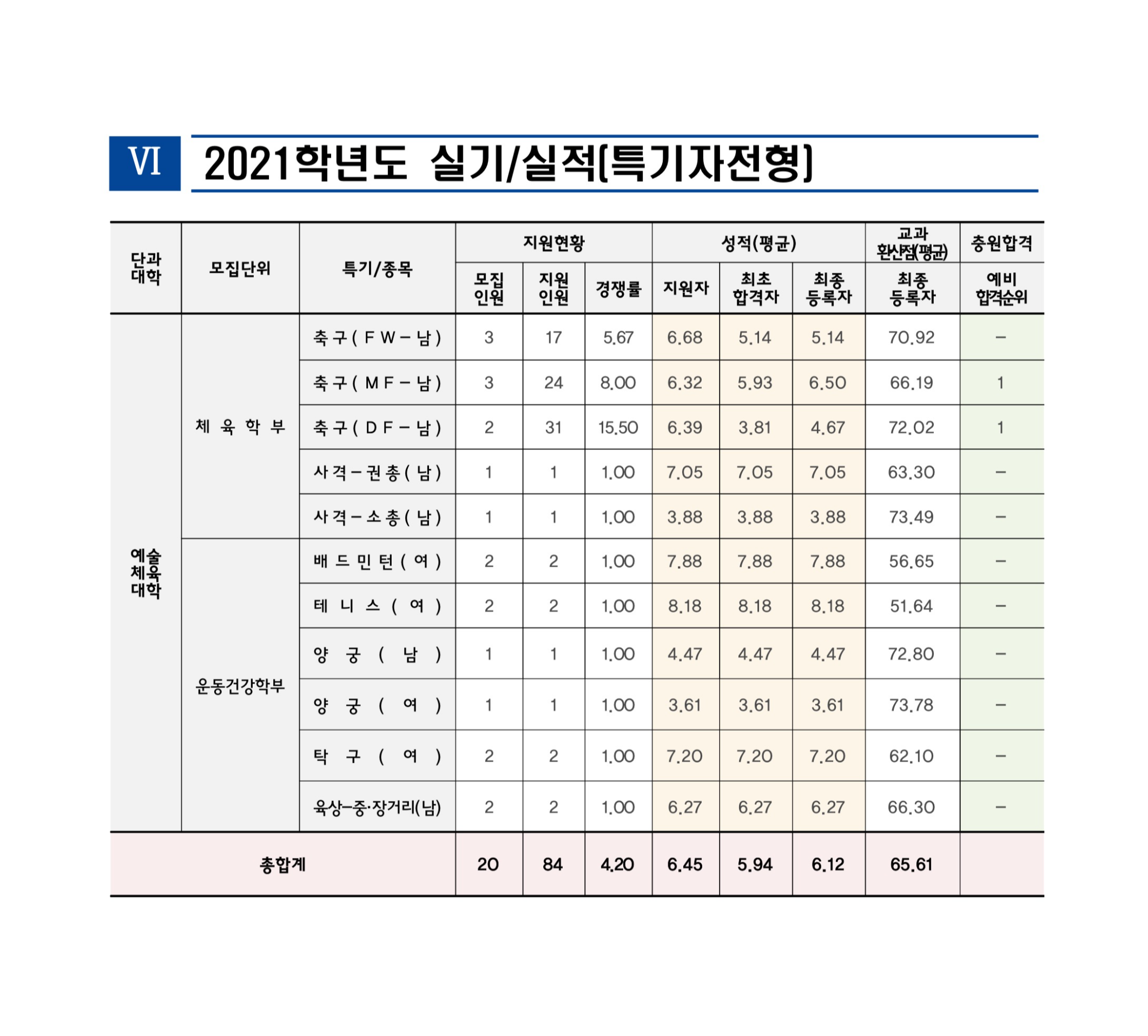 1. 전형 : 학생부교과(교과성적우수자전형), 학생부종합(자기추천전형), 학생부종합(고른기회전형), 학생부종합(사회통합전형), 실기/실적(실기우수자전형), 실기/실적(특기자전형)
