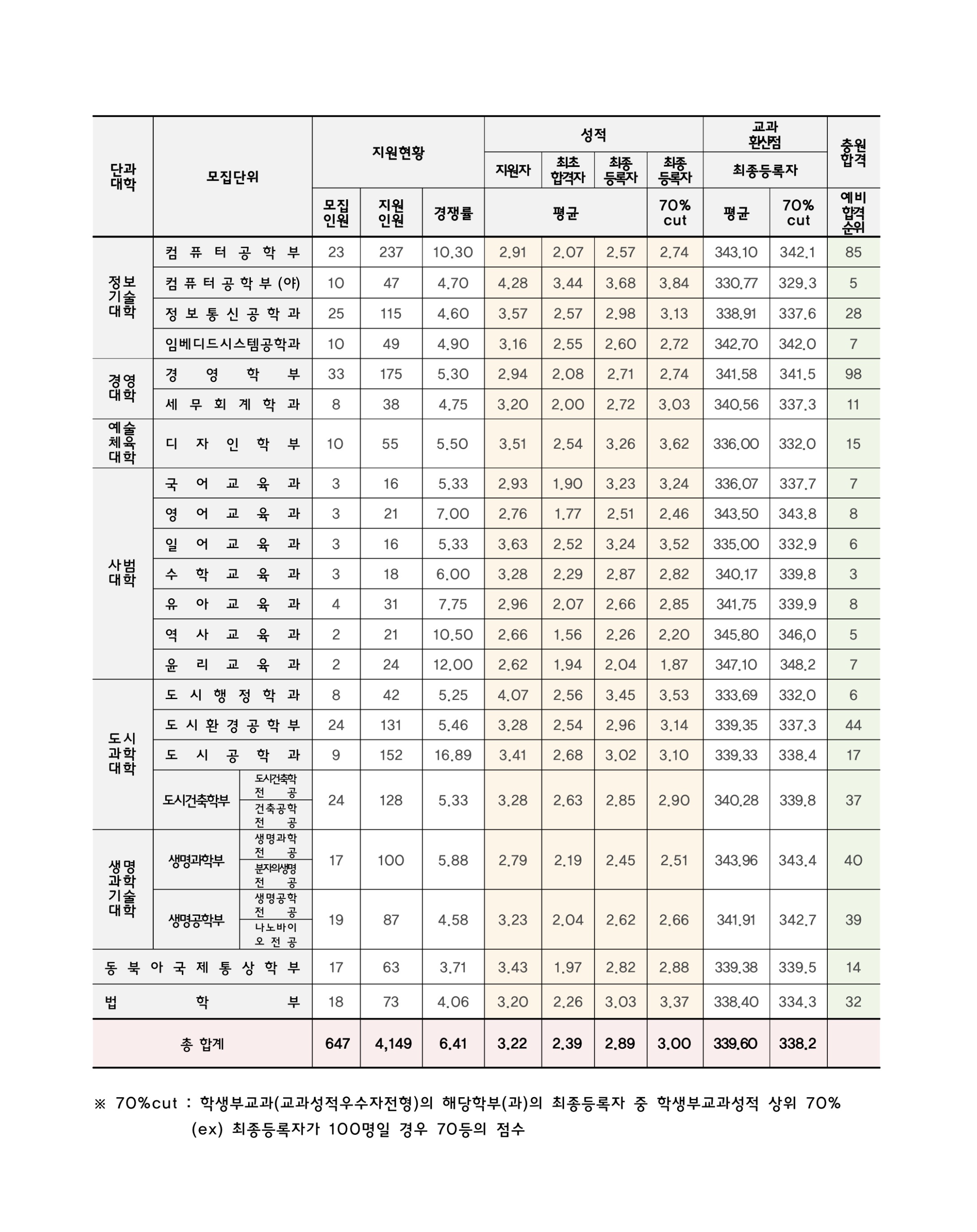 단, 수험생들에게 정보공개 편의상, 교과전형방법으로 성적을 산출(산술평균 등급으로 산출)하였으니 이점 유의하시기 바랍니다.