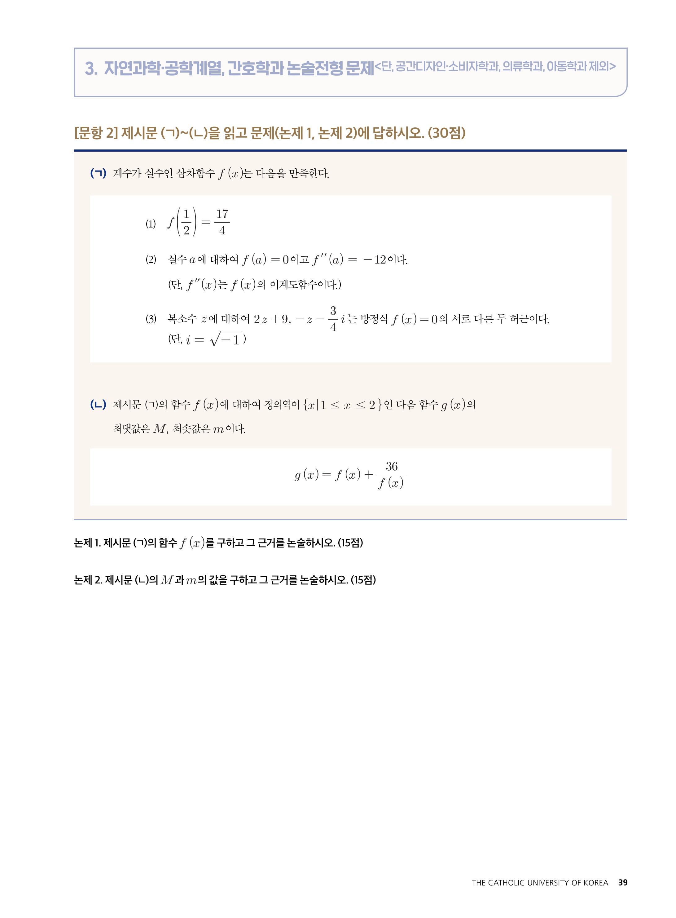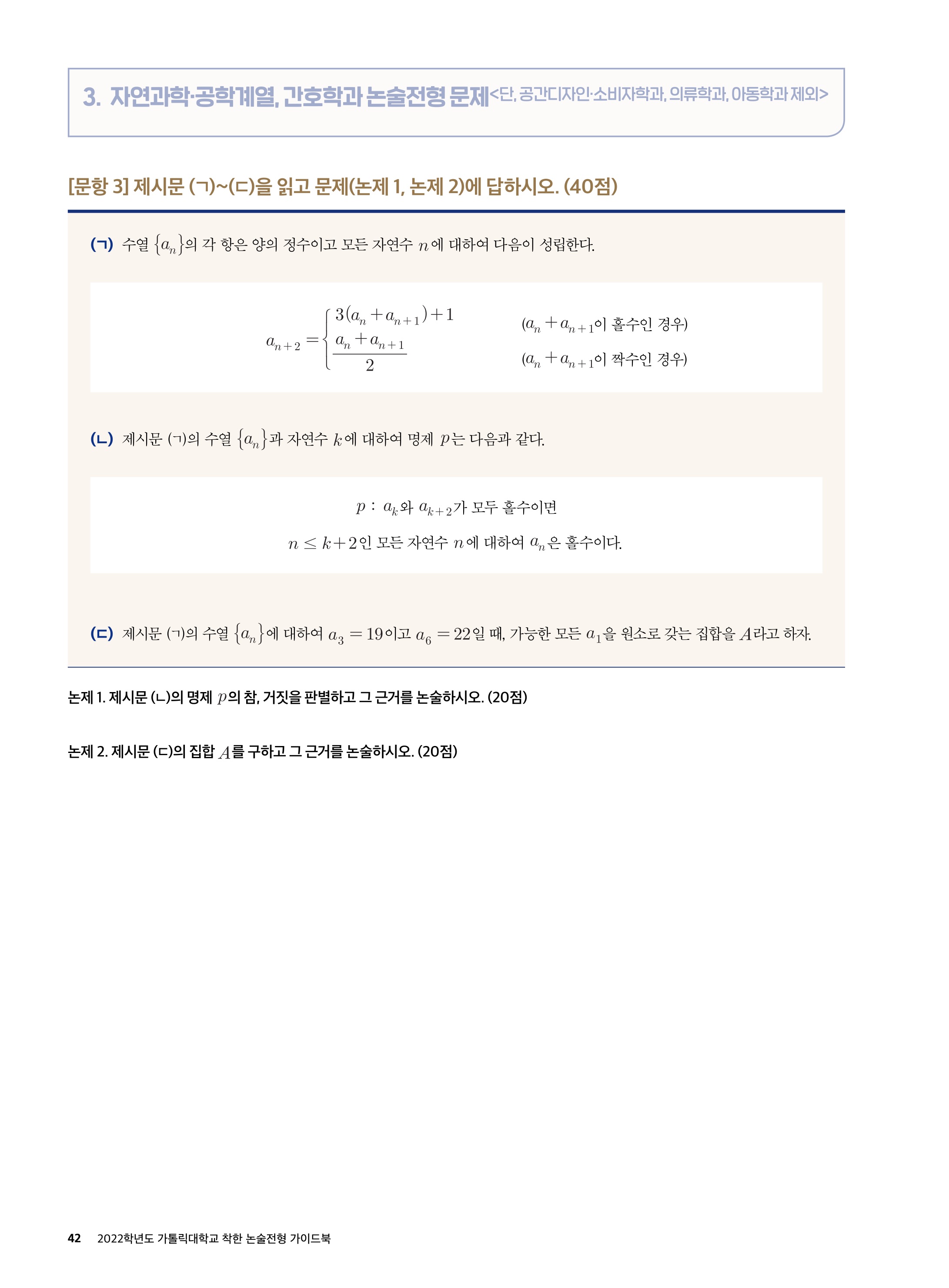 2021학년도 가톨릭대학교 자연과학·공학계열, 간호학과 논술전형 문제