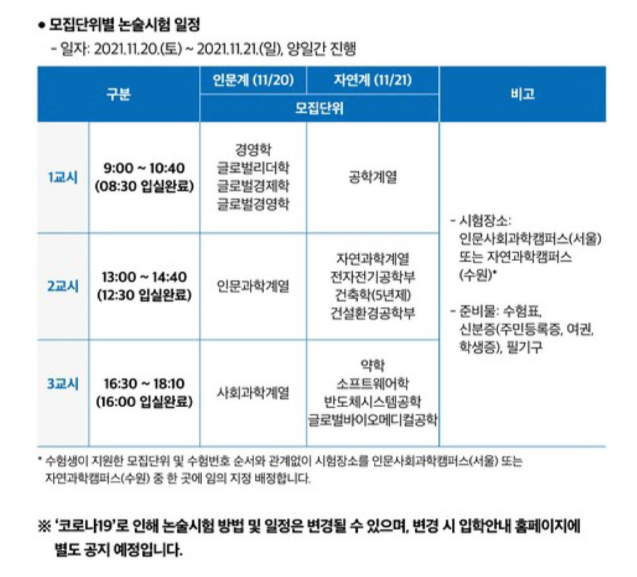- 시험장소: 인문사회과학캠퍼스(서울) 또는 자연과학캠퍼스(수원)