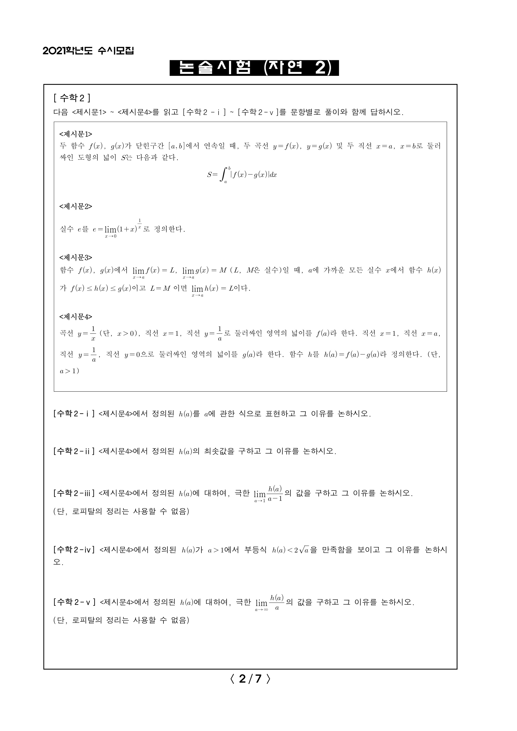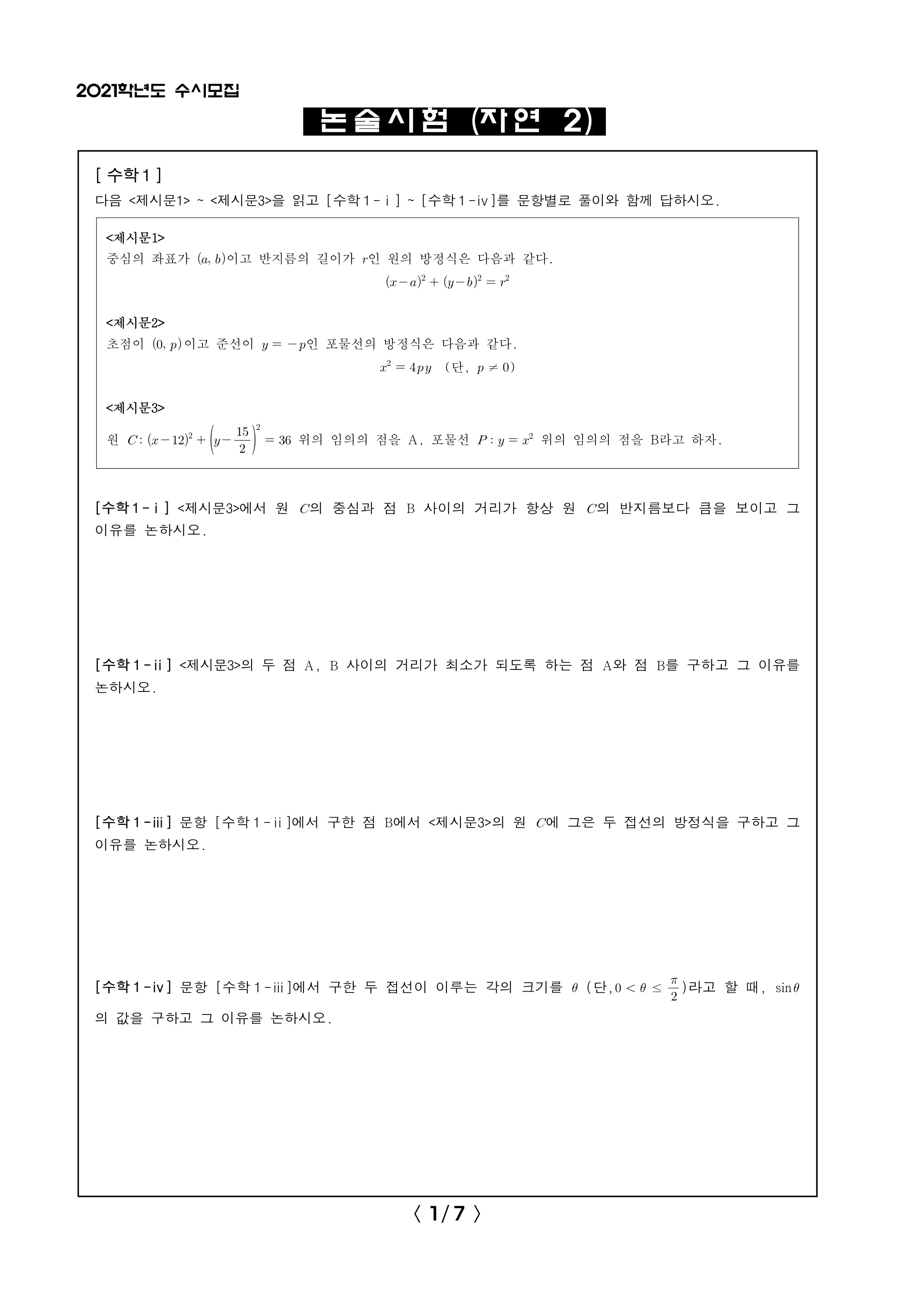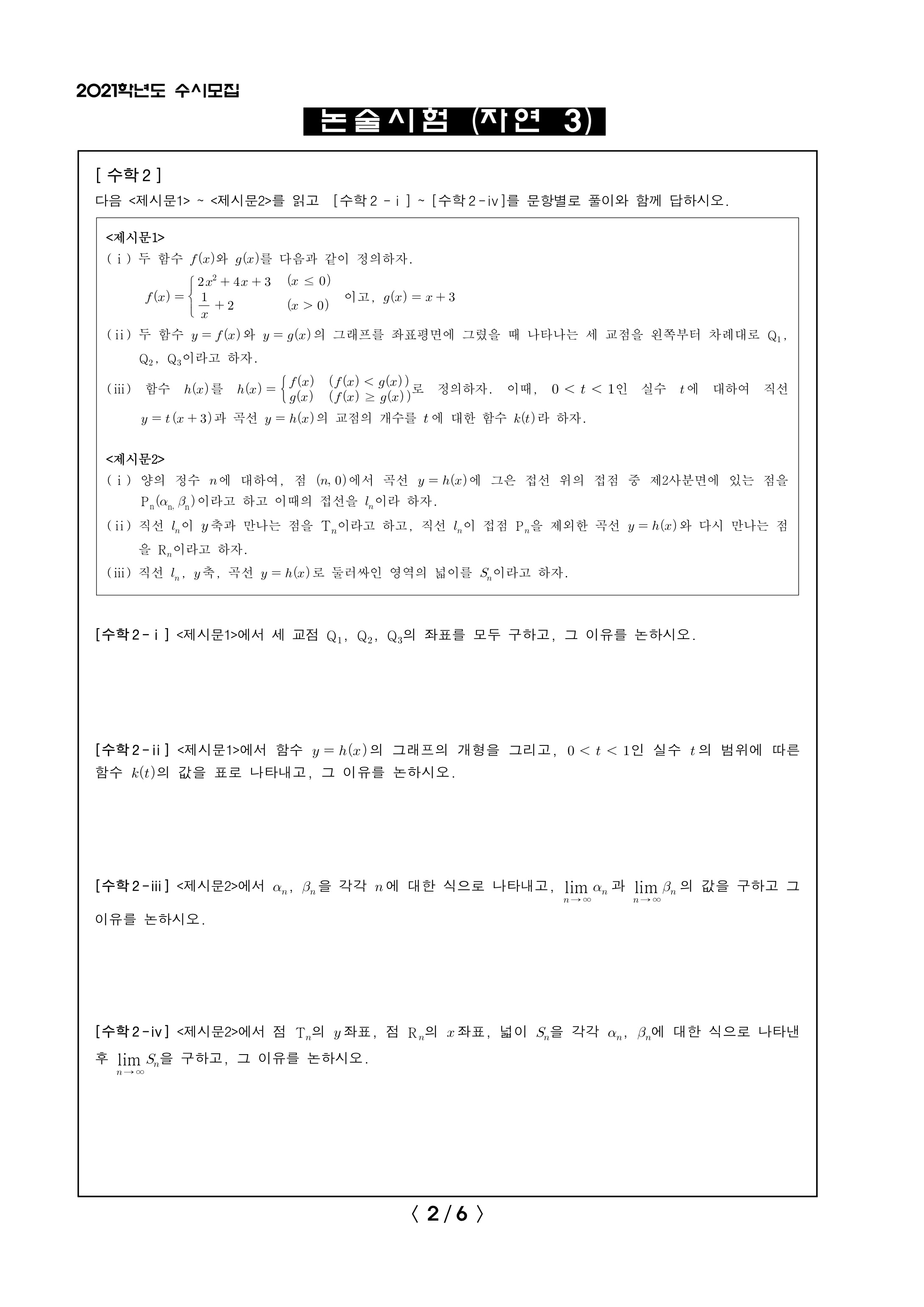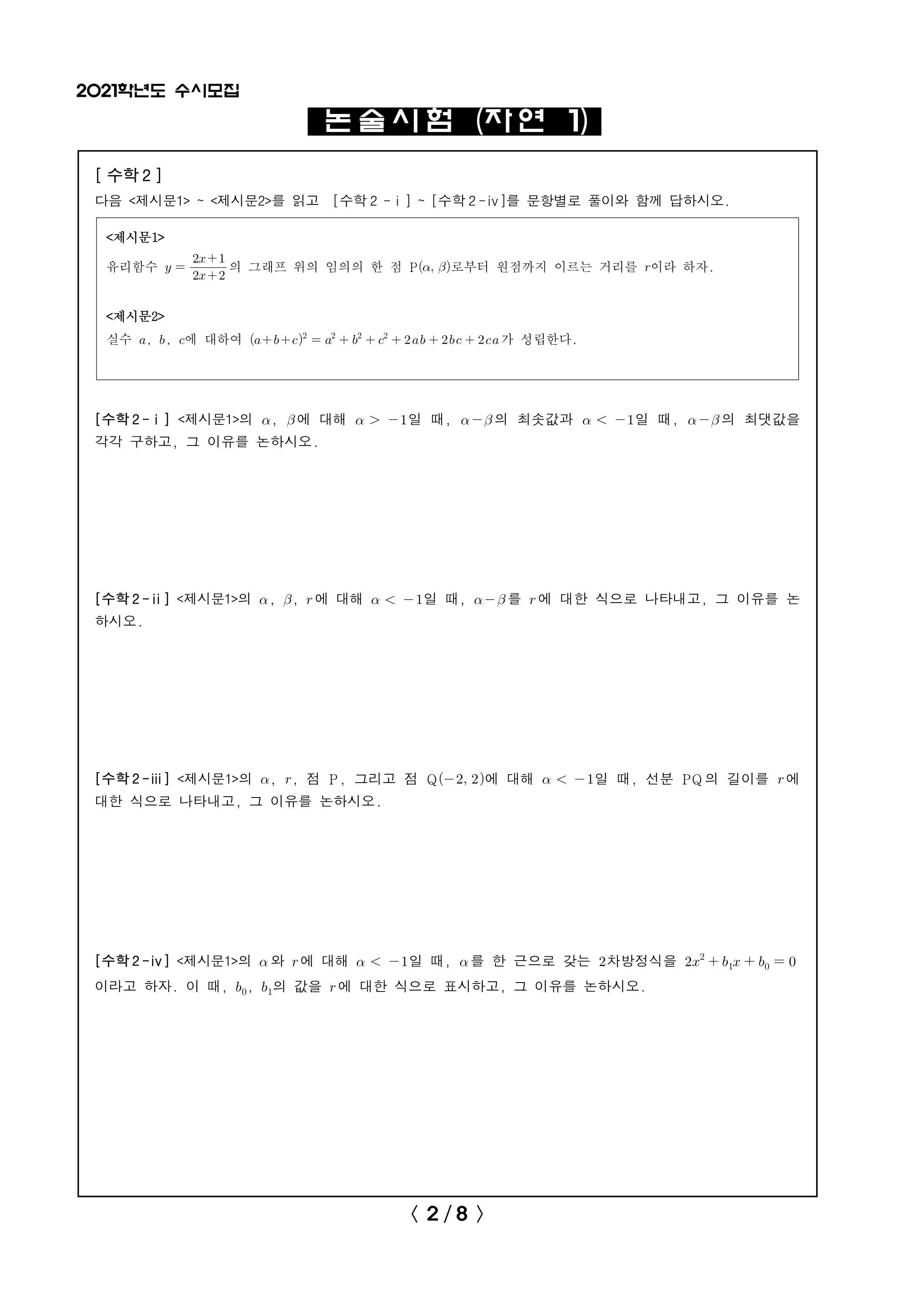 2021학년도 성균관대학교 논술시험 자연2 수학 문제 2021학년도 성균관대학교 논술시험 자연2 수학 과학 문제