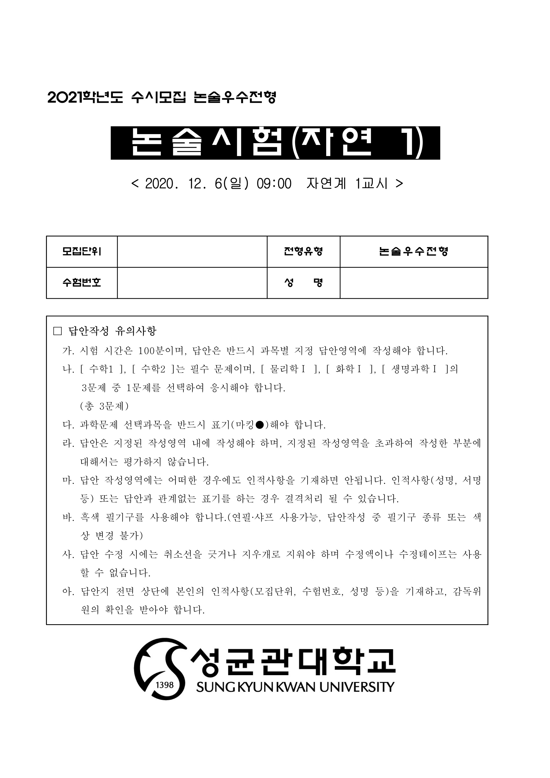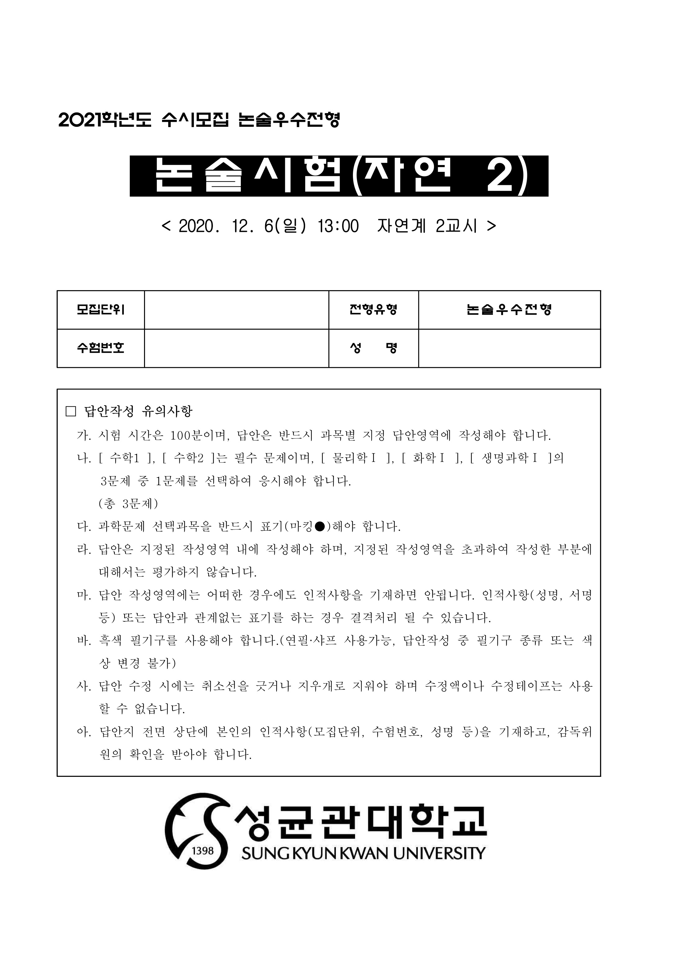 2021년 논술시험 문제 자연 3교시.pdf1.13MB2021학년도 성균관대학교 논술시험 자연3 수학 과학 해설