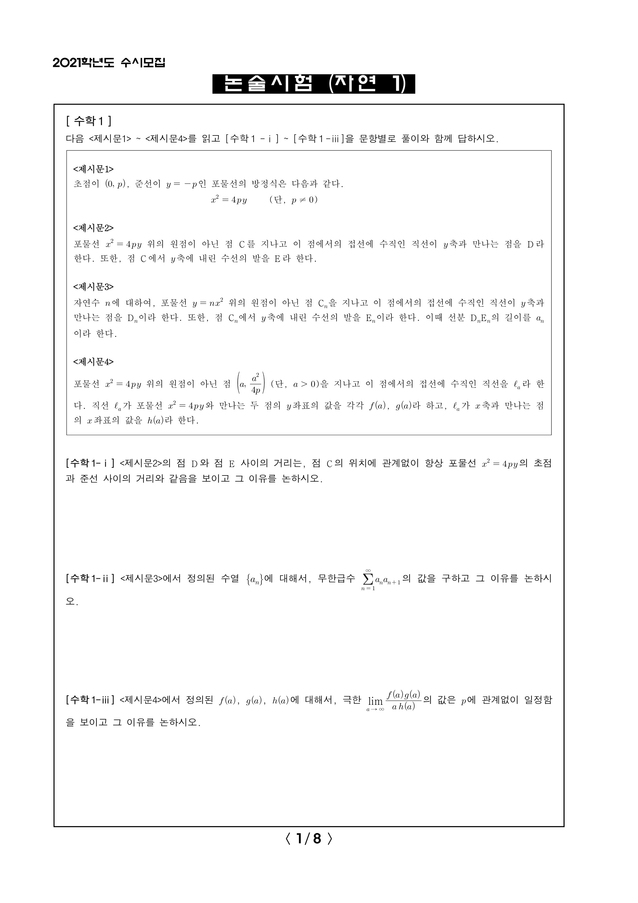 2021학년도 성균관대학교 논술시험 자연1 수학 문제 2021학년도 성균관대학교 논술시험 자연1 수학 과학 문제