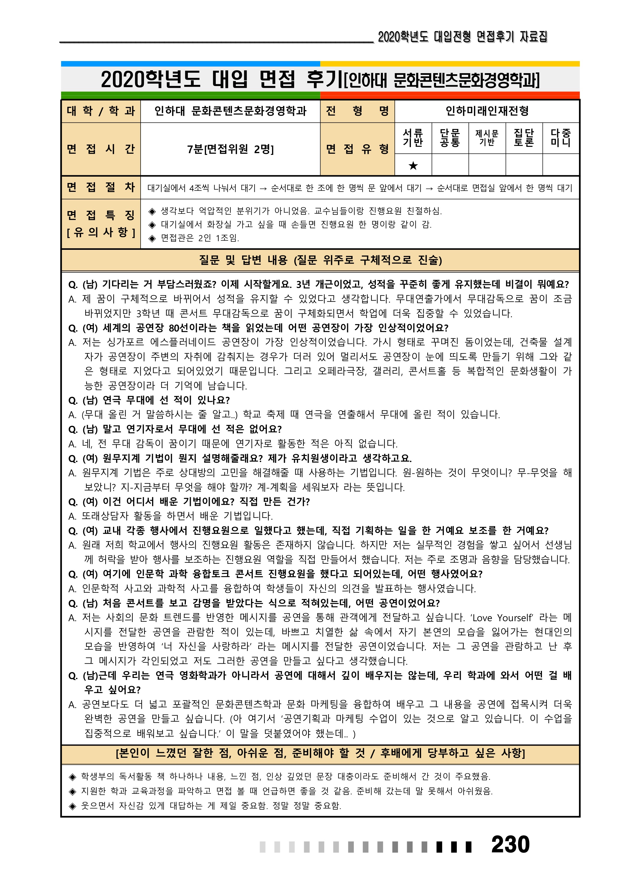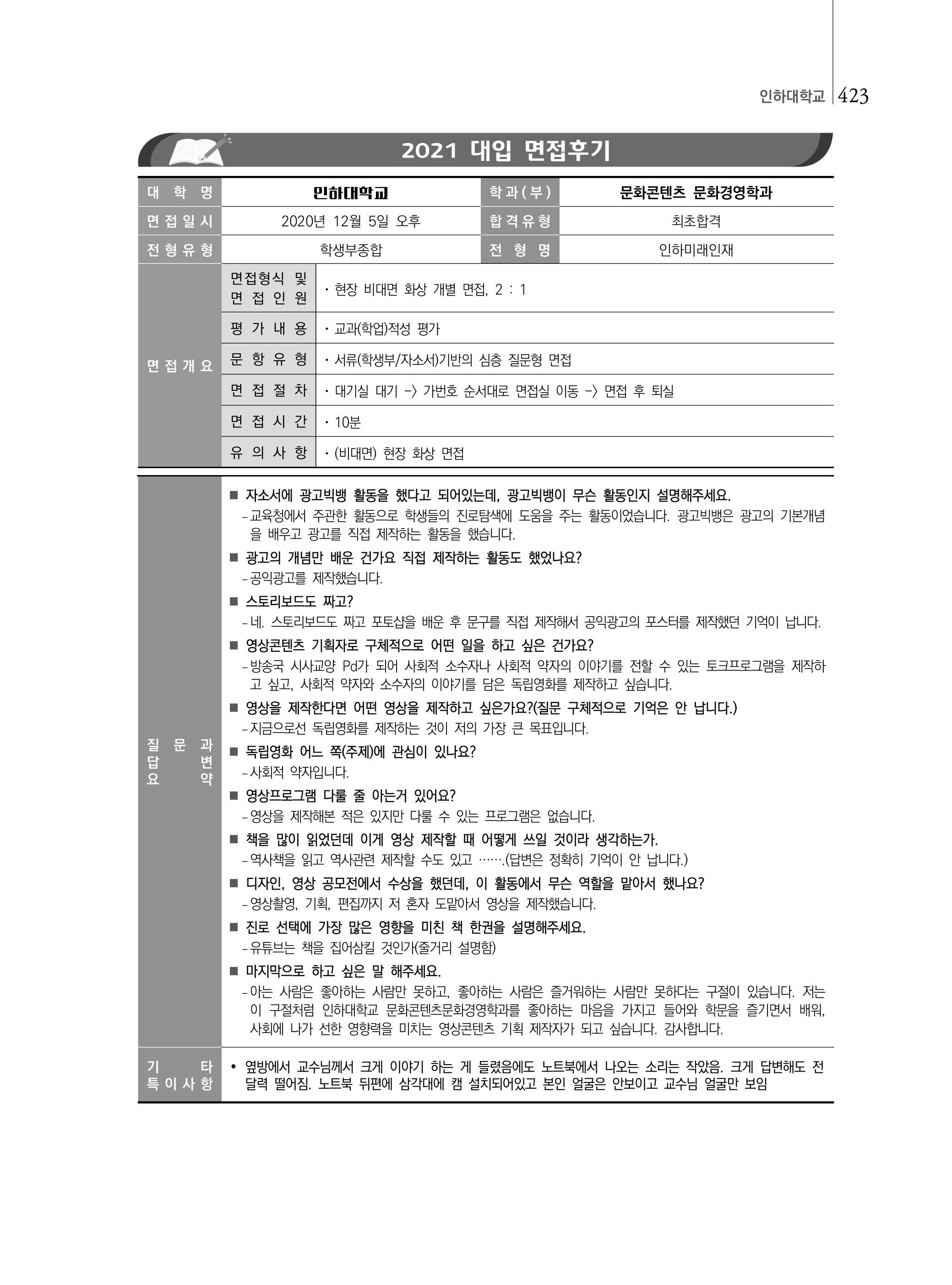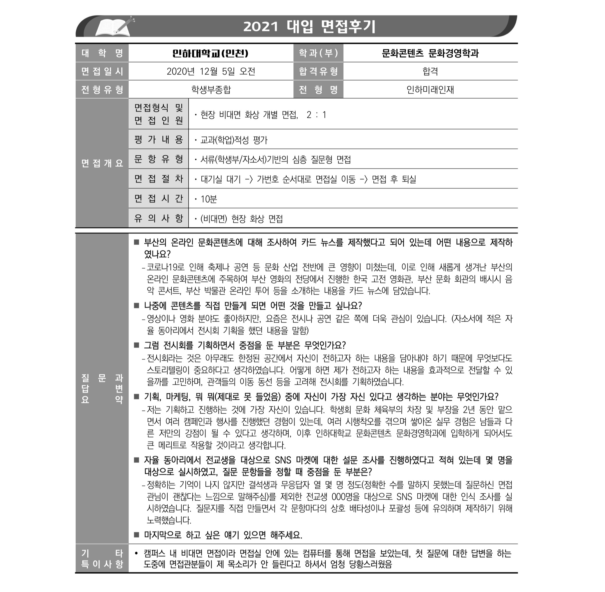 2021학년도 인하대학교 면접 후기8 - 문화콘텐츠문화경영학과 2021학년도 인하대학교 면접 후기9 - 문화콘텐츠문화경영학과
