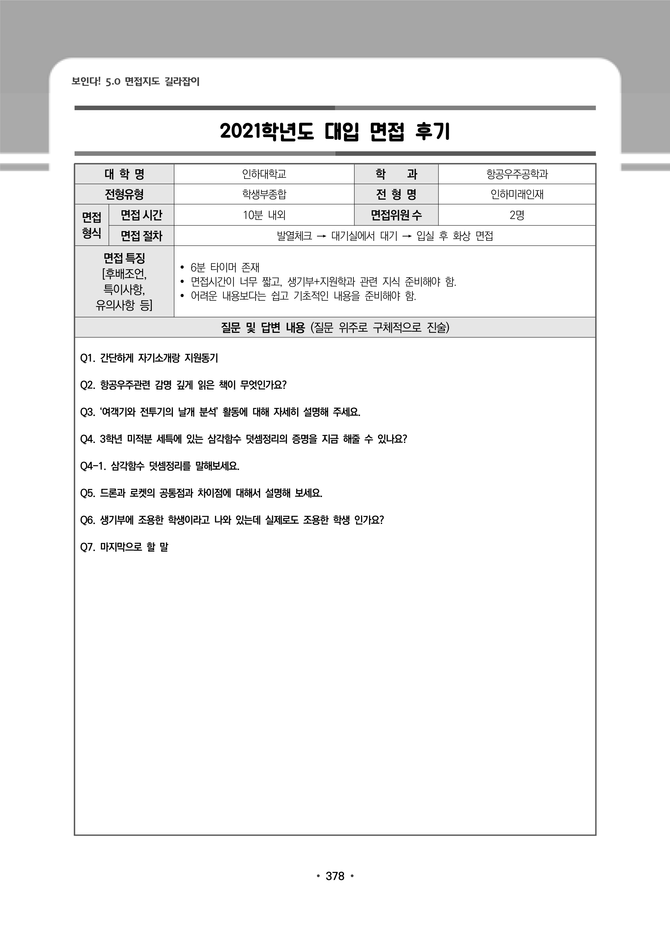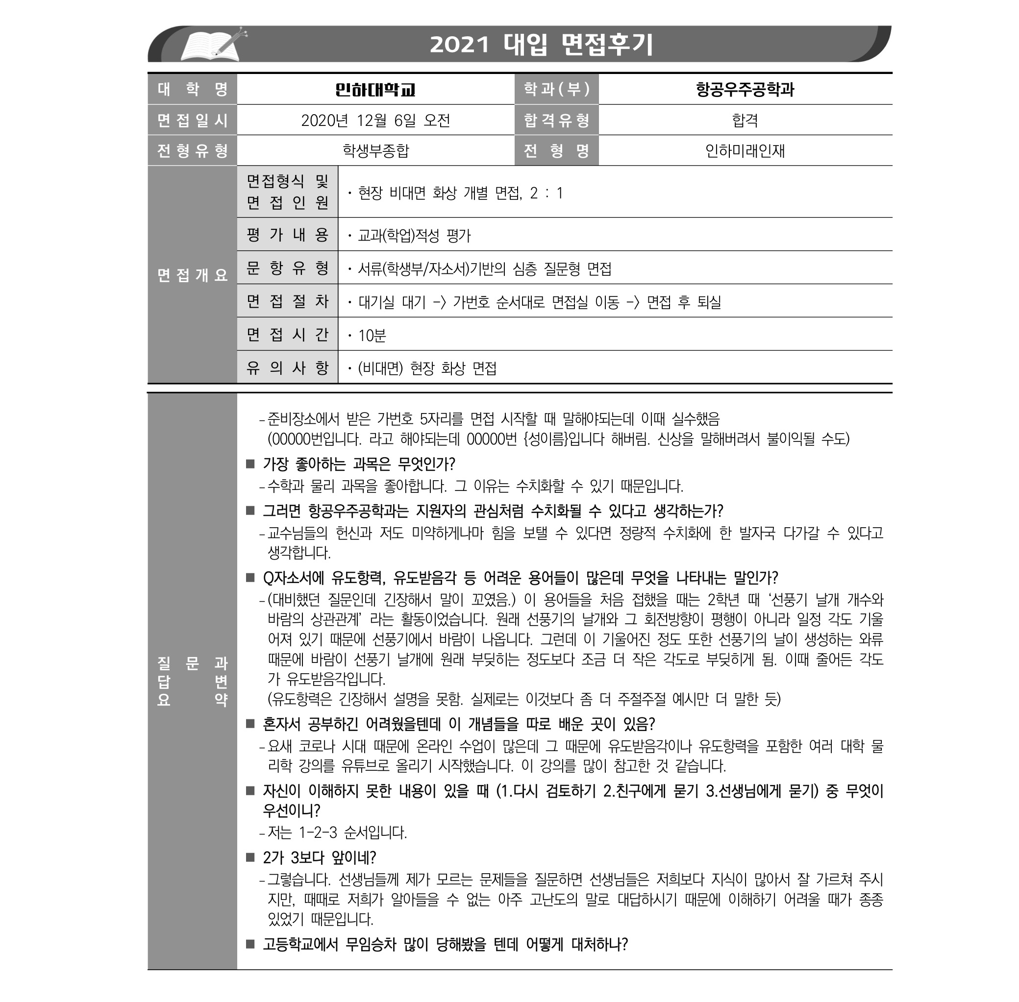 2021학년도 인하대학교 면접 후기25 - 항공우주공학과