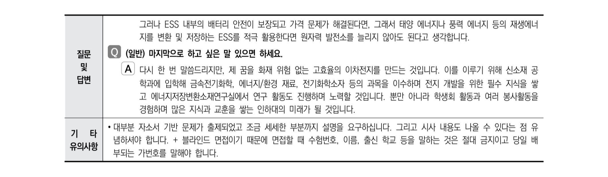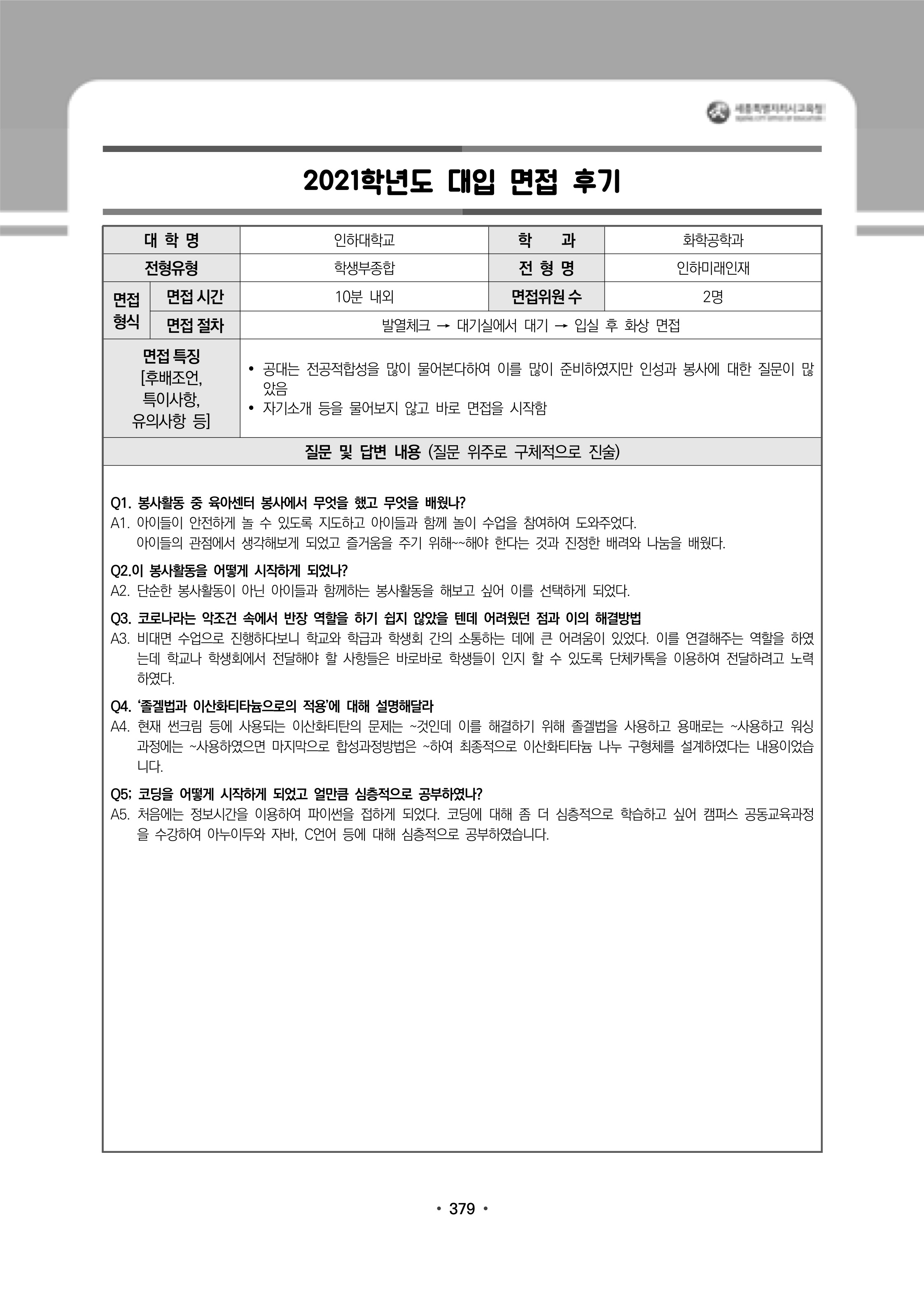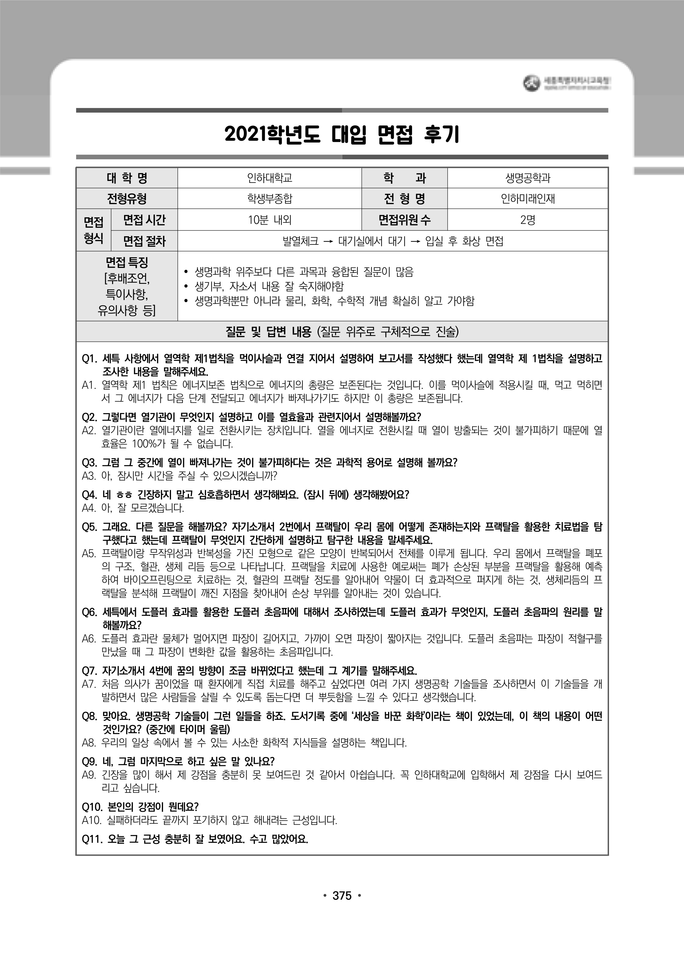 2021학년도 인하대학교 면접 후기15 - 신소재공학과