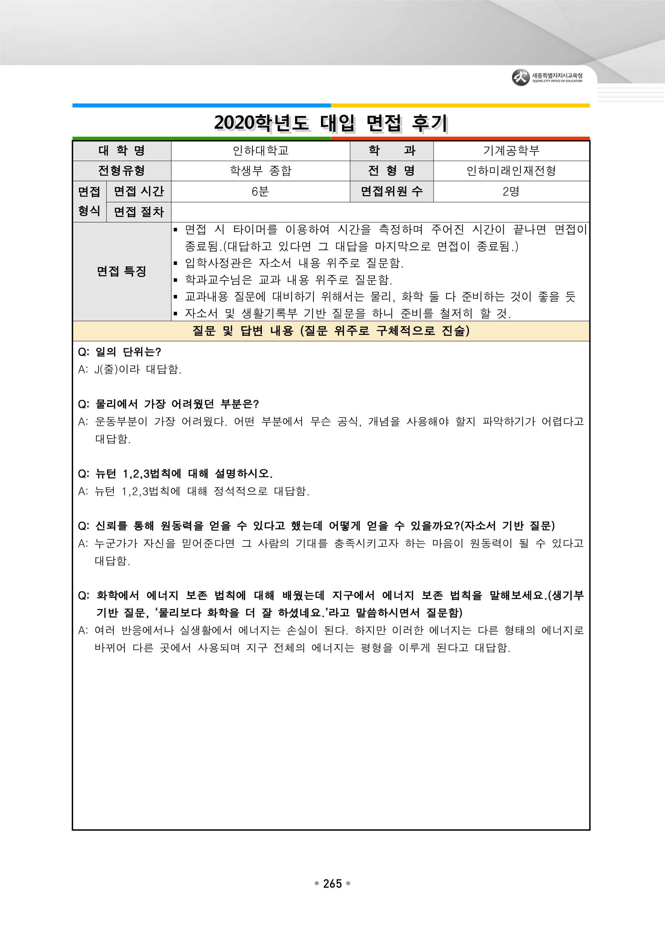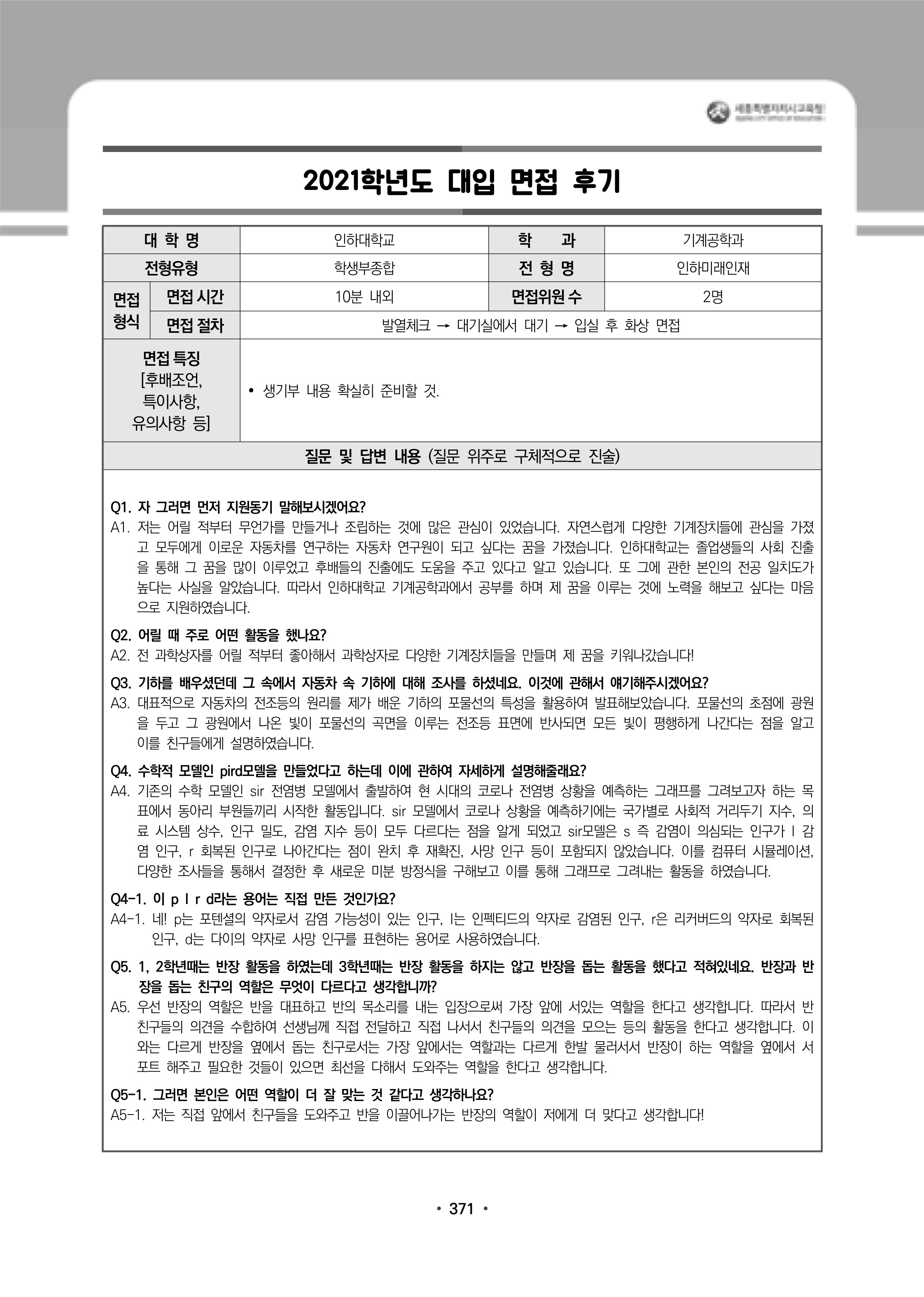 2021학년도 인하대학교 면접 후기14 - 스마트모빌리티공학과 2021학년도 인하대학교 면접 후기15 - 신소재공학과