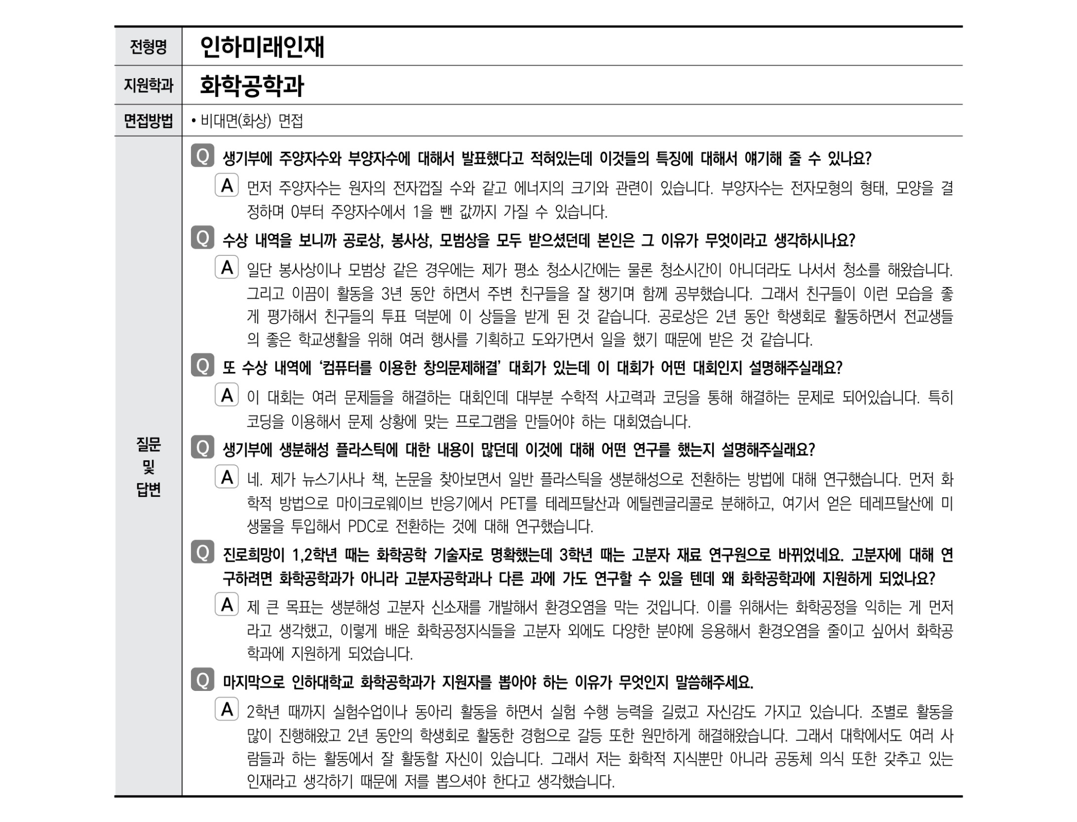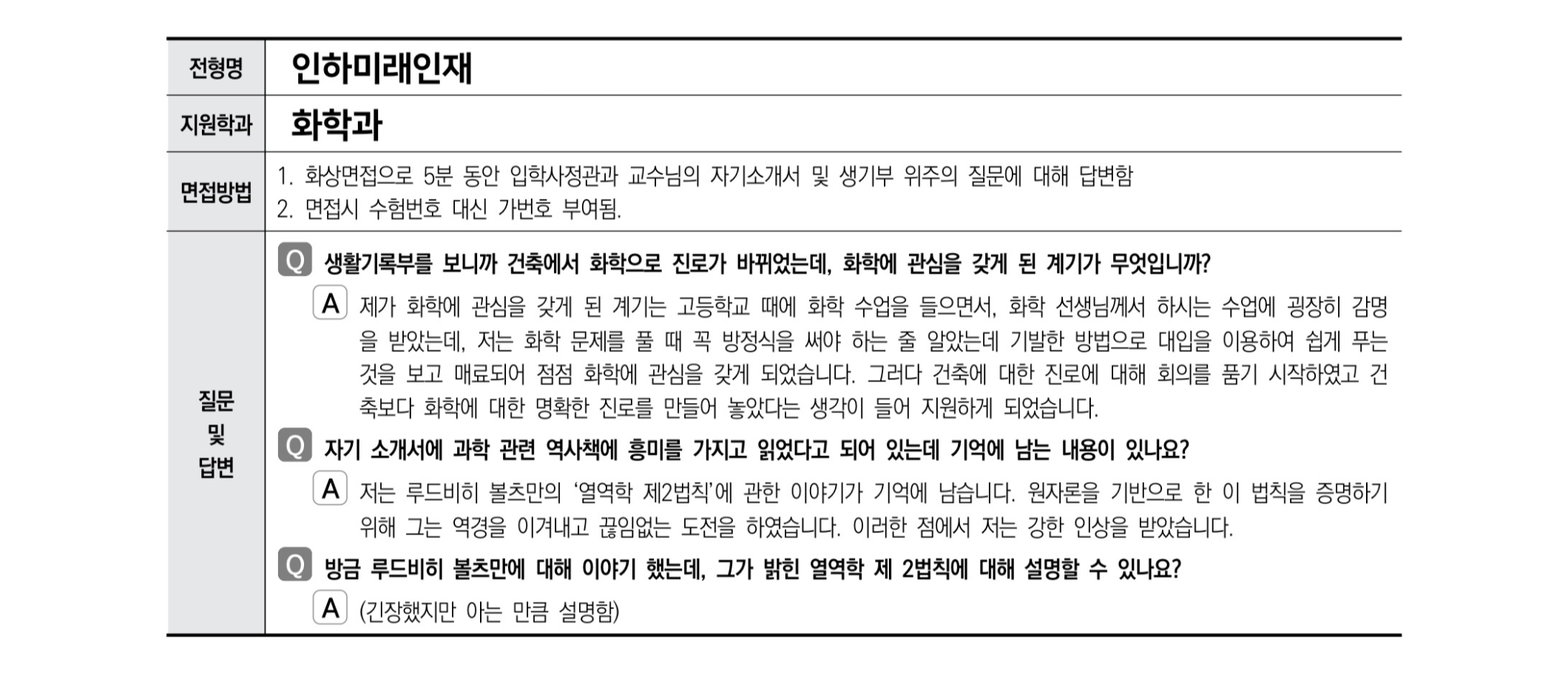 2021학년도 인하대학교 면접 후기33 - 화학과