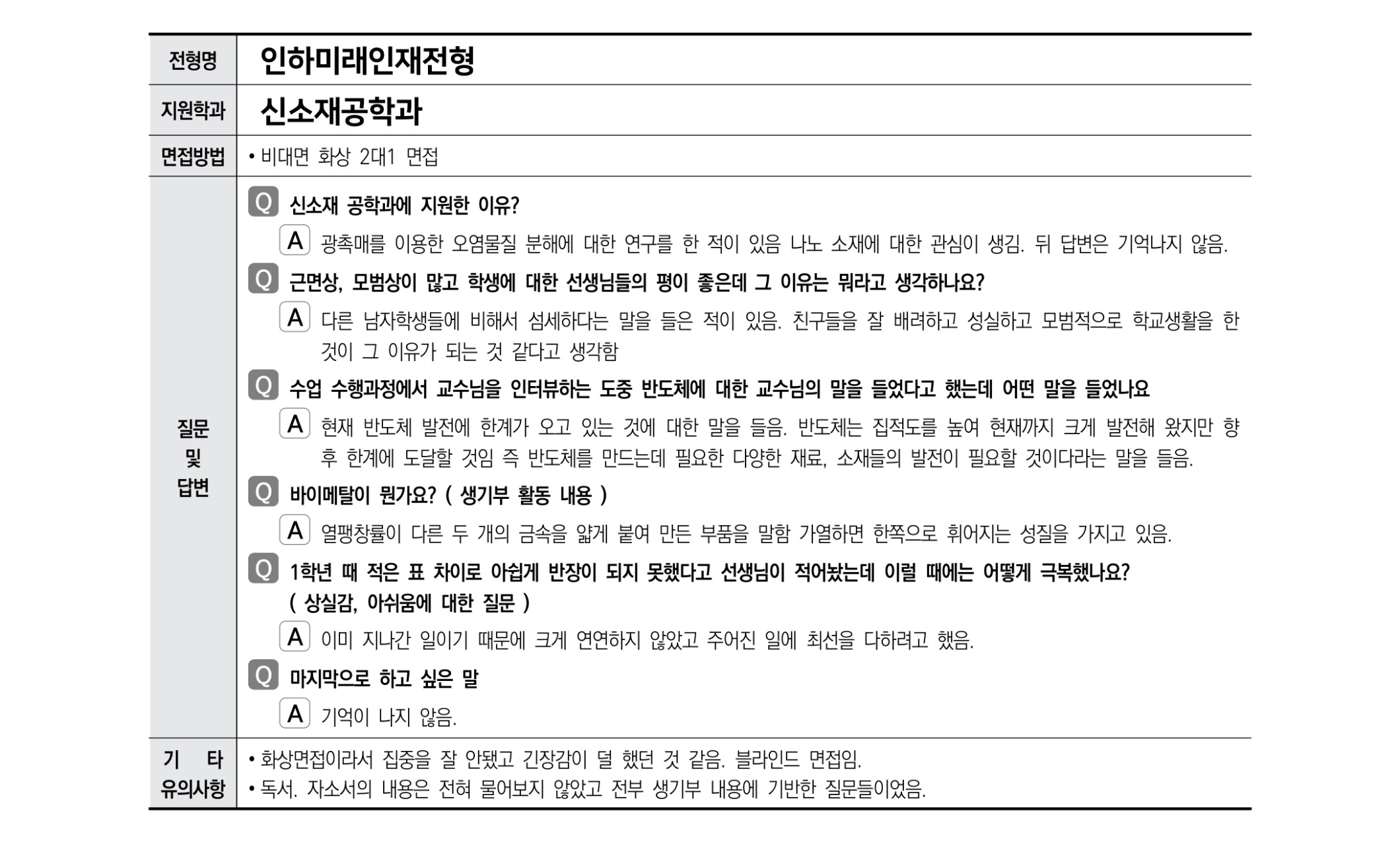 2021학년도 인하대학교 면접 후기16 - 신소재공학과