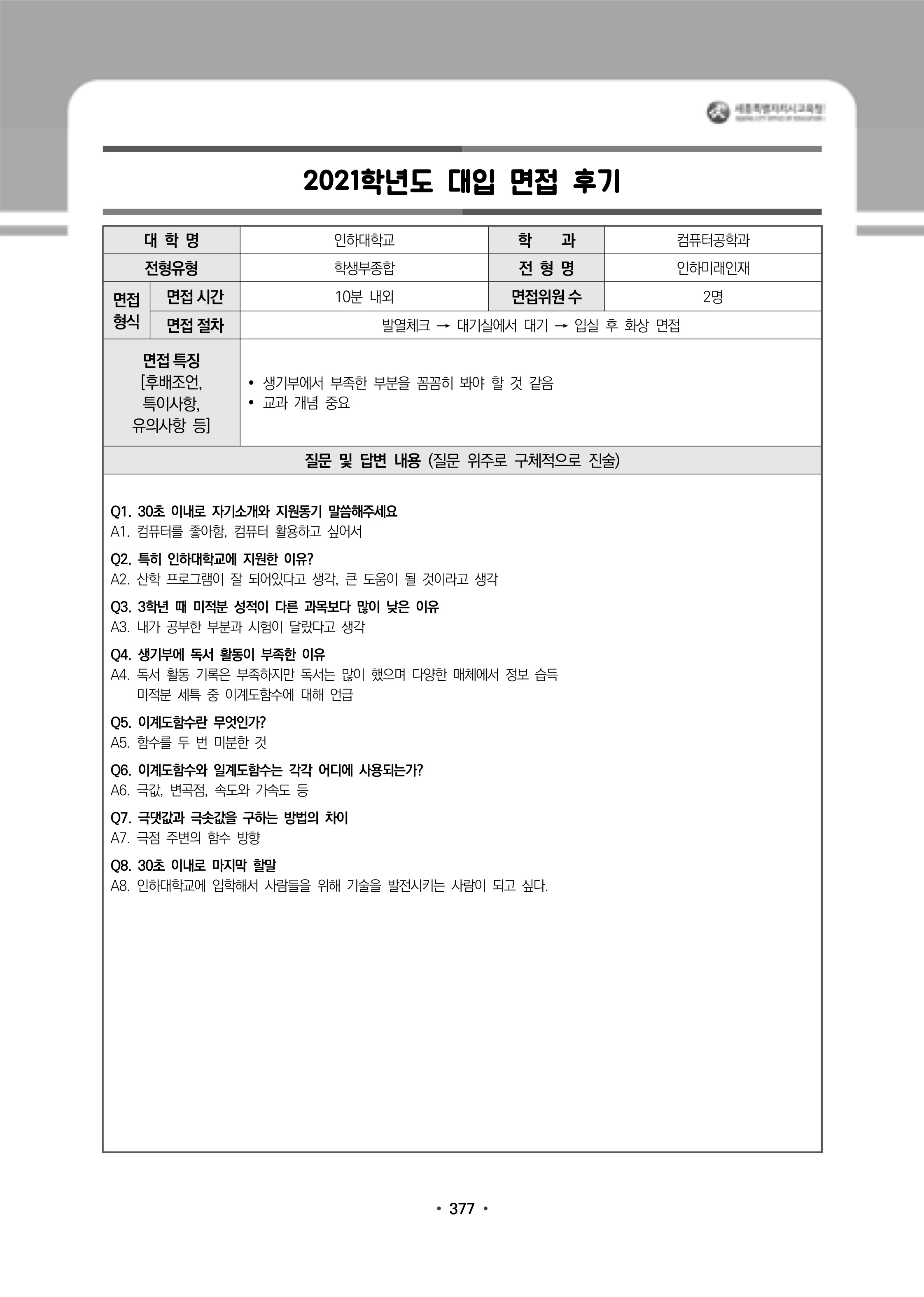2021학년도 인하대학교 면접 전형 분석