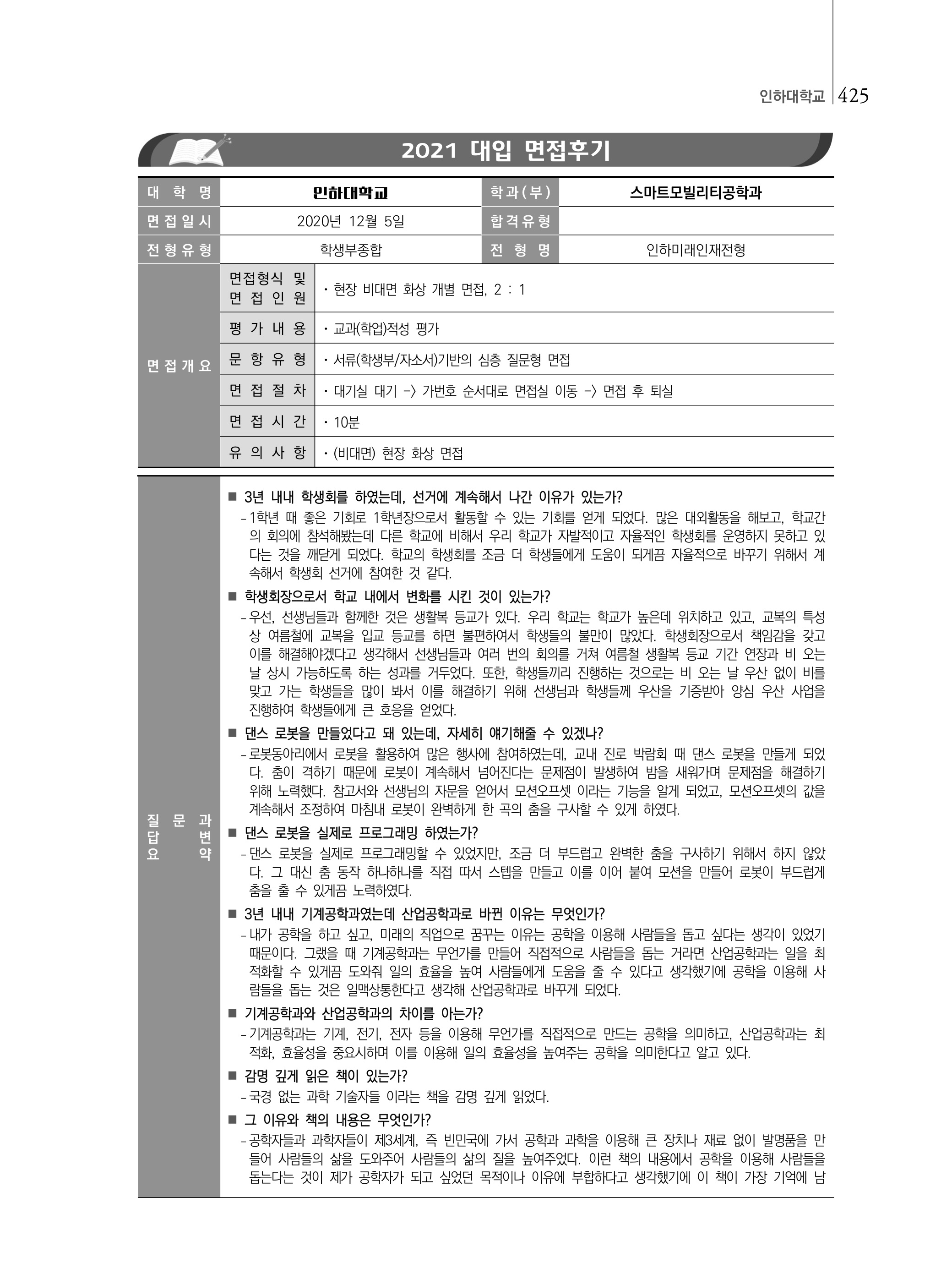 2021학년도 인하대학교 면접 후기14 - 스마트모빌리티공학과