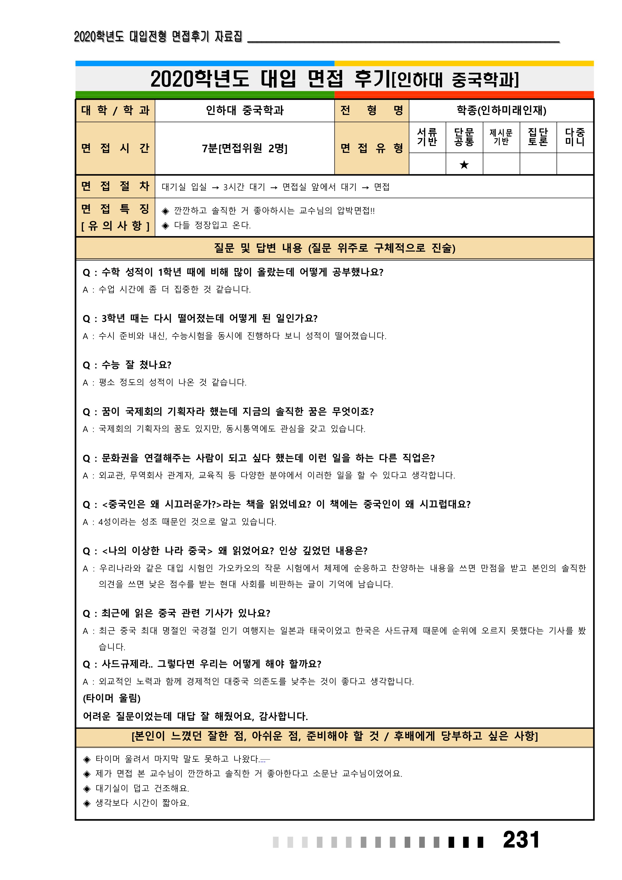 2021학년도 인하대학교 면접 후기23 - 중국학과 2021학년도 인하대학교 면접 후기24 - 컴퓨터공학과