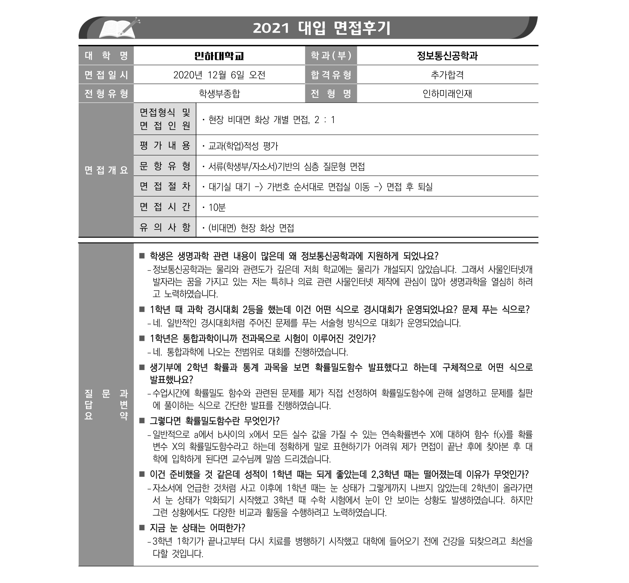 2021학년도 인하대학교 면접 후기22 - 정보통신공학과