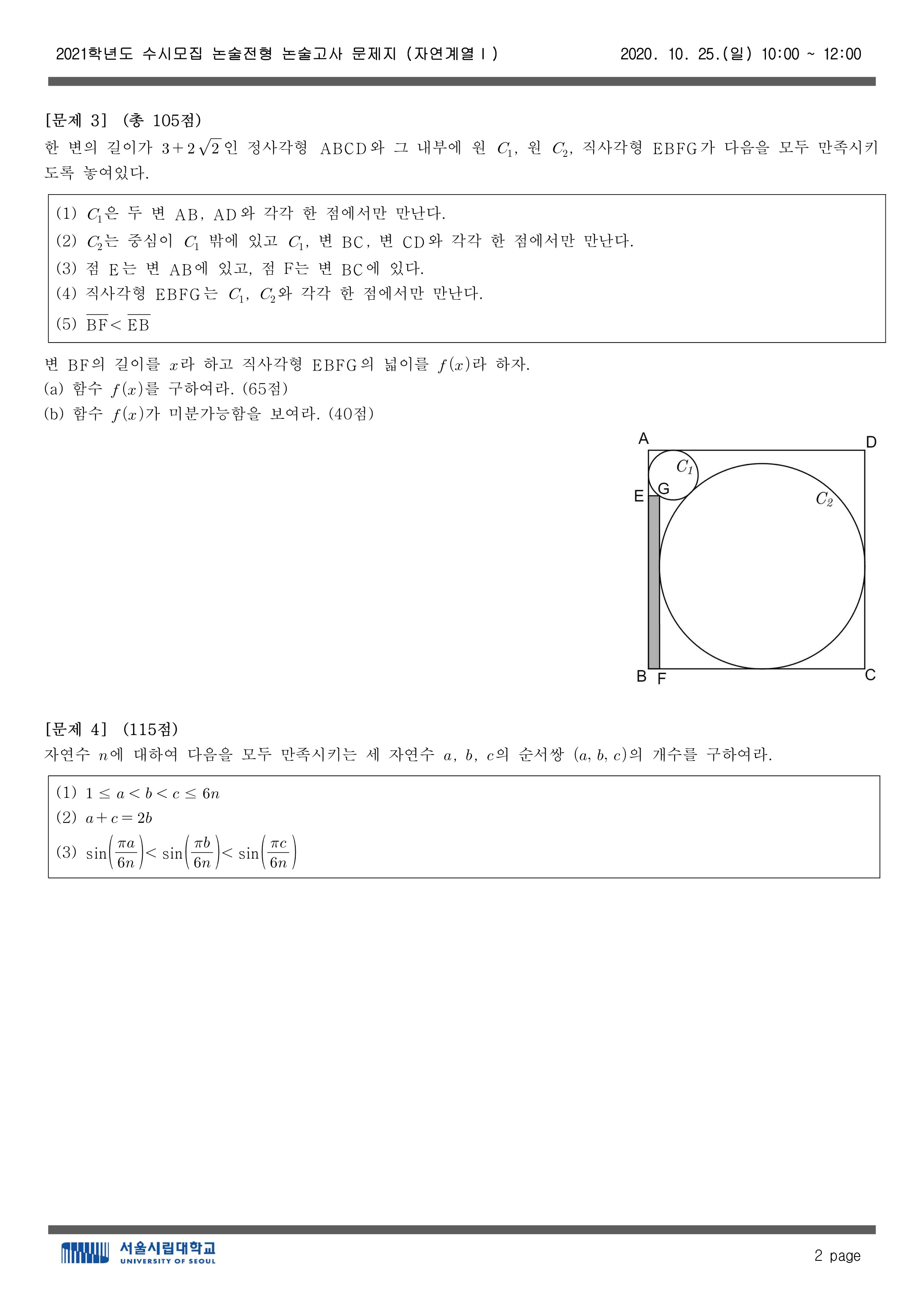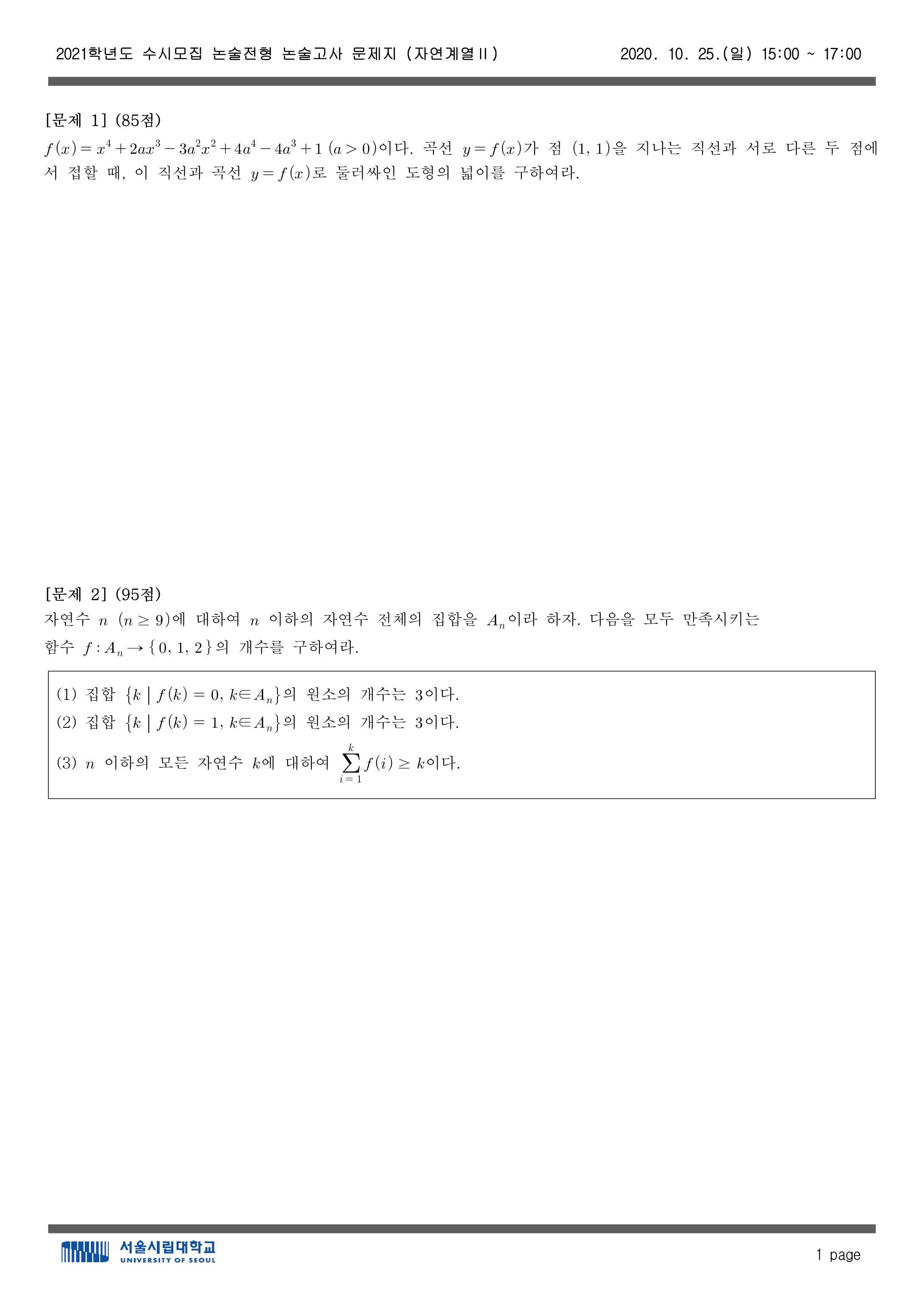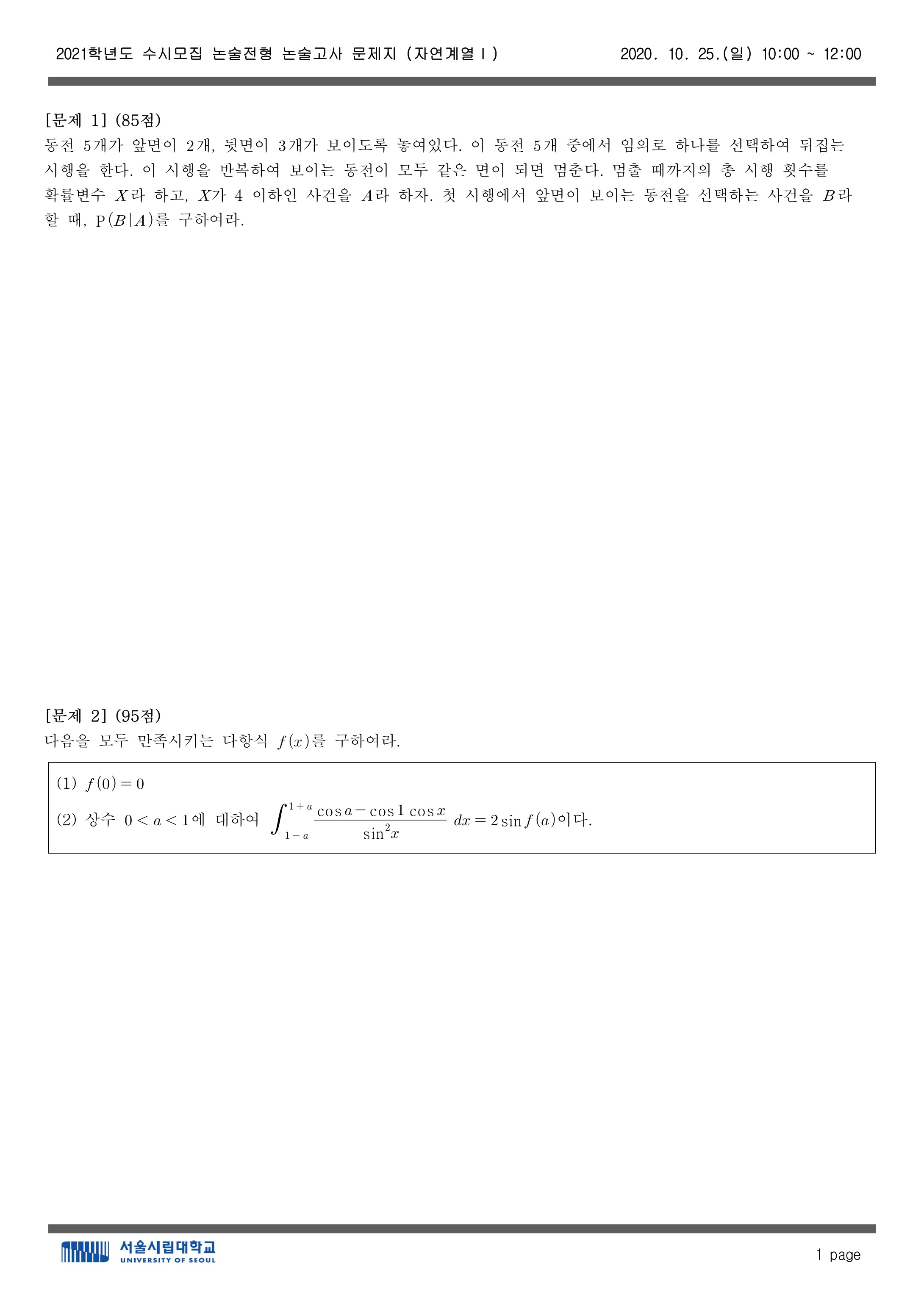 2021학년도 서울시립대학교 논술고사 문제지 (자연계열Ⅰ)