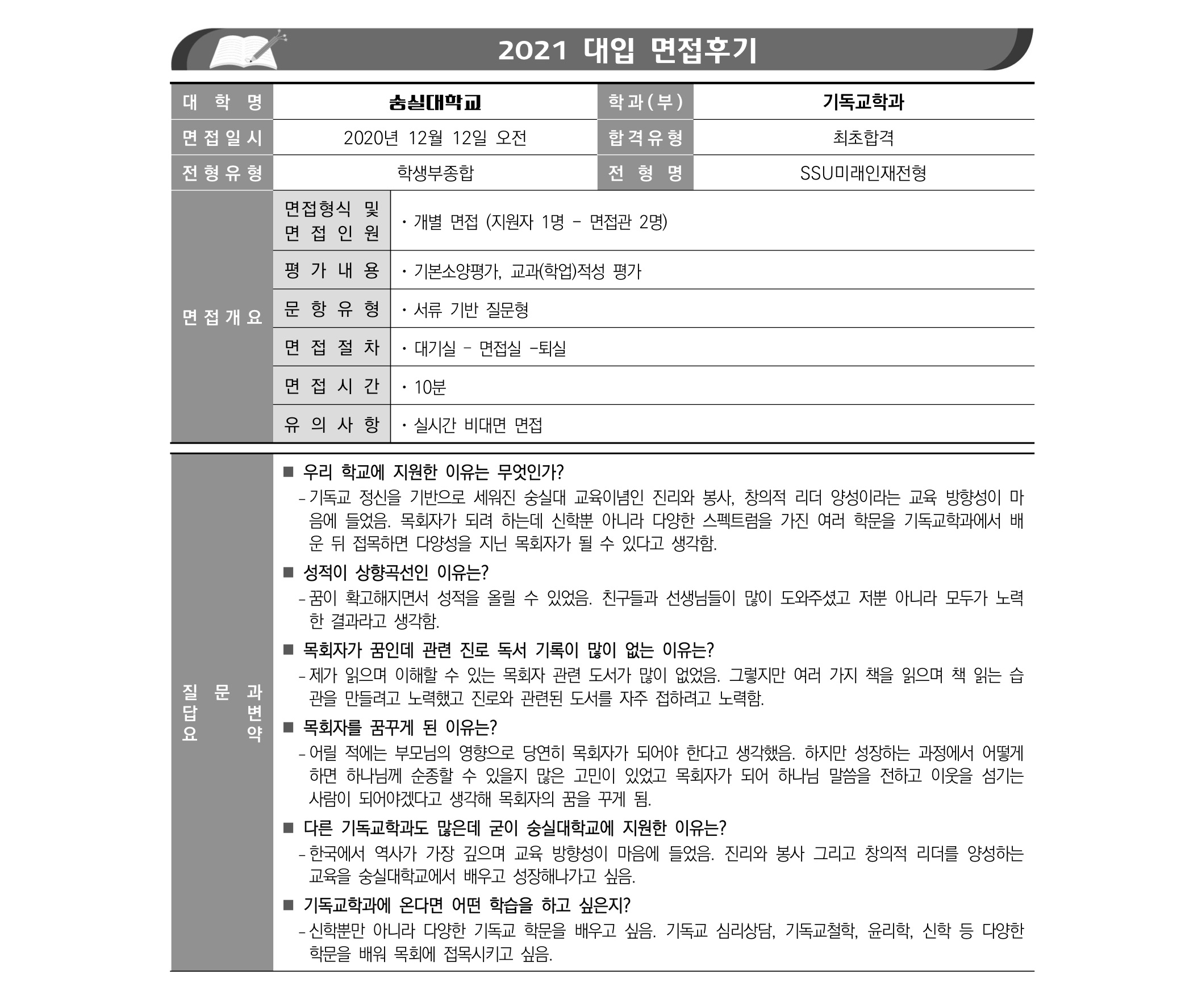 2021학년도 숭실대학교 면접 후기7 - 기독교학과