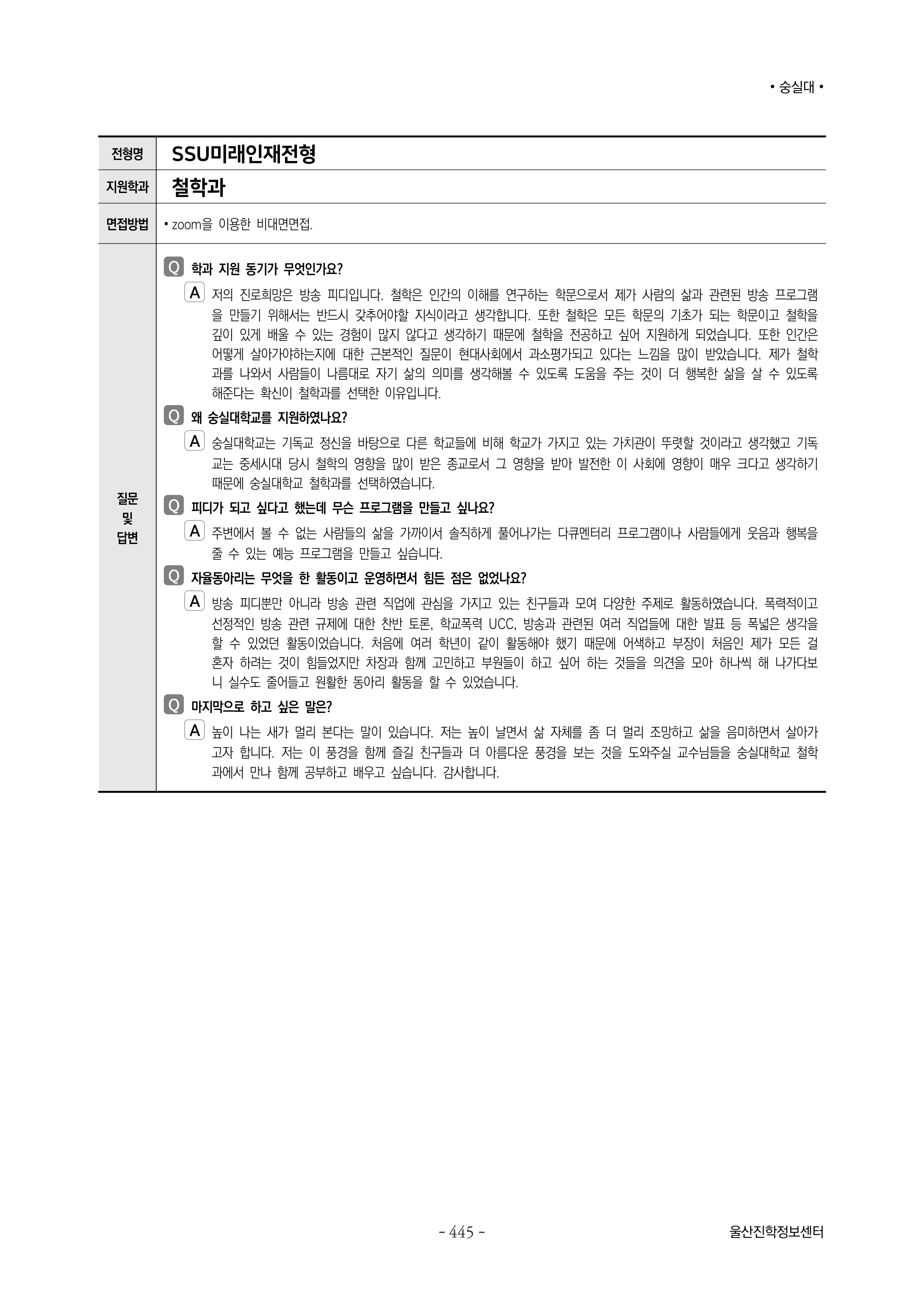 • 면접평가 전반에 걸쳐 드러난 입학 후 숭실대학교 학생으로서의 성장가능성을 평가