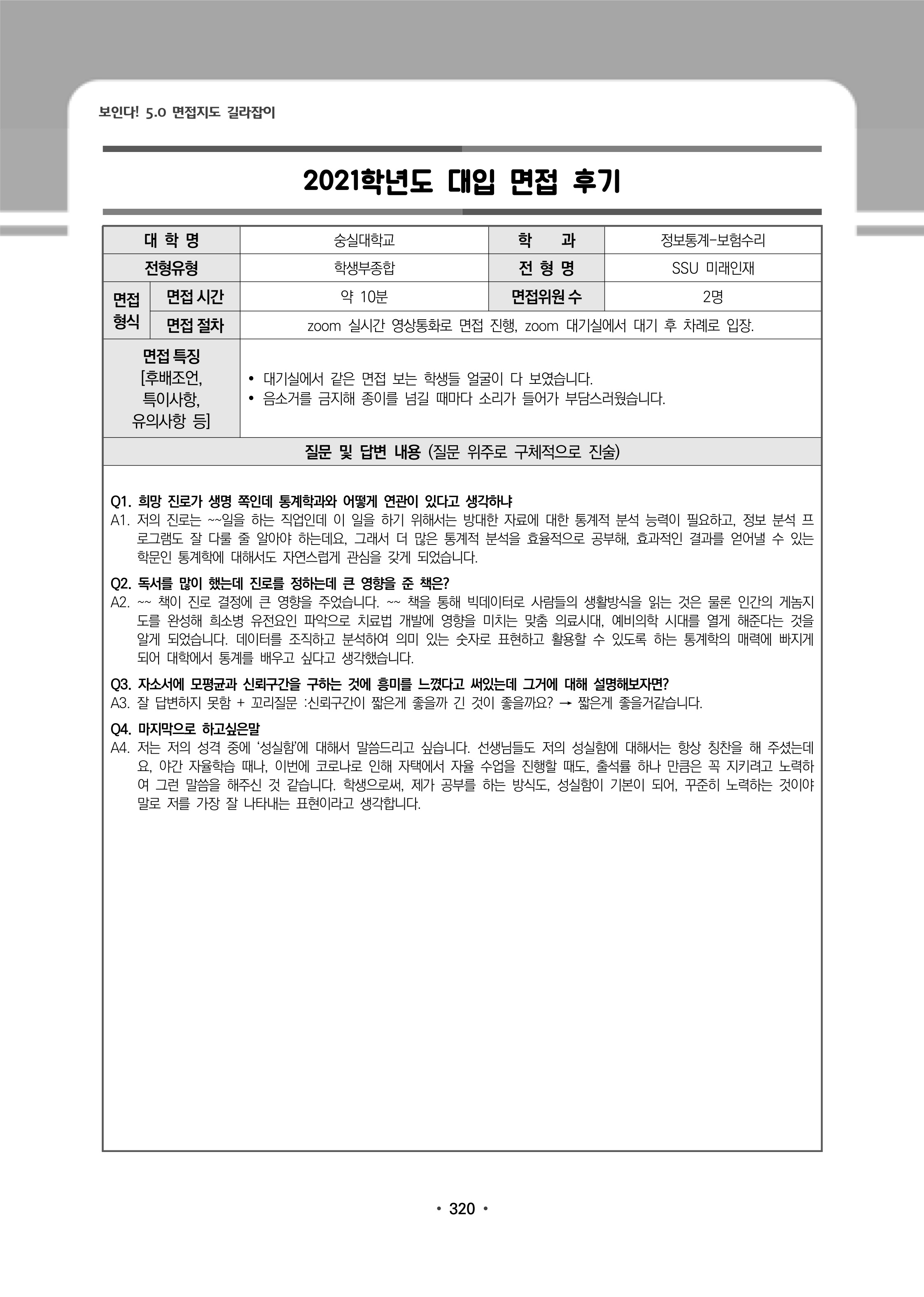 2021학년도 숭실대학교 면접 후기20 - 전자정보공학부 2021학년도 숭실대학교 면접 후기21 - 정보통계보험수리학과