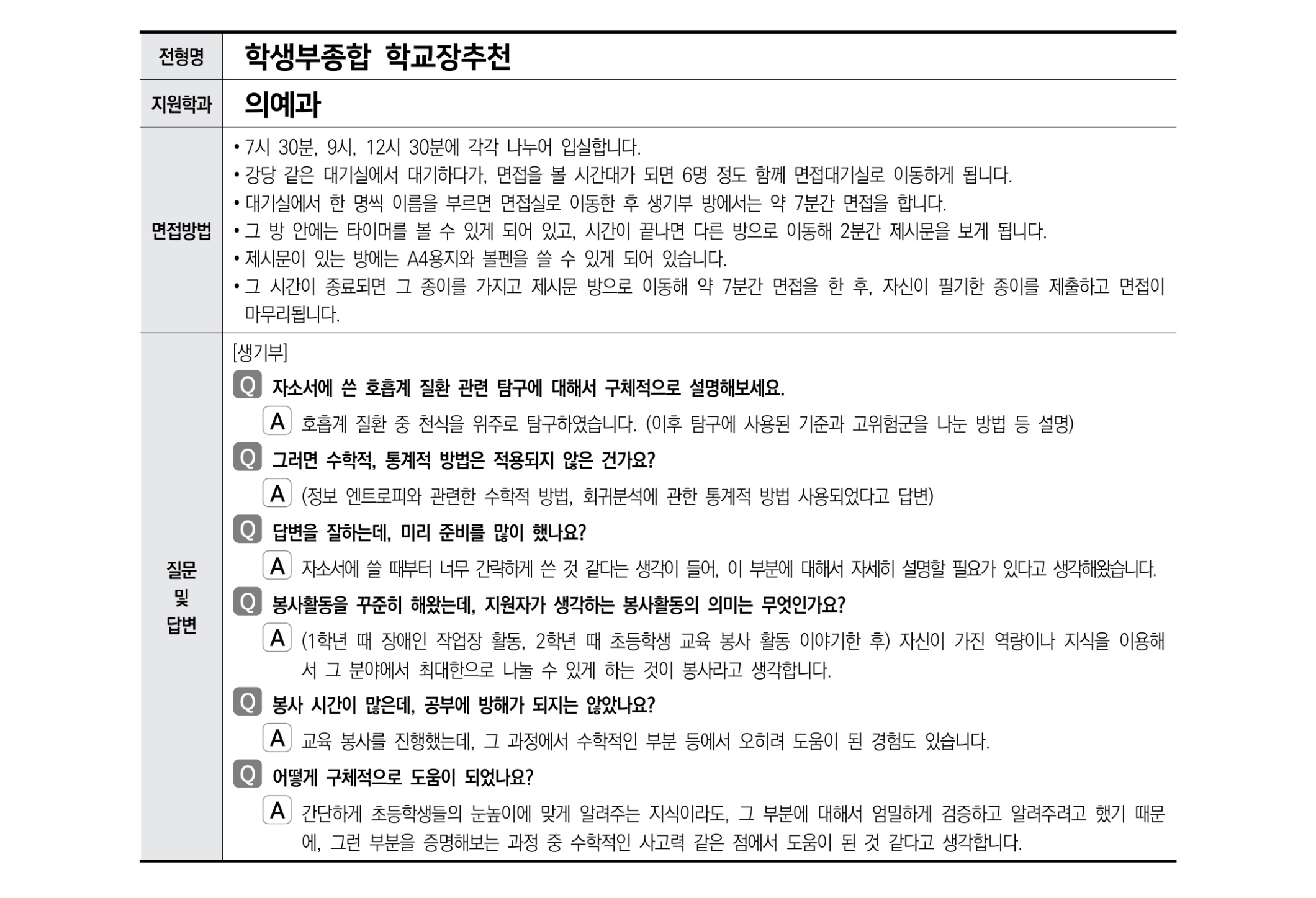 시간 10분 내외 / 의예과 20분 내외