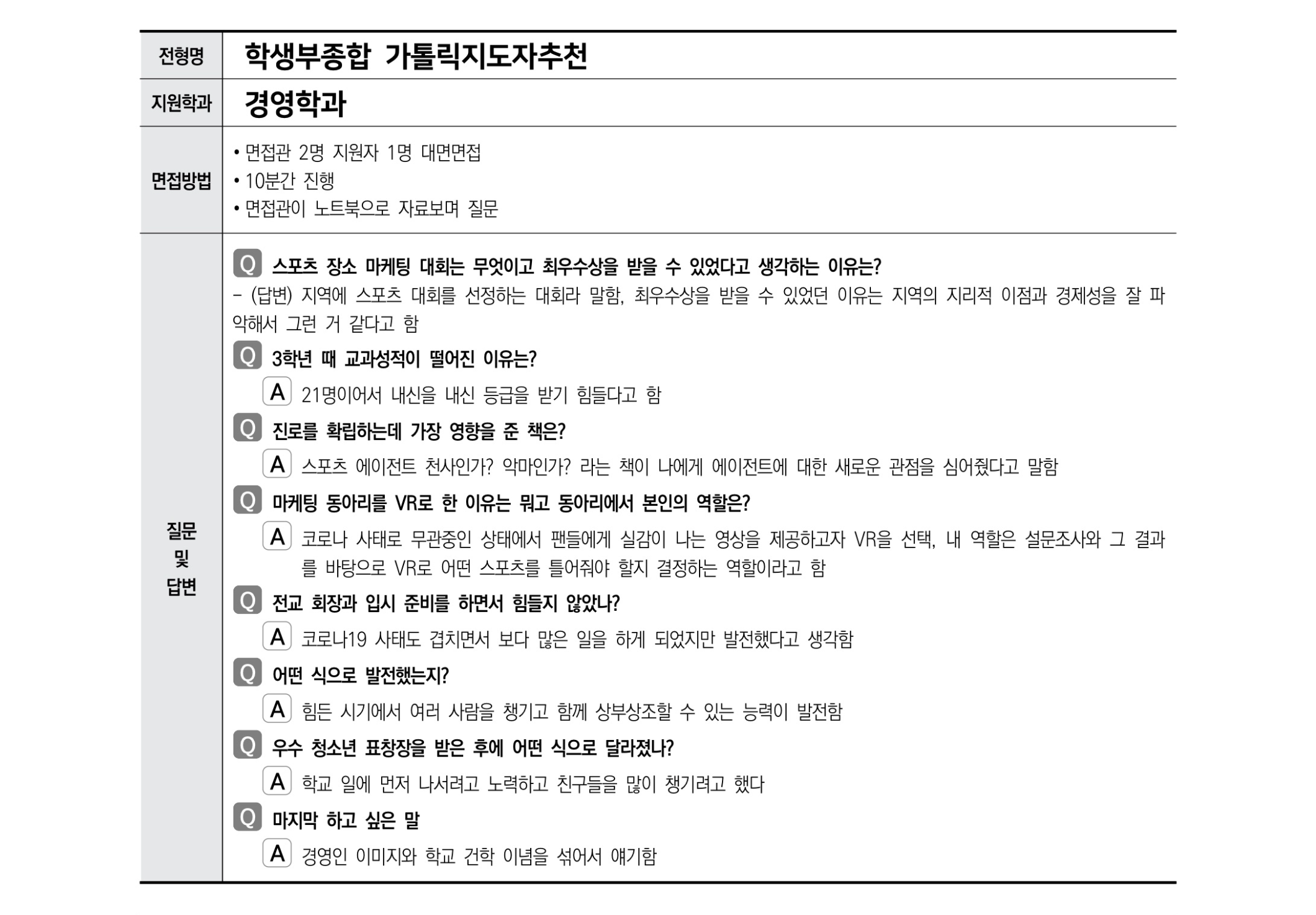 2022학년도 가톨릭대학교 면접 질문