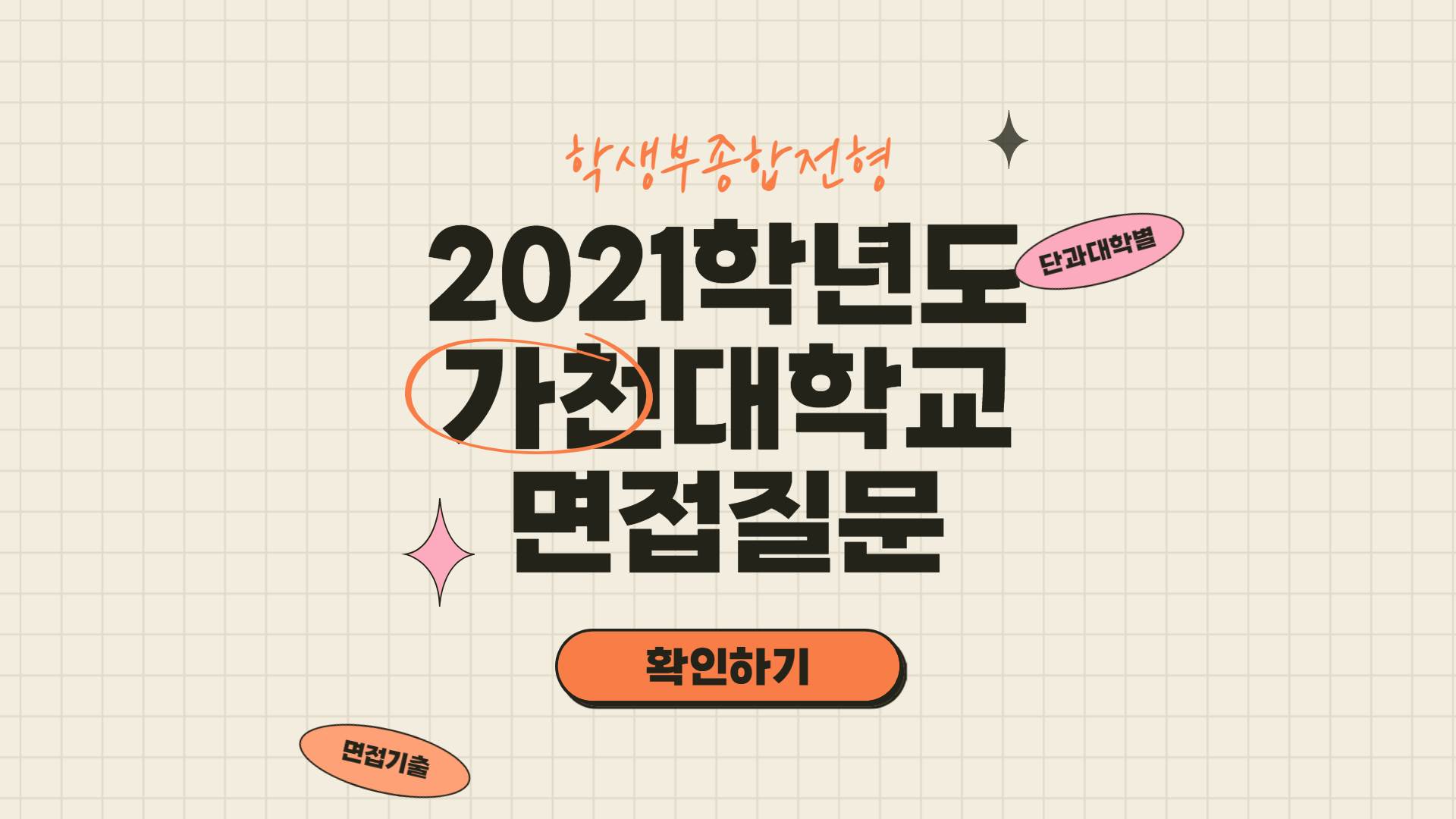 2021학년도 가천대학교 면접 질문 횐님들 안녕하세영~~ 오늘은 2021학년도 가천대학교 면접 전형을 분석해보고영, 수시 면접에서 출제된 질문들을 살펴보고 실제 면접에 임한 선배들의 후기를 들어볼 거예영. 가천대학교는 수시 2단계에서 면접 비율이 50%나 들어가는 전형이 많은데영, 다른 학교에 비해서 면접 비율이 높으니 본인이 제출한 자소서와 생기부를 보고 꼼꼼히 면접 대비를 하는 것이 좋겠어영. 가천대학교는 선배 지원자들의 생생한 후기를 많이 가져왔으니 참고하시면 도움이 될 거예영.😉