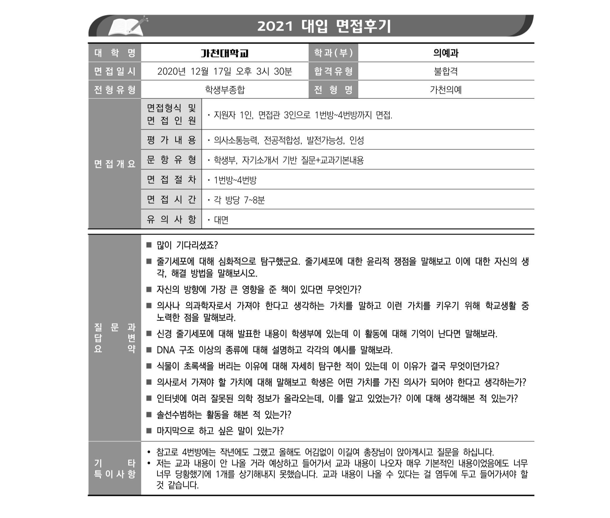 2021학년도 가천대학교 면접 후기14 - 의예과 2021학년도 가천대학교 면접 후기15 - 의용생체공학과