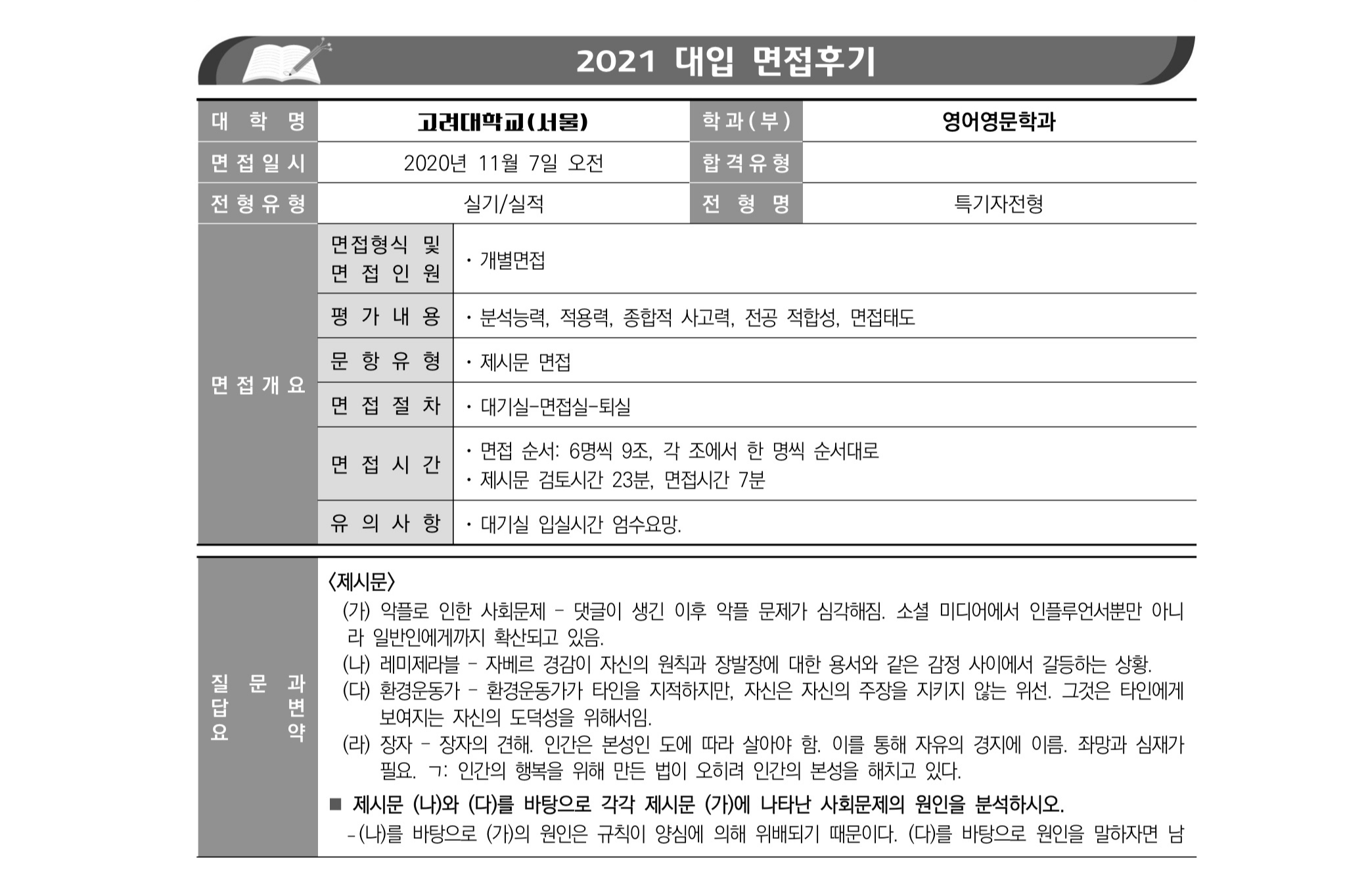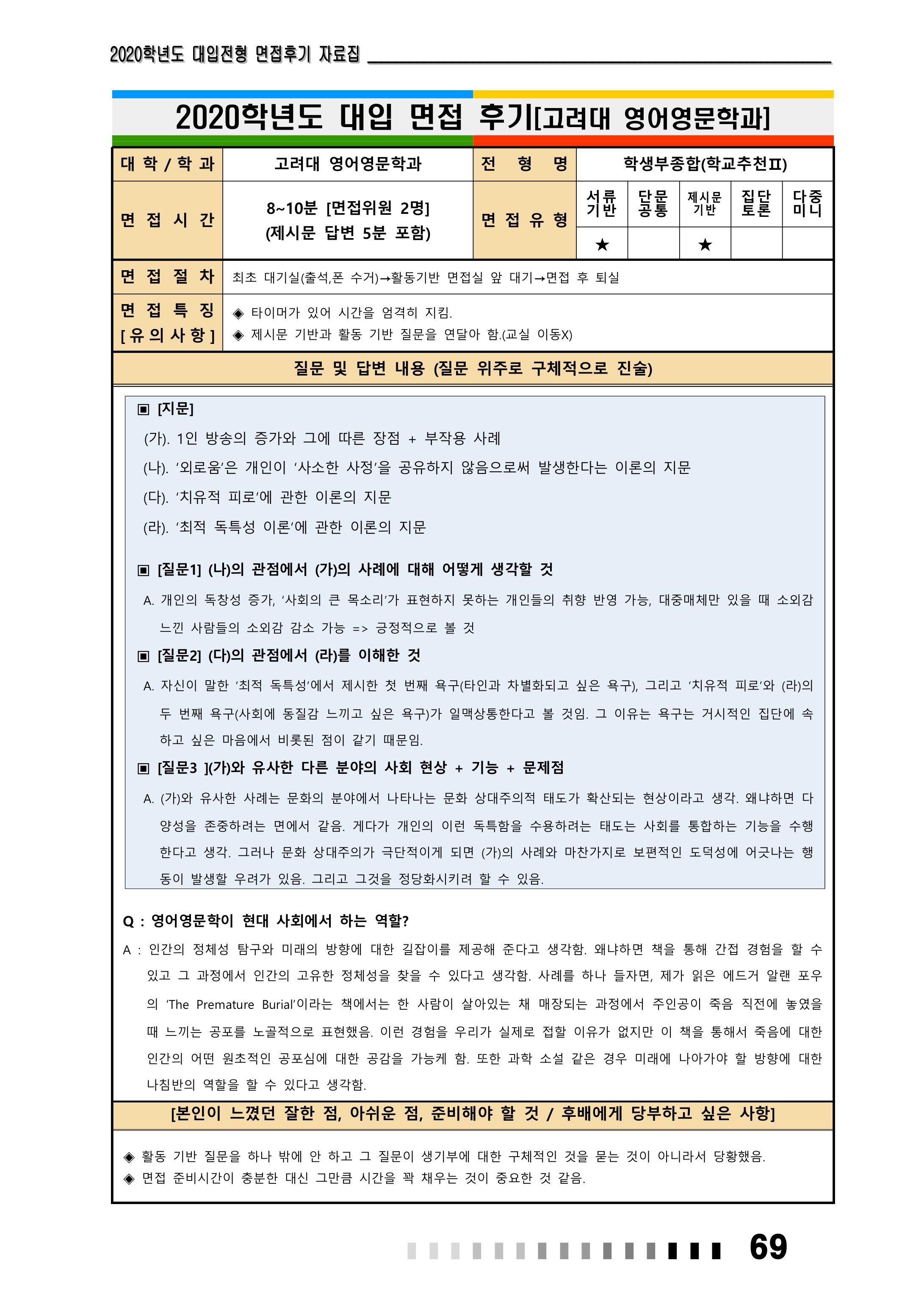 2021학년도 고려대학교 면접 후기54 - 영어영문학과