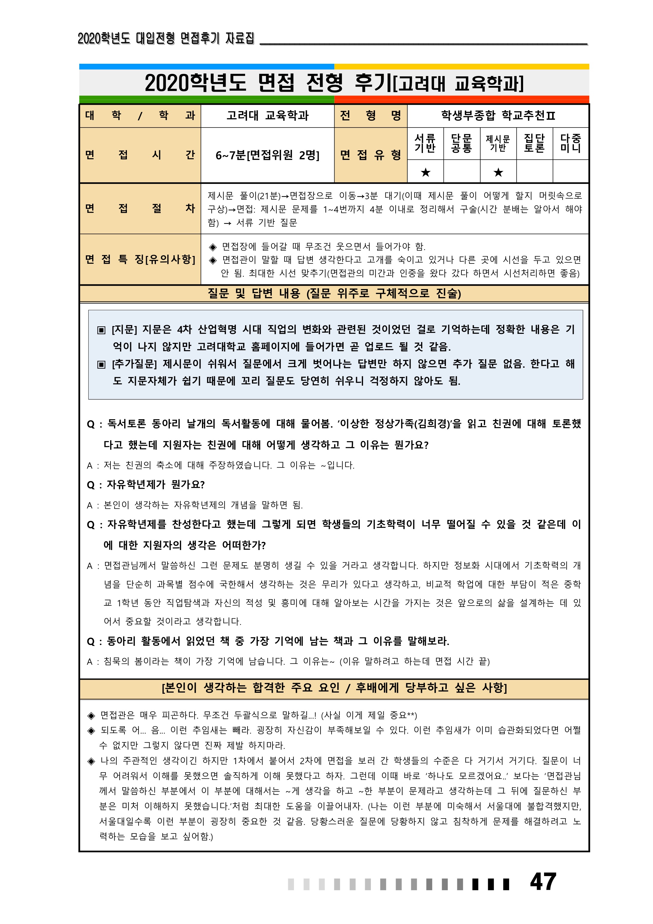 2021학년도 고려대학교 면접 후기45 - 식품자원경제학과 2021학년도 고려대학교 면접 후기46 - 신소재공학부