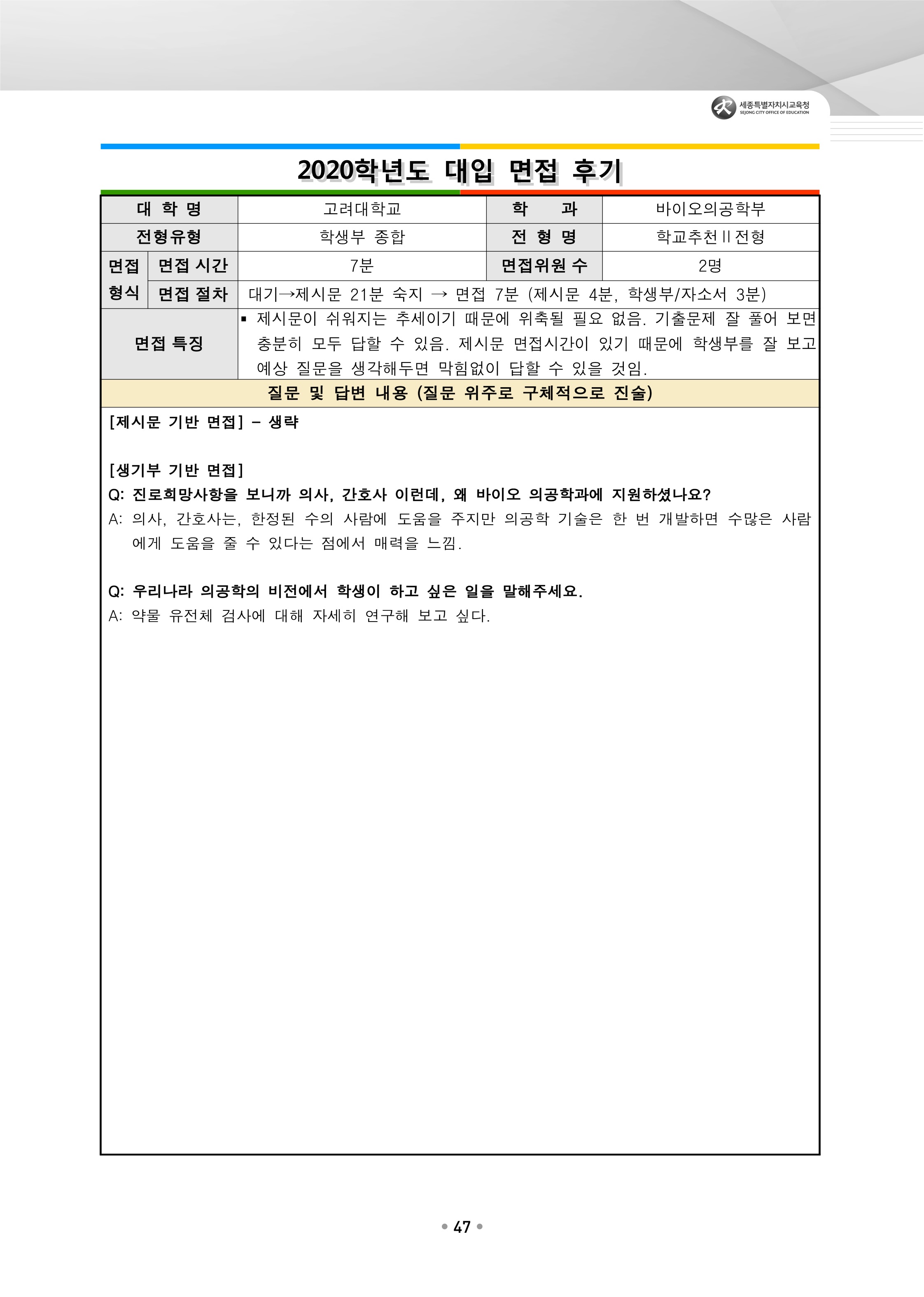2021학년도 고려대학교 면접 후기27 - 바이오의공학부 2021학년도 고려대학교 면접 후기28 - 바이오의공학부