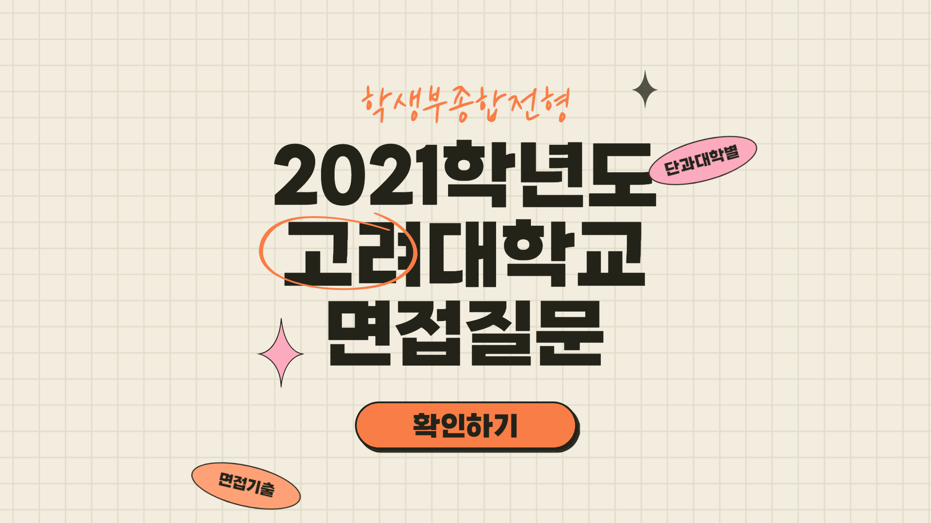 2021학년도 고려대학교 면접 질문 횐님들 안녕하세영. 오늘은 2021학년도 고려대학교 수시 전형에서 출제되었던 면접 질문에 대해 알아볼게영. 고려대학교 수시모집에는 서류기반 면접과 제시문 기반 면접이 있는데영, 이번 포스팅에서는 서류기반 면접 질문을 위주로 살펴볼 거예영. 후기에 2020학년도와 2021학년도 면접이 섞여있어서영, 제시문 기반 면접은 문제 위주로 보시고 서류 기반 면접에서 과별로 어떤 질문들이 나왔는지 확인해 보시면 되겠어영.💞