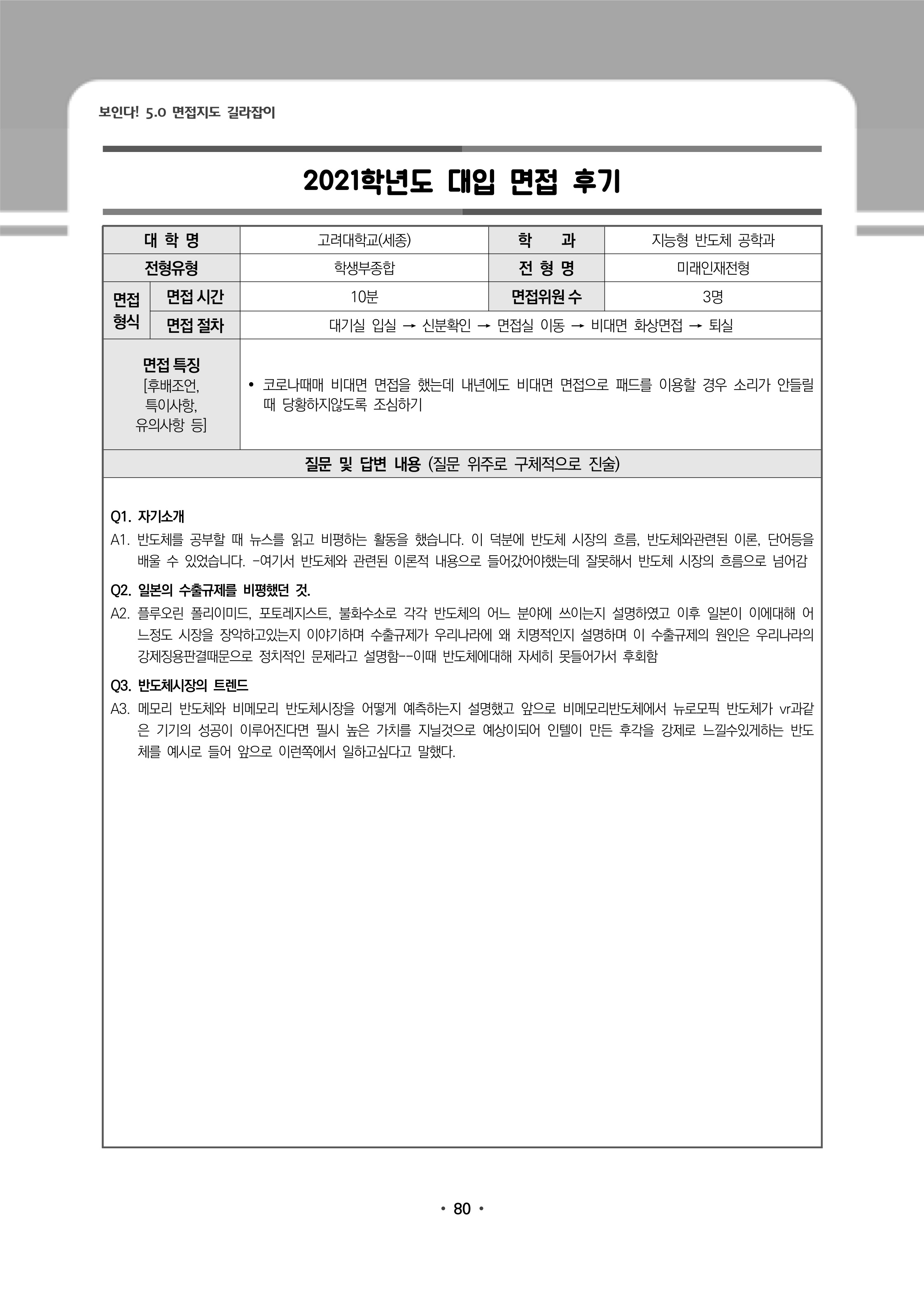 2021학년도 고려대학교 세종캠퍼스 면접 후기3 - 지능형반도체공학과 2021학년도 고려대학교 세종캠퍼스 면접 후기4 - 통일외교안보전공