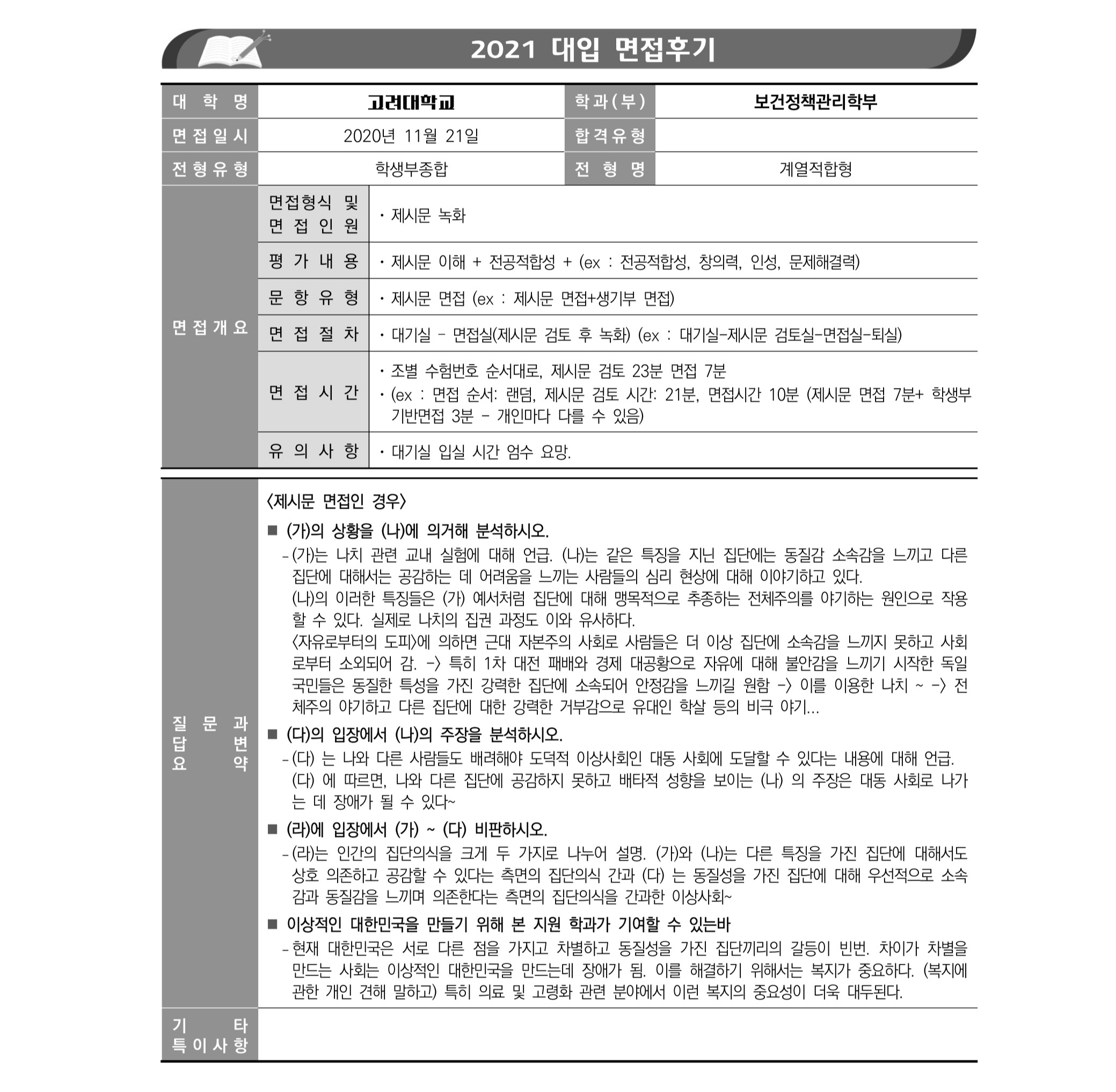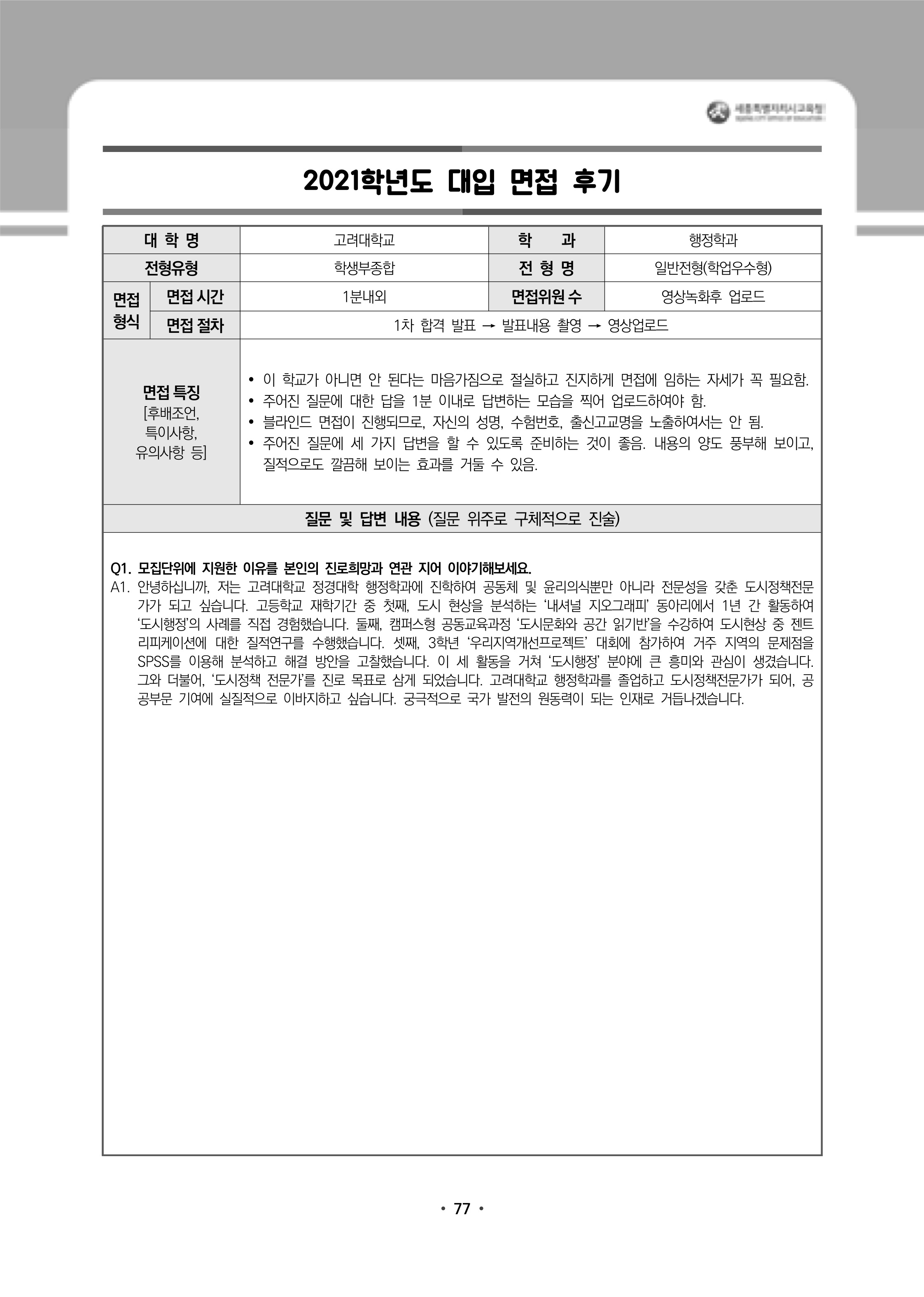 2021학년도 고려대학교 면접 후기71 - 행정학과 2021학년도 고려대학교 면접 후기72 - 행정학과