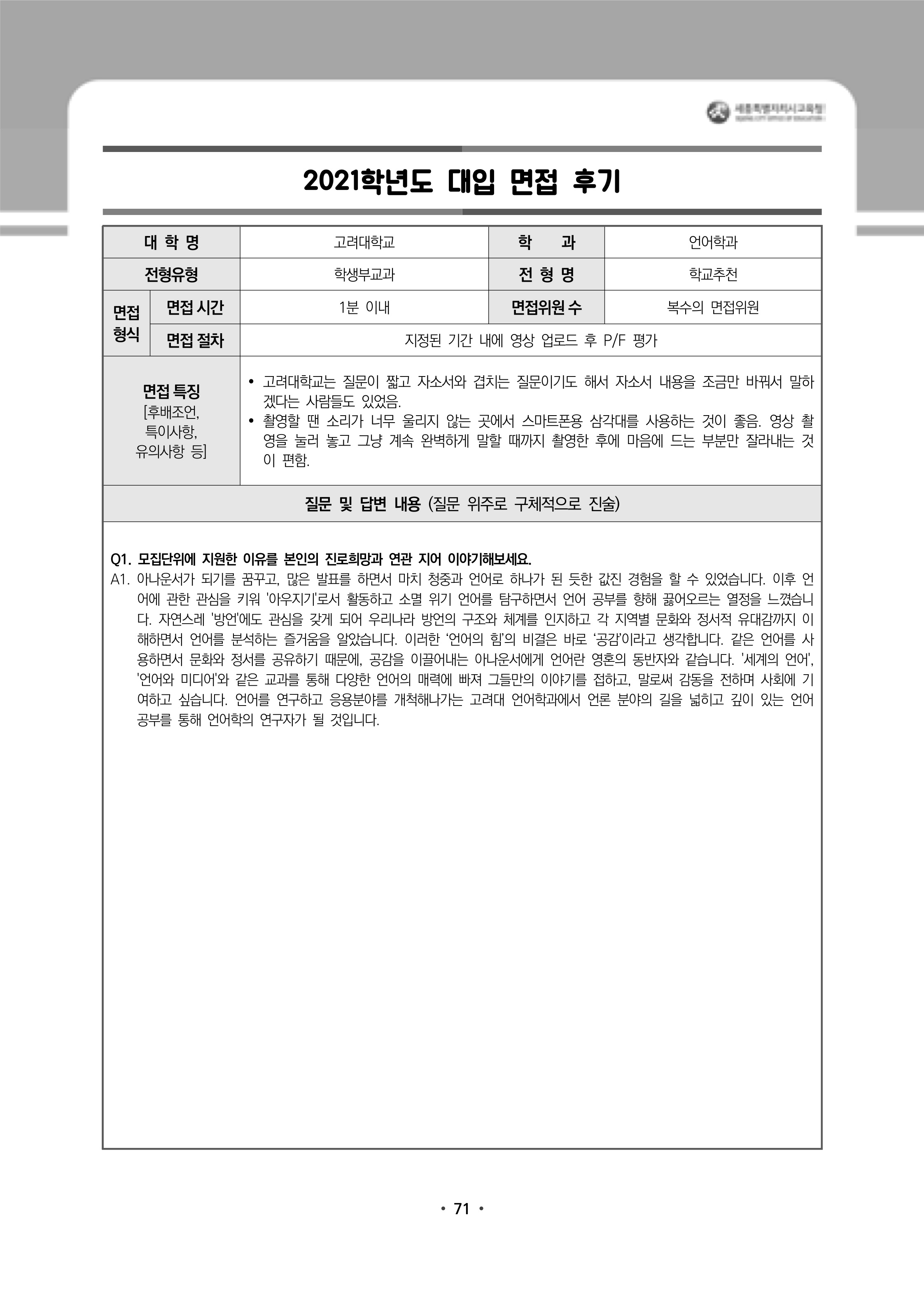 2021학년도 고려대학교 면접 후기48 - 심리학부 2021학년도 고려대학교 면접 후기49 - 언어학과