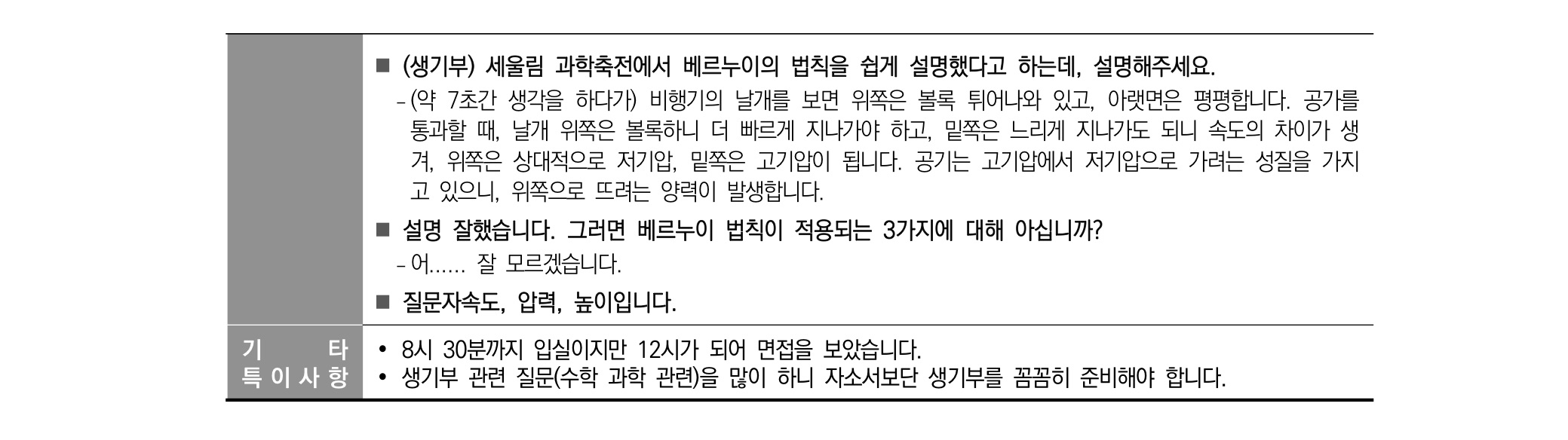 - 제출 서류(학교생활기록부, 자기소개서 등)을 기반으로 진행하는 면접입니다. 제출 서류에 기재된 모든 내용에 대해 질문할 수 있습니다.