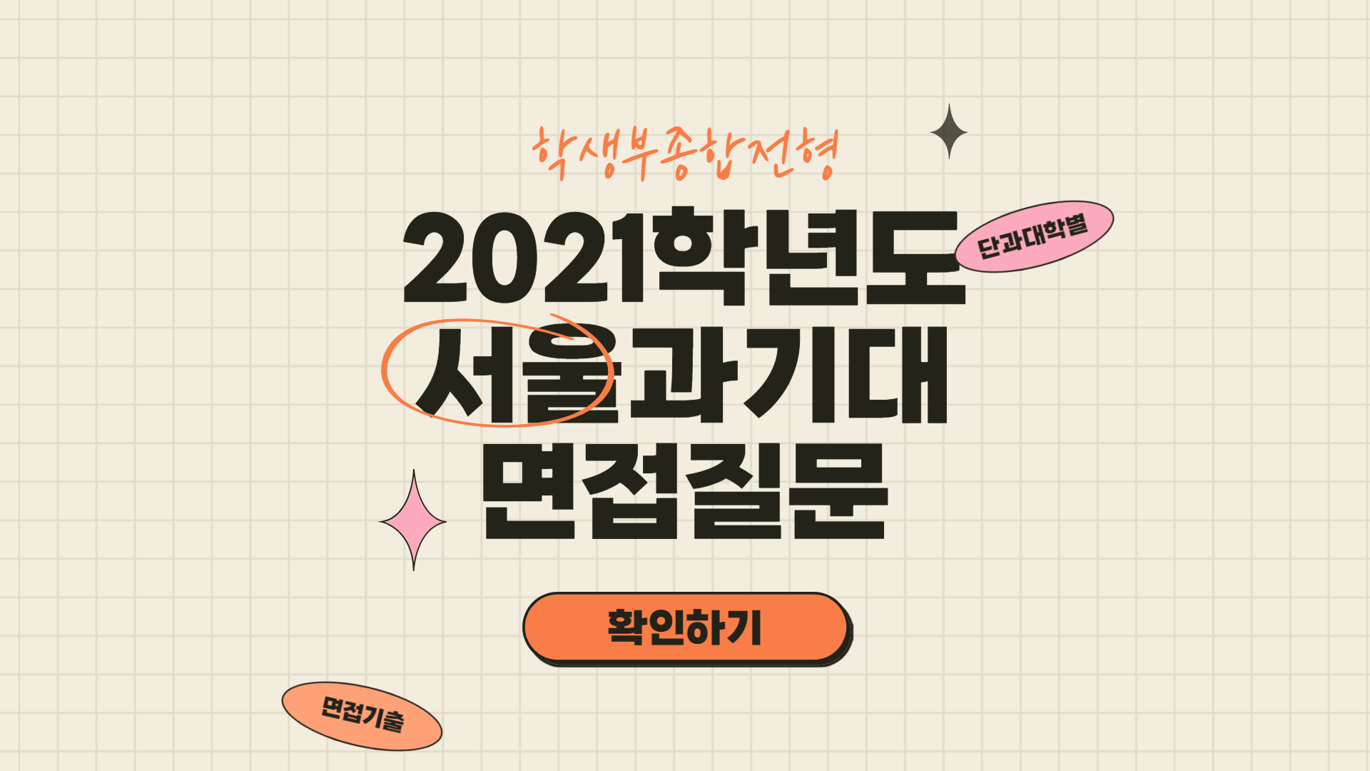 2021학년도 서울과학기술대학교 면접 질문 횐님들 안녕하세영! 오늘은 2021학년도 서울과학기술대학교 수시전형에서 출제된 면접 질문에 대해서 알아보려고 해영. 서울과학기술대학교의 면접 기출을 살펴보니 면접에서 특히 깊이 있는 전공관련 질문이 여러 번 나와영. 따라서 서울과기대를 지원하신 횐님들은 자신의 전공과 관련된 지식을 확실히 공부한 뒤에 면접에 임해야겠지영? 과별로 나온 질문과 실제 면접을 본 선배들의 후기를 정리해두었으니 참고하시길 바라영.🎁