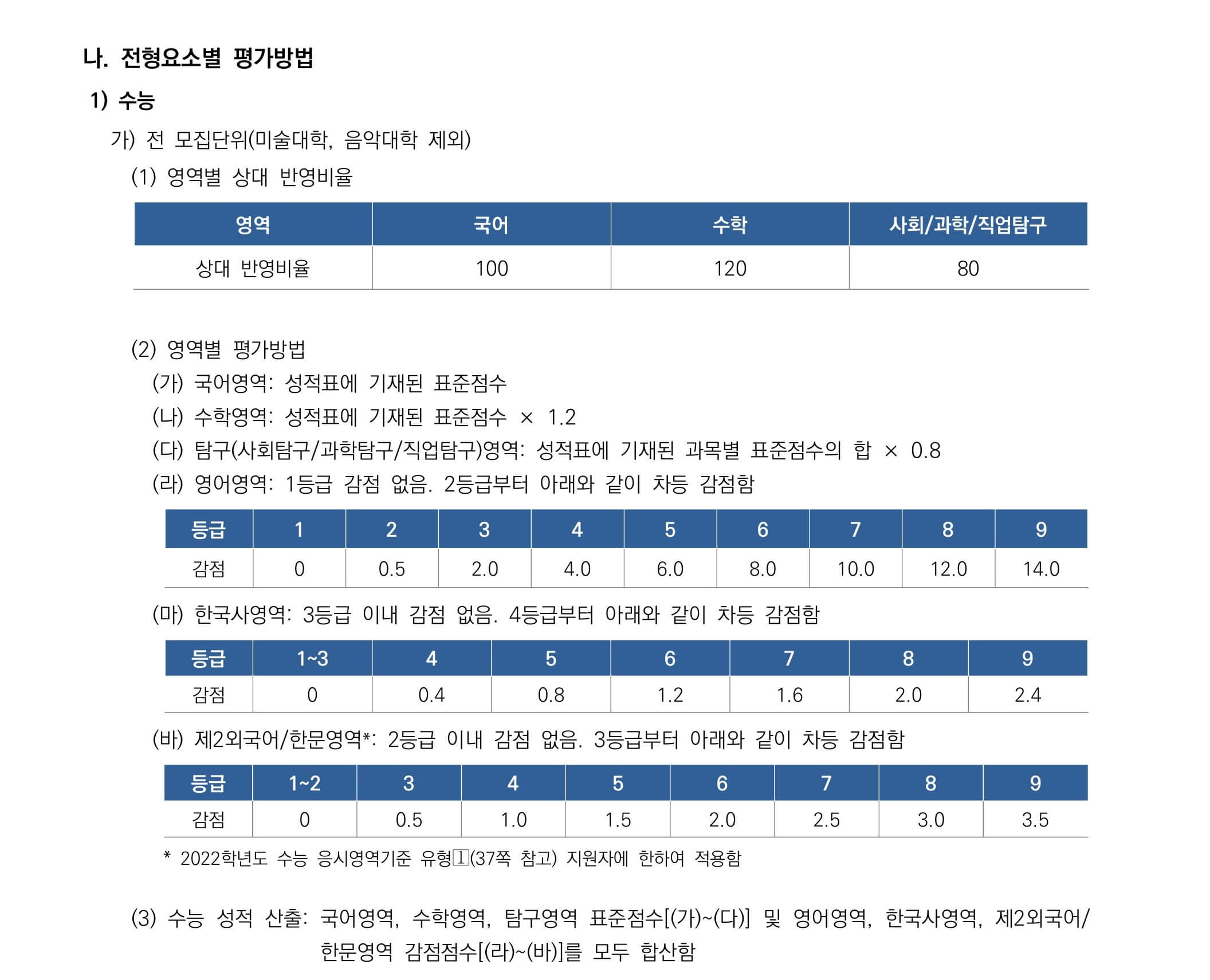 2022학년도 수능위주전형(일반전형) 수능 평가방법