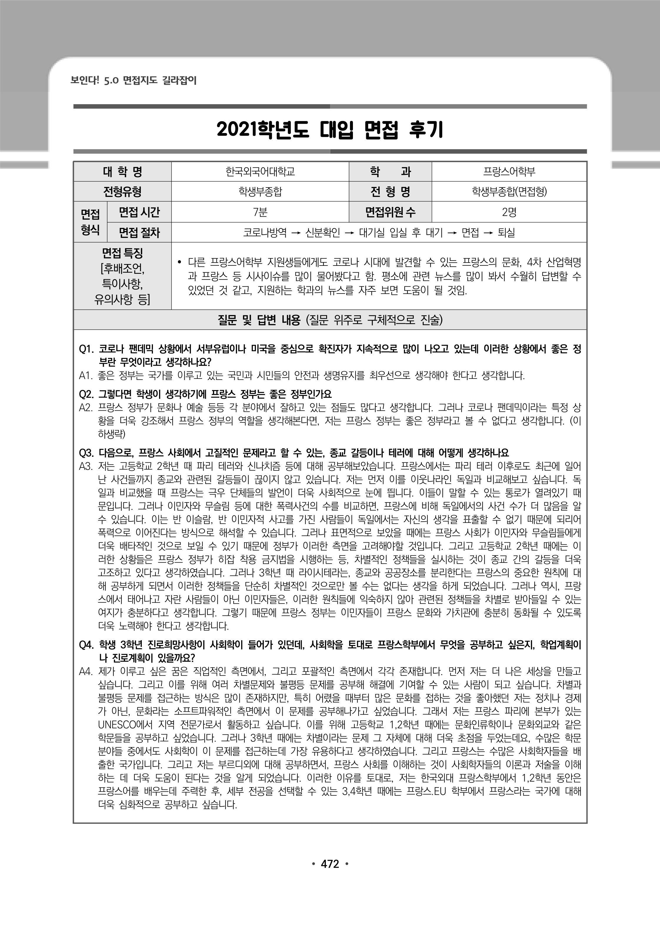 2021학년도 한국외국어대학교 면접 후기38 - 프랑스어학부 2021학년도 한국외국어대학교 면접 후기39 - 프랑스어학부