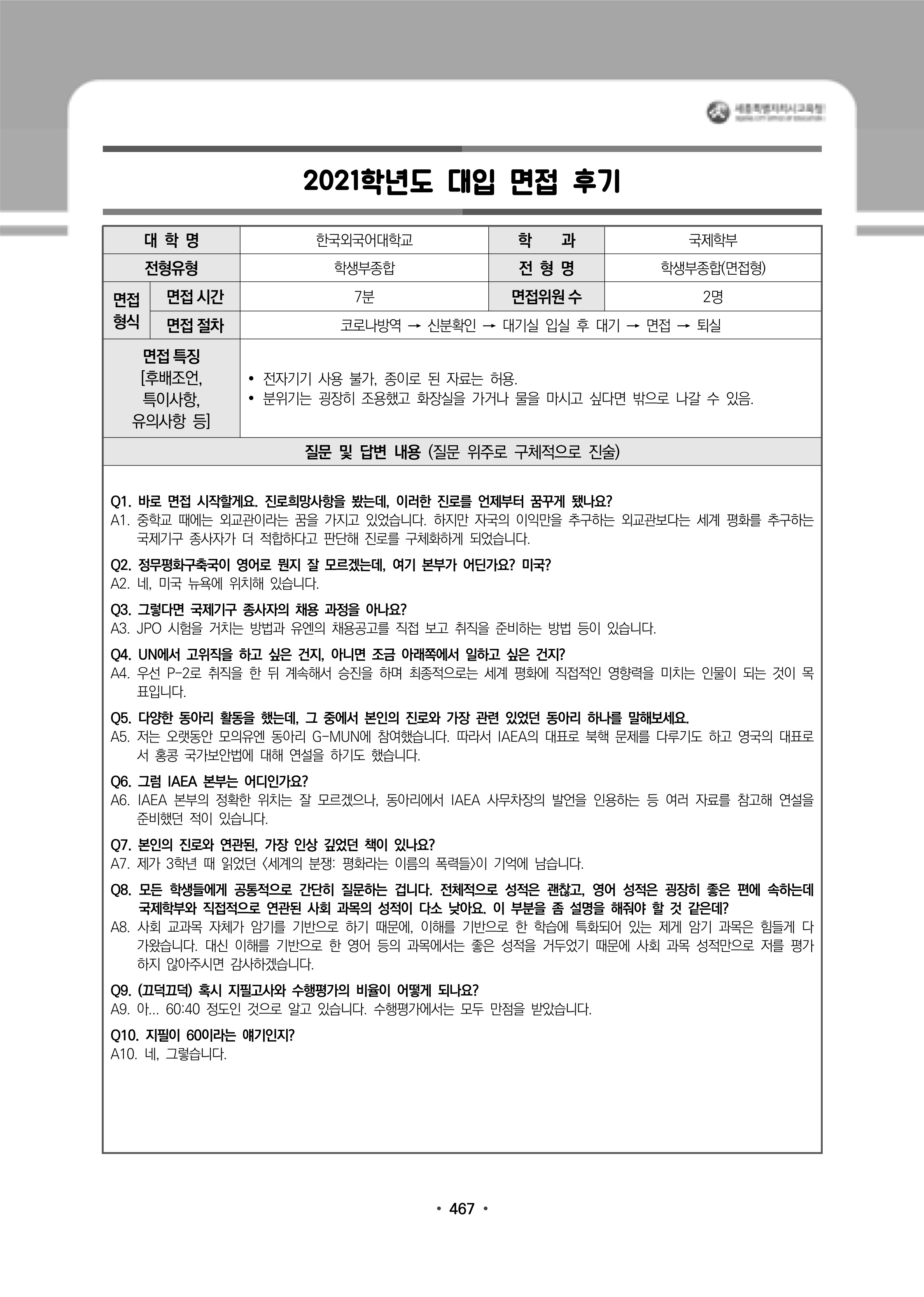 2021학년도 한국외국어대학교 면접 전형 분석