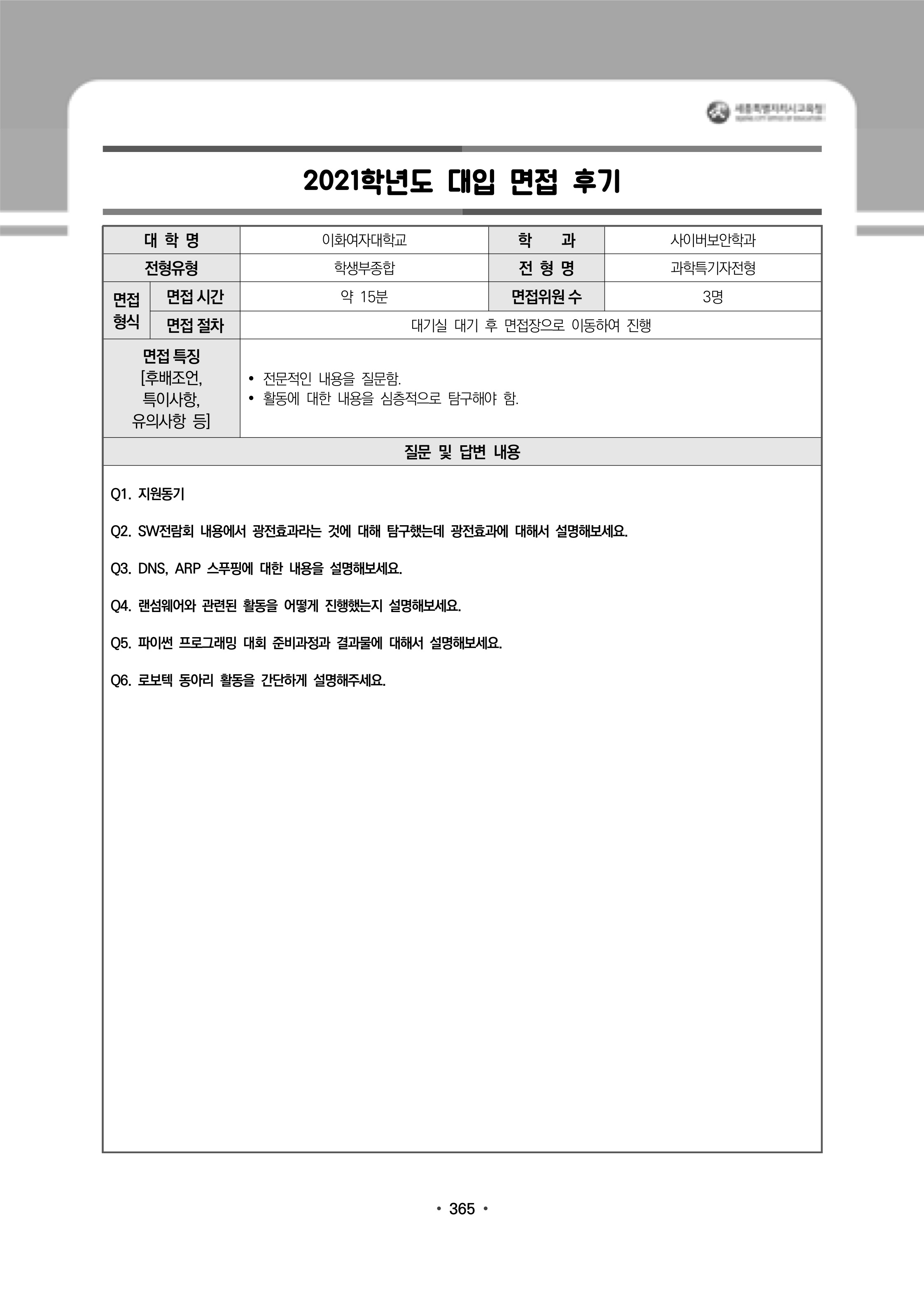 2021학년도 이화여자대학교 면접 후기15 - 사이버보안학과 2021학년도 이화여자대학교 면접 후기15 - 사회과교육과
