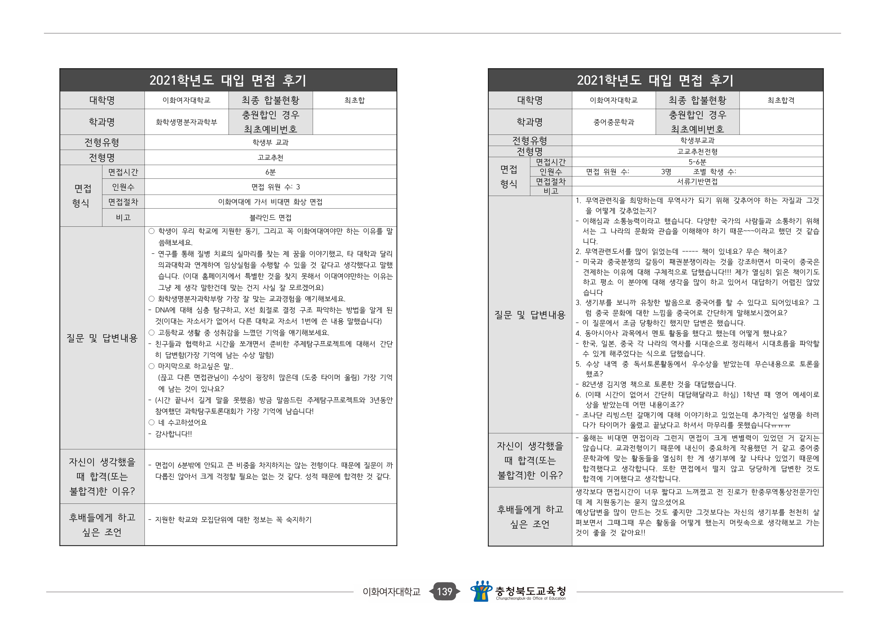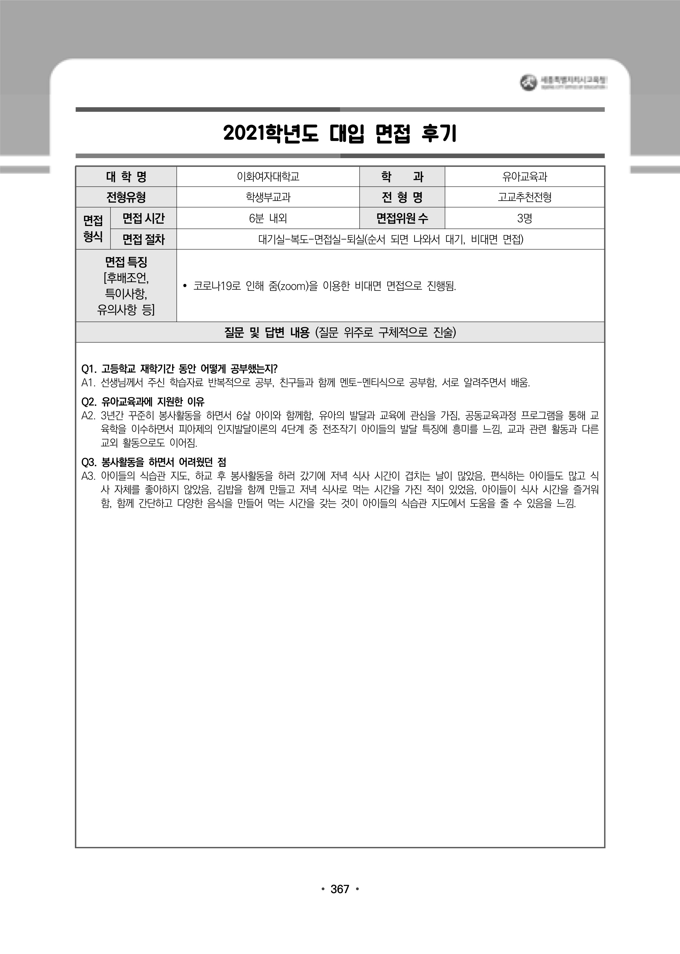2021학년도 이화여자대학교 면접 후기16 - 사회학과 2021학년도 이화여자대학교 면접 후기17 - 식품공학전공