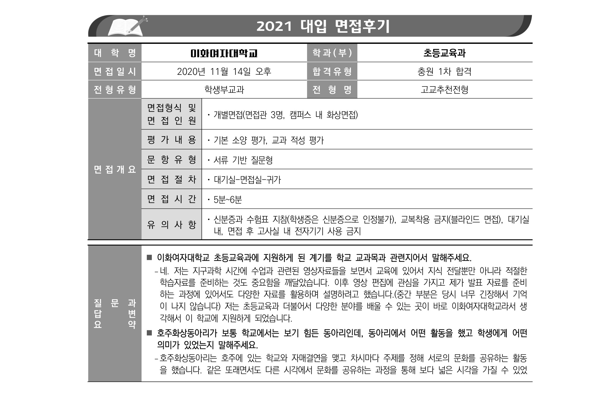 2021학년도 이화여자대학교 면접 후기30 - 초등교육과