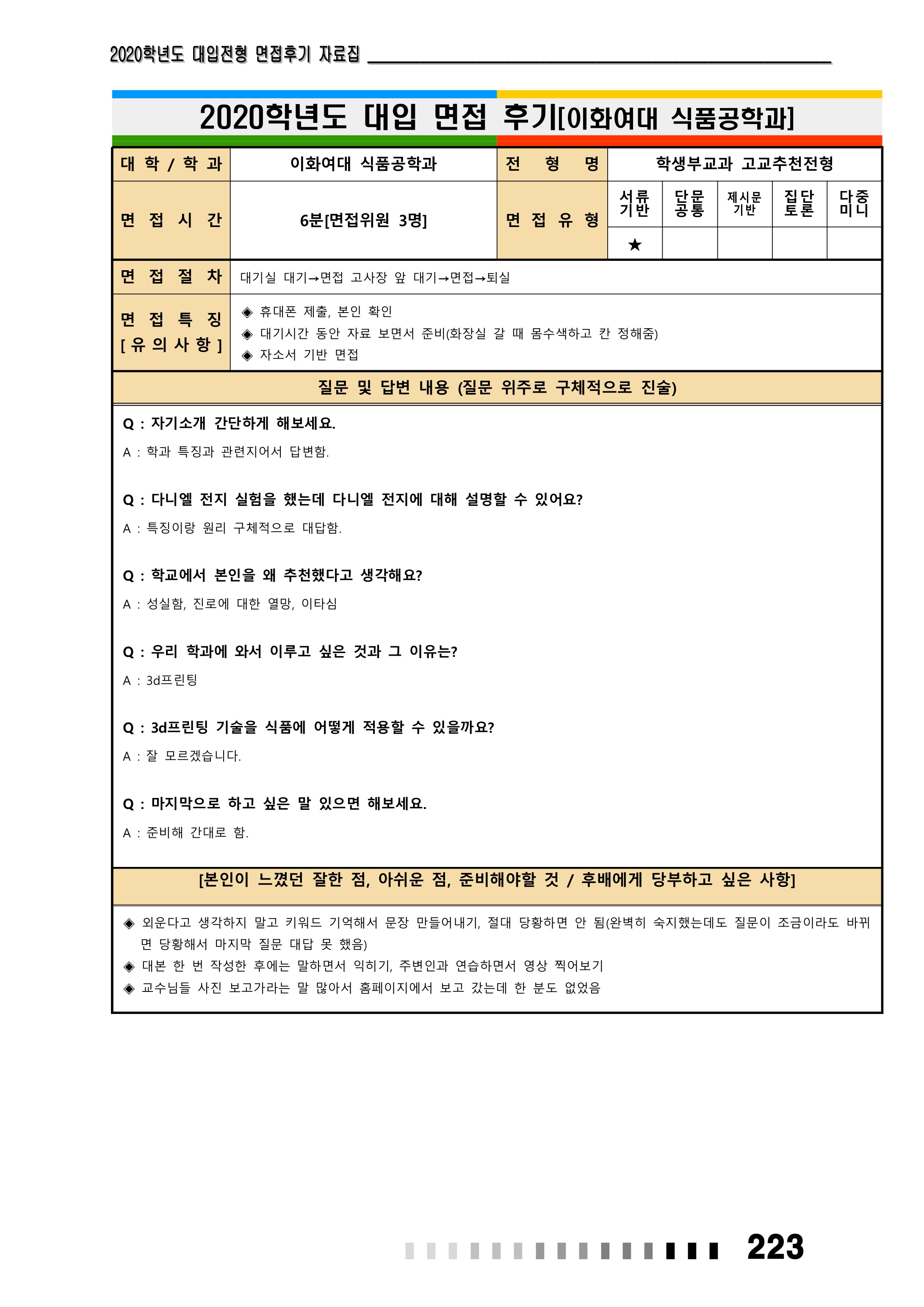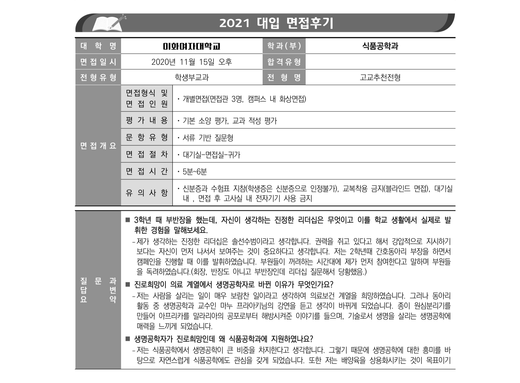 2021학년도 이화여자대학교 면접 후기19 - 식품공학전공