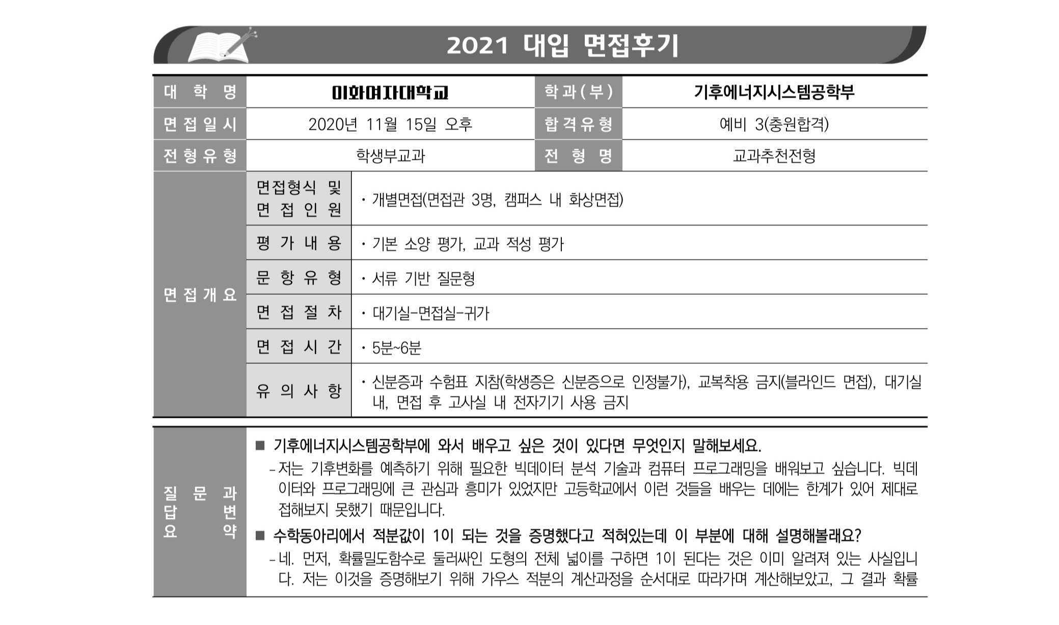 2021학년도 이화여자대학교 면접 후기14 - 기후에너지시스템공학부