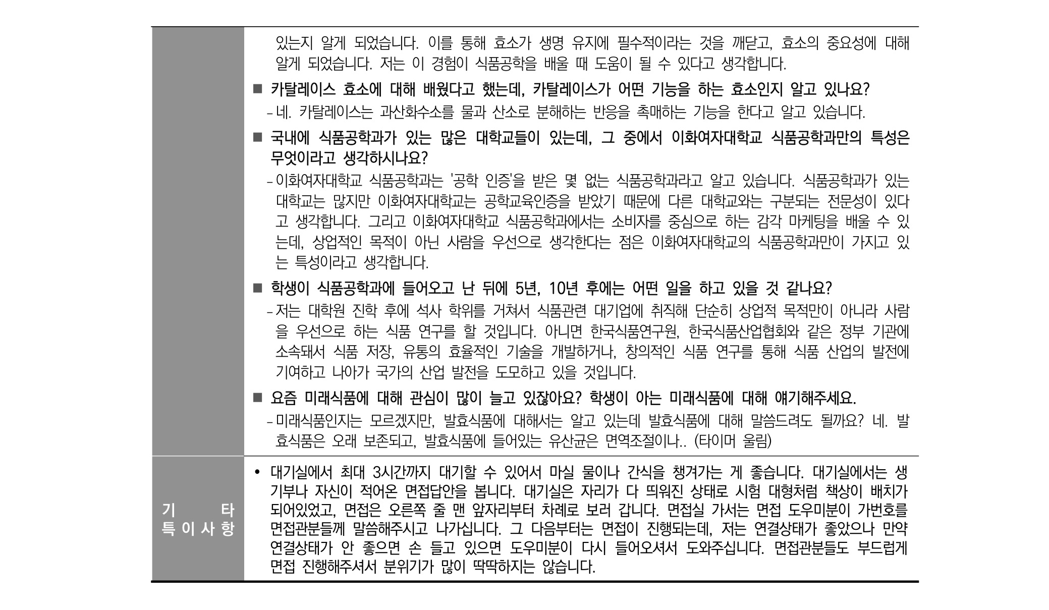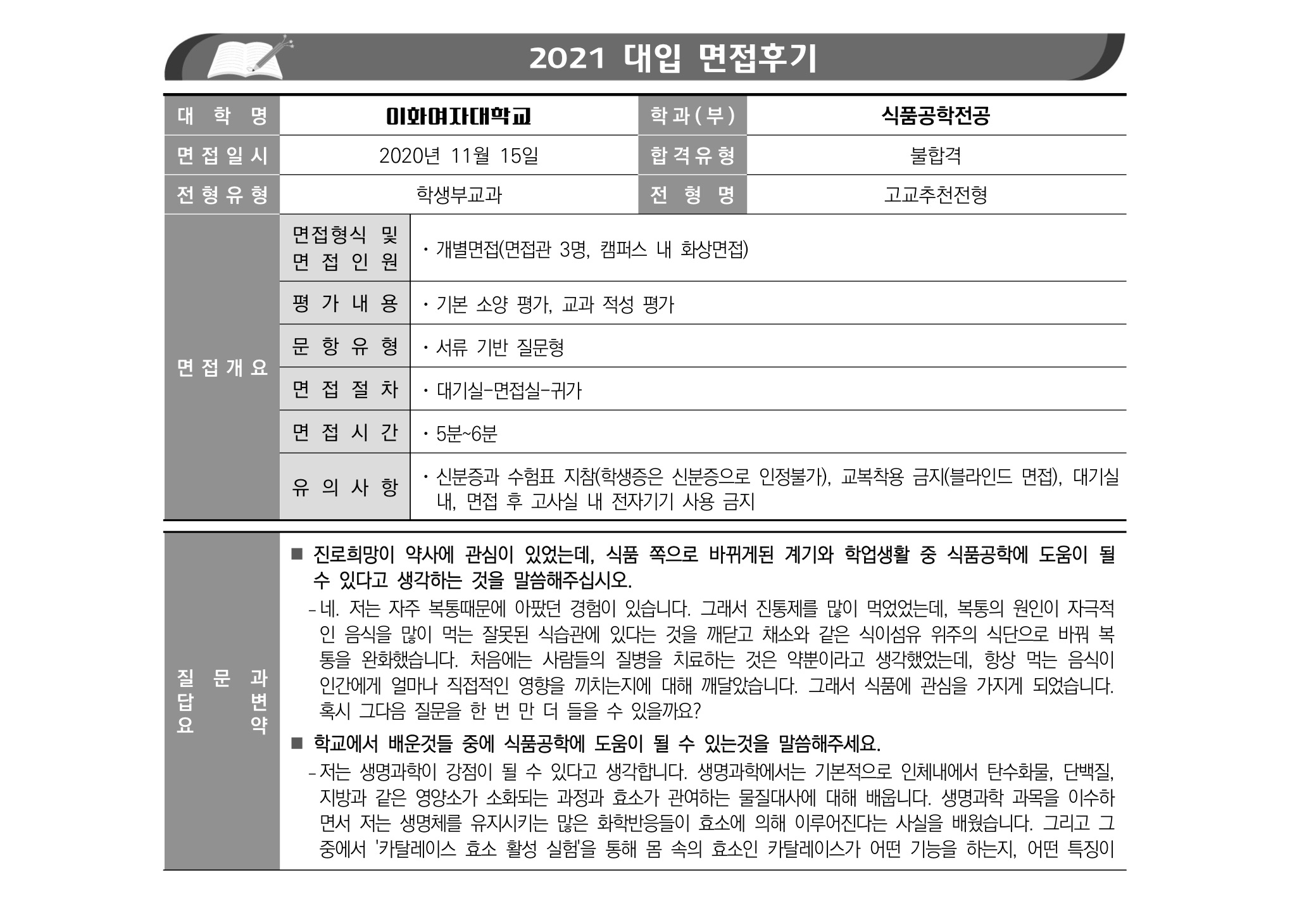 2021학년도 이화여자대학교 면접 후기18 - 식품공학전공